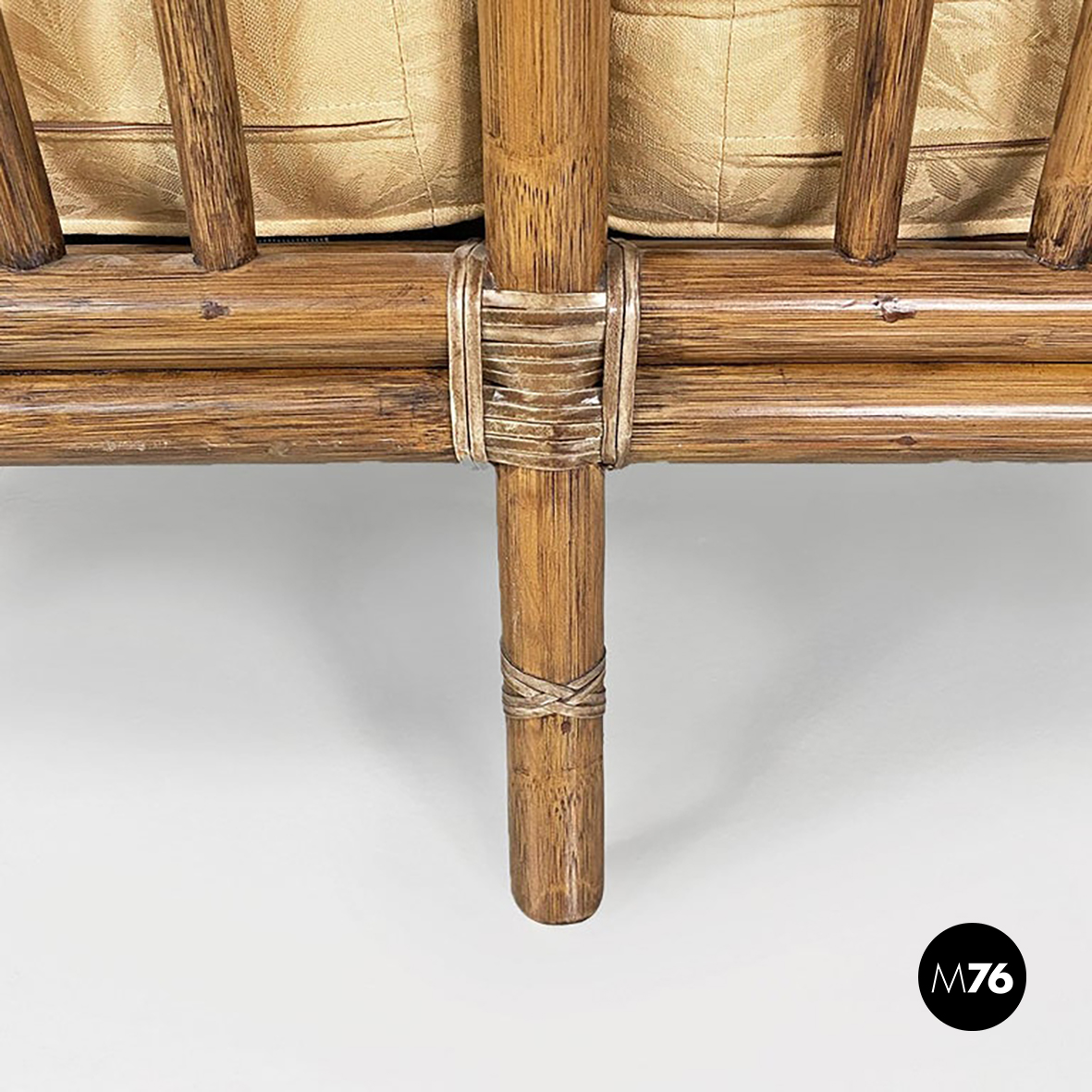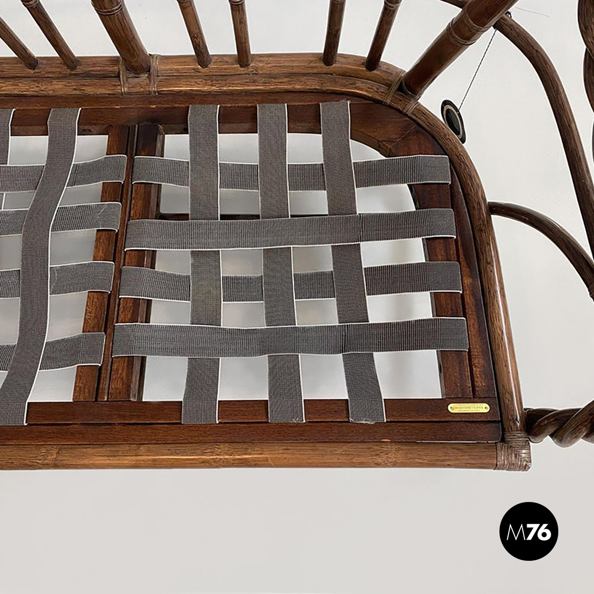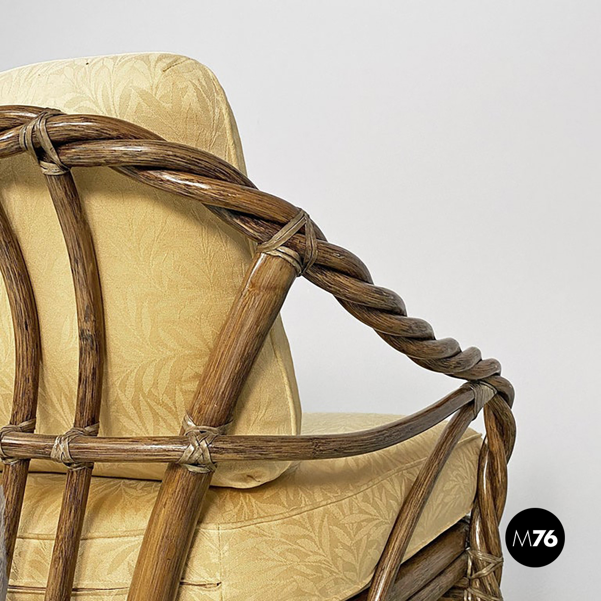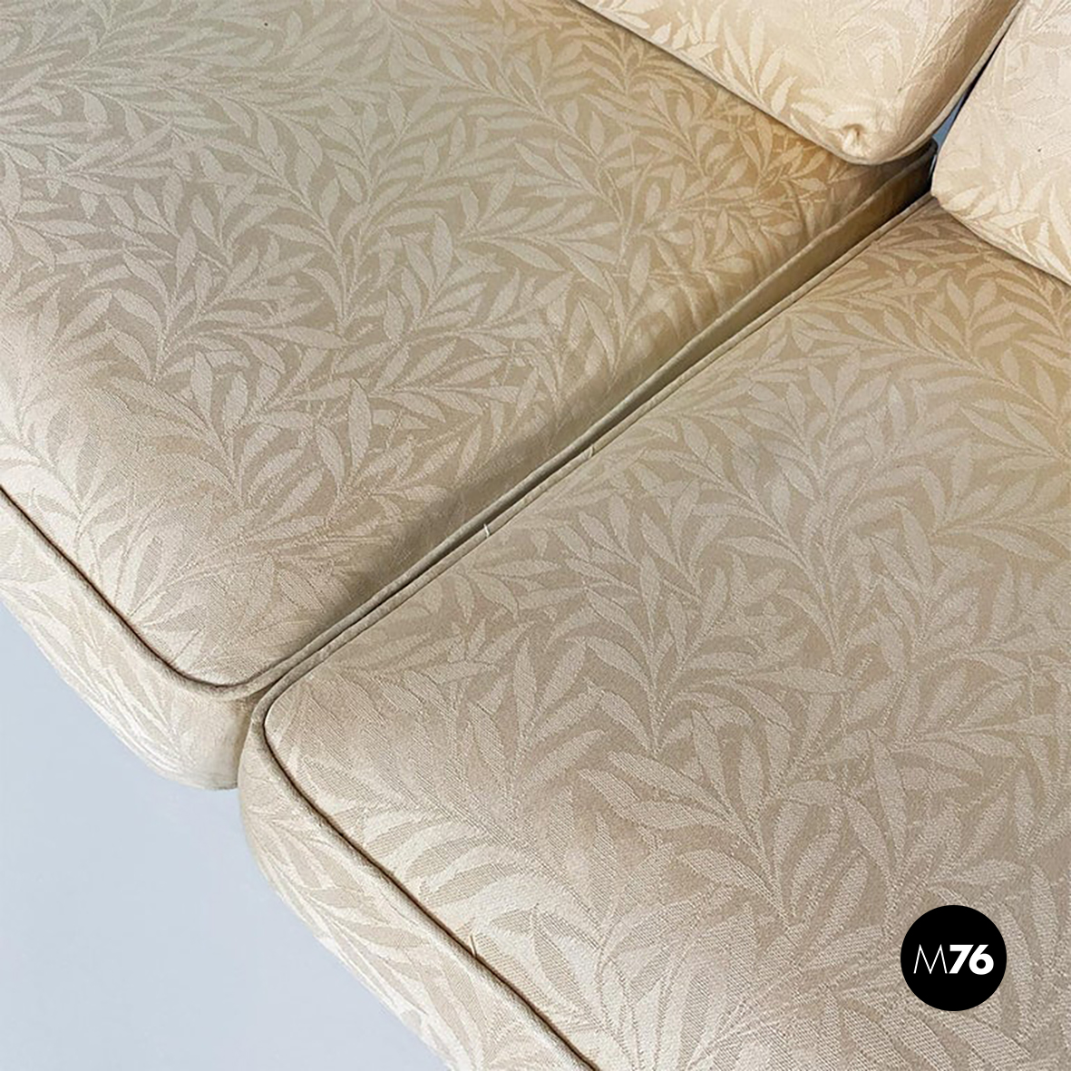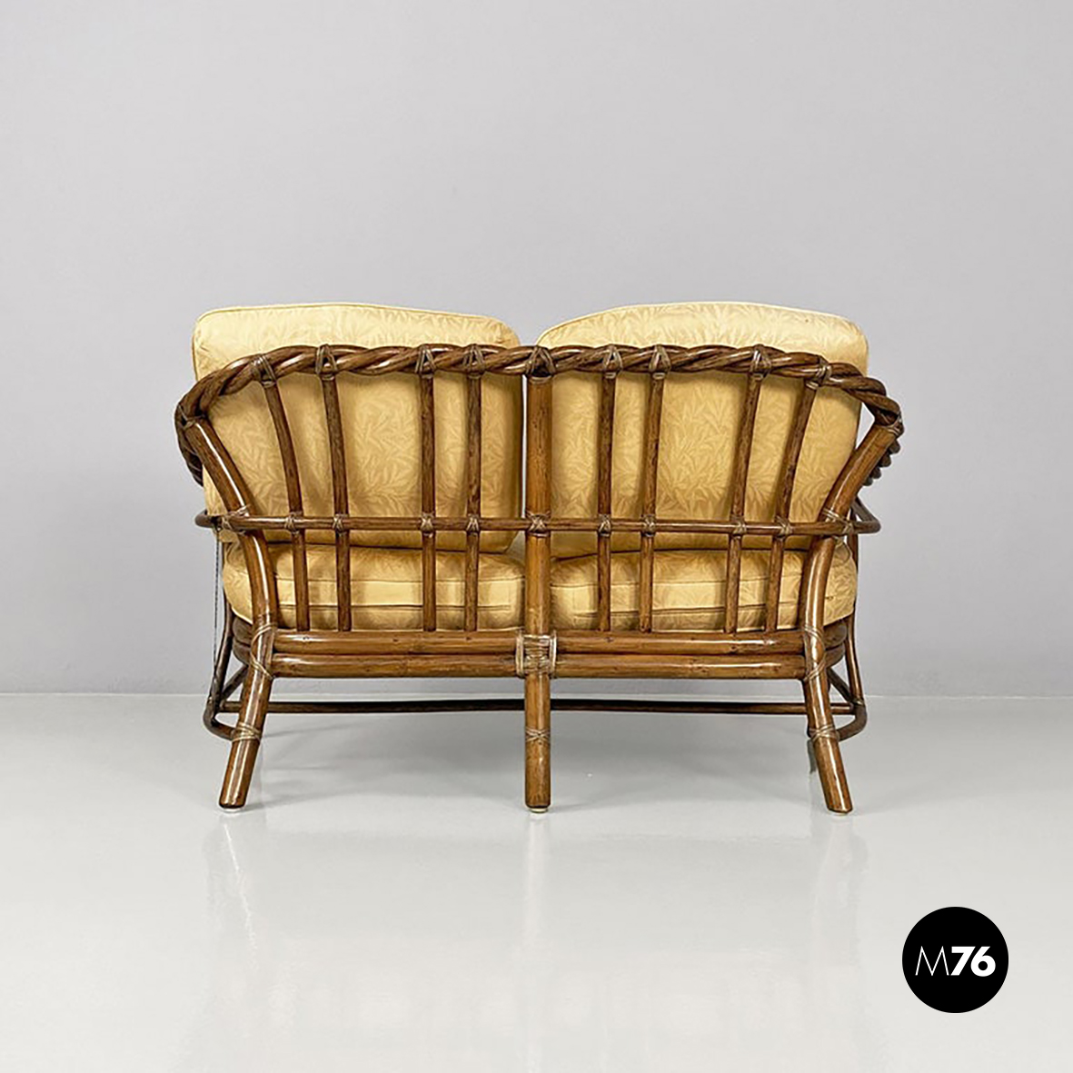 Divano a due posti con seduta e schienale composti da cuscini imbottiti e rivestiti in tessuto beige con motivi floreali. La struttura, i braccioli e le zampe sono in rattan intrecciato con dettagli in cuoio. Adatto ad anche a uso esterno, come in giardino o in veranda.