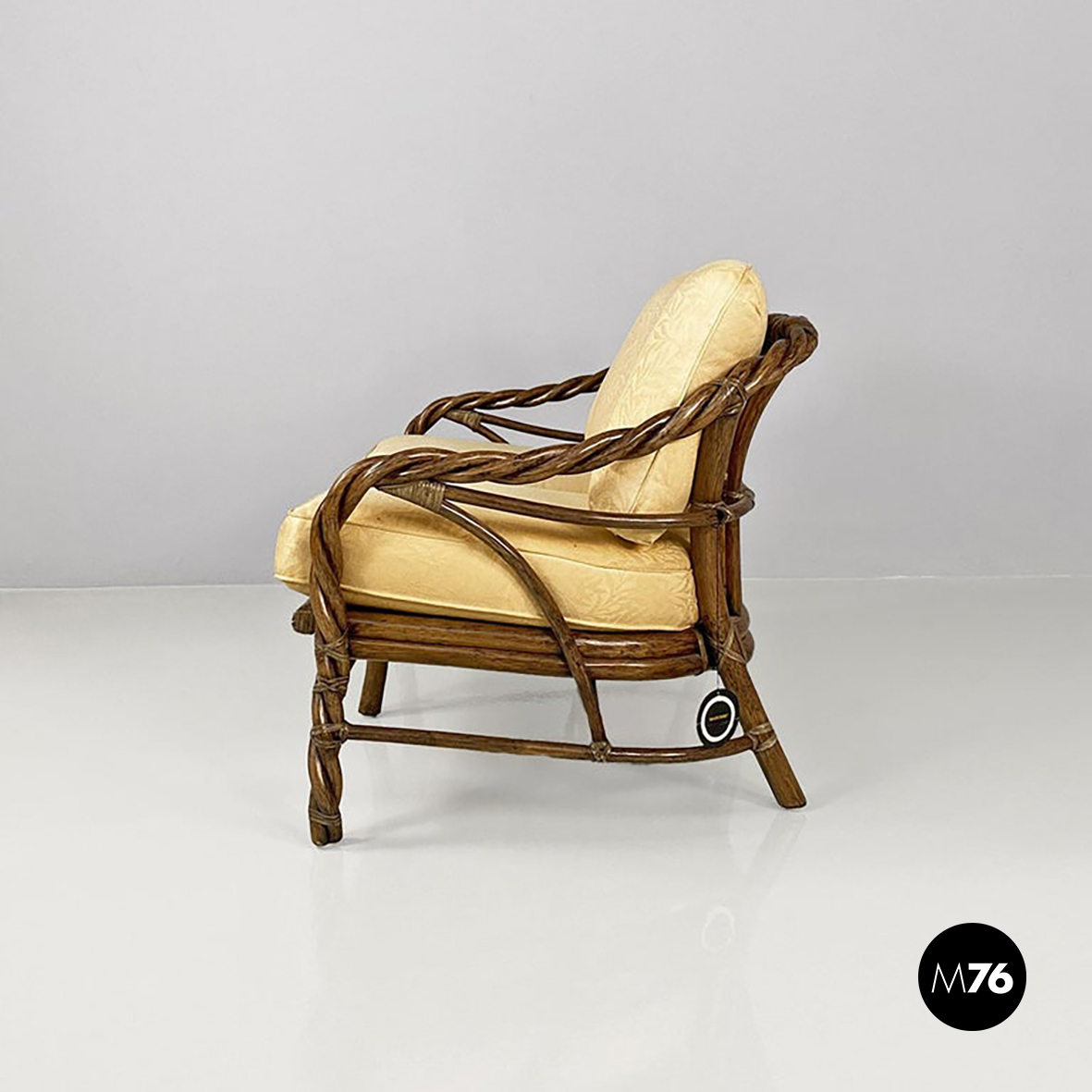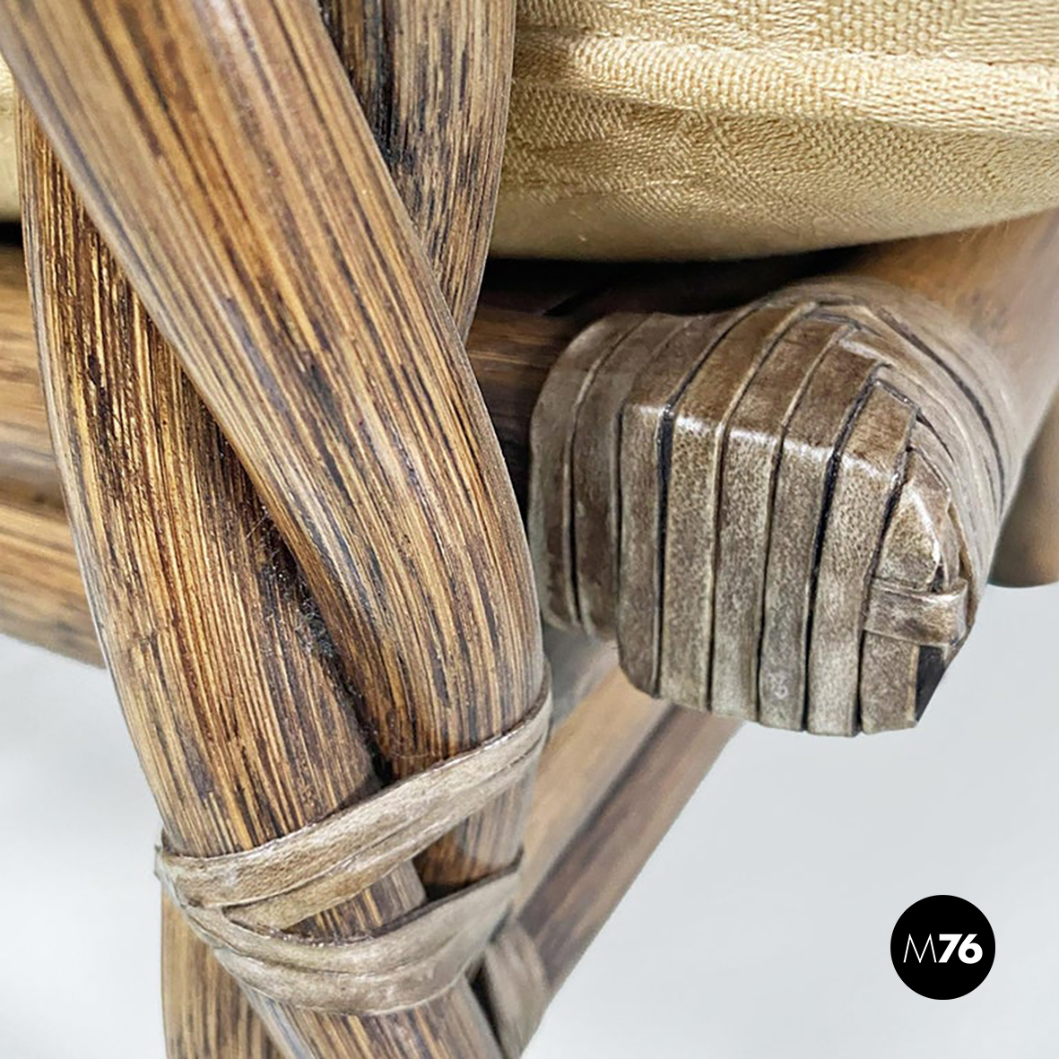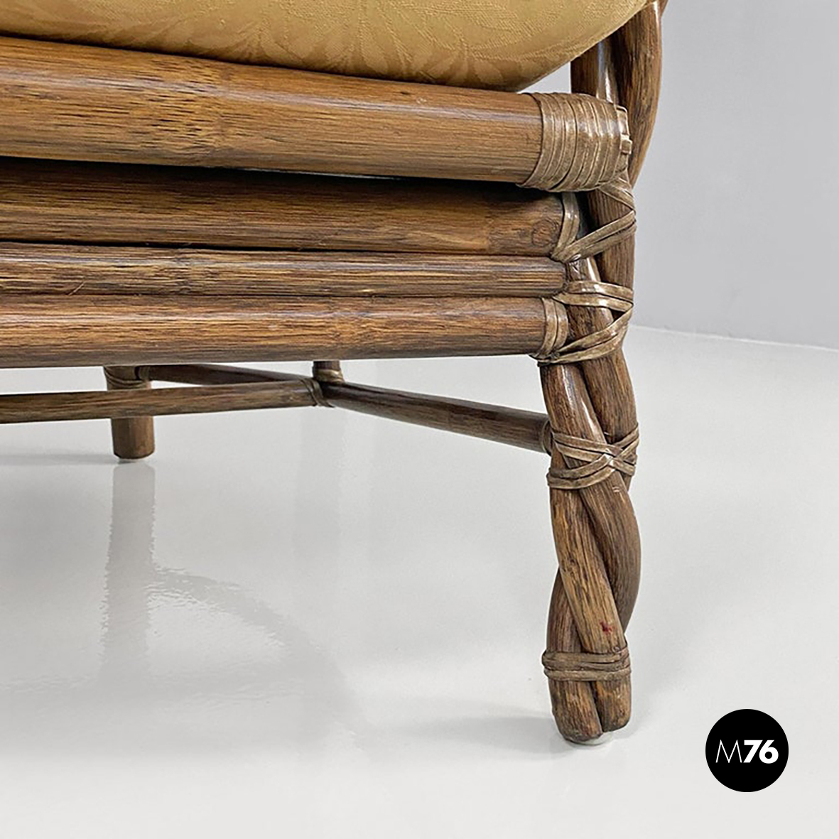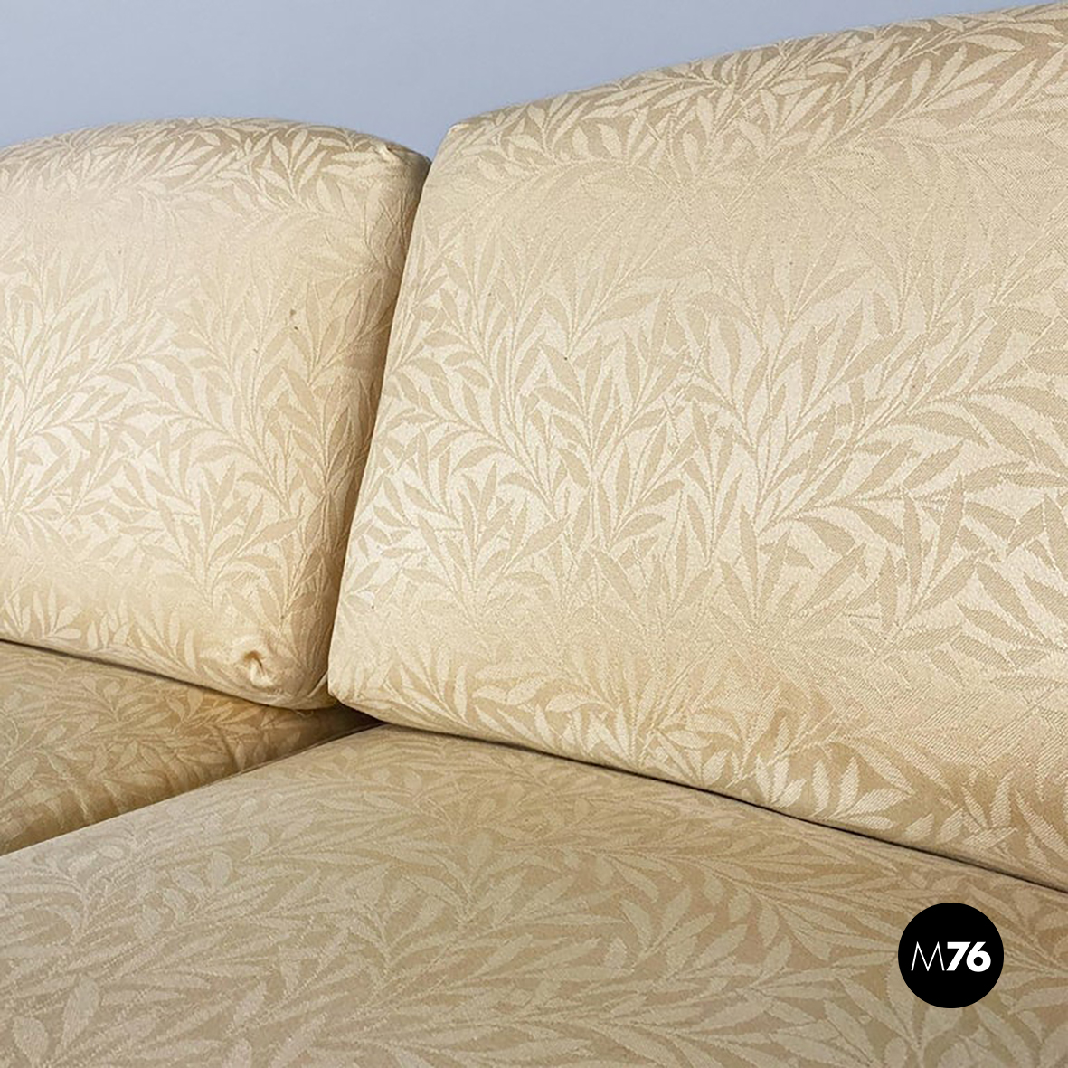 Divano a due posti con seduta e schienale composti da cuscini imbottiti e rivestiti in tessuto beige con motivi floreali. La struttura, i braccioli e le zampe sono in rattan intrecciato con dettagli in cuoio. Adatto ad anche a uso esterno, come in giardino o in veranda.