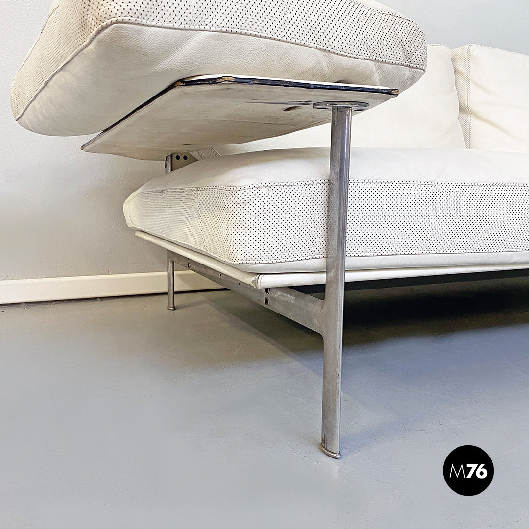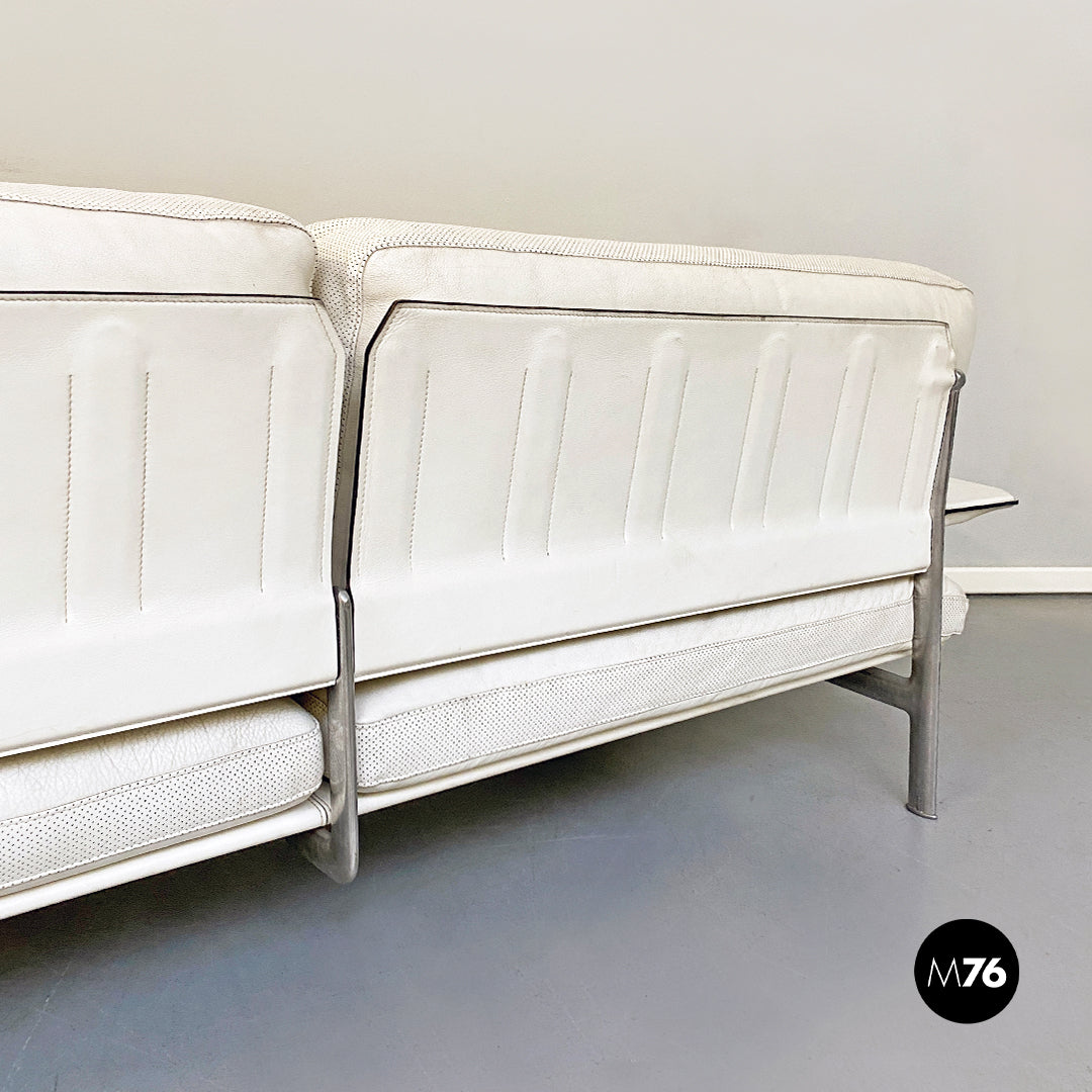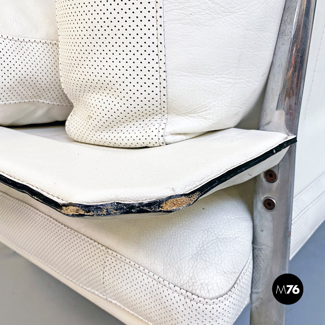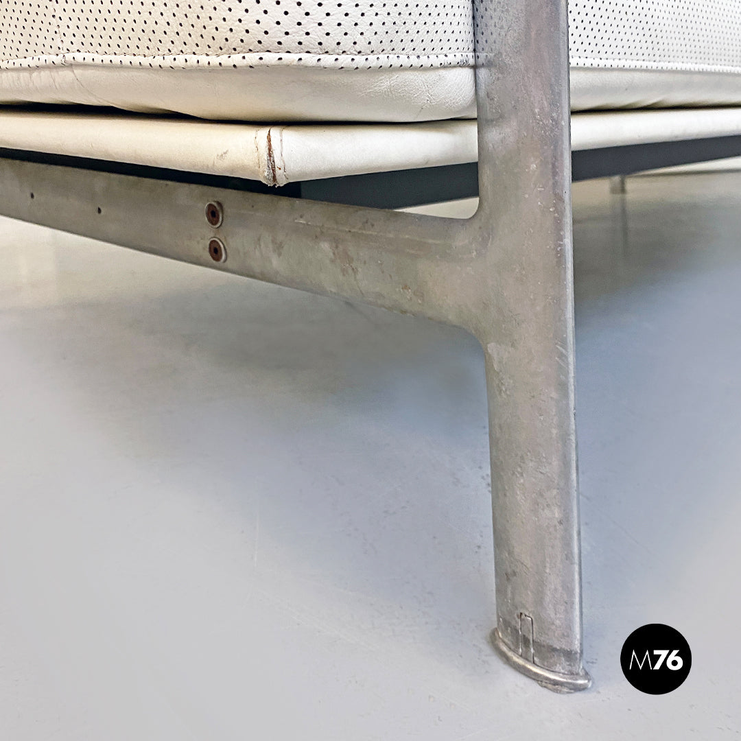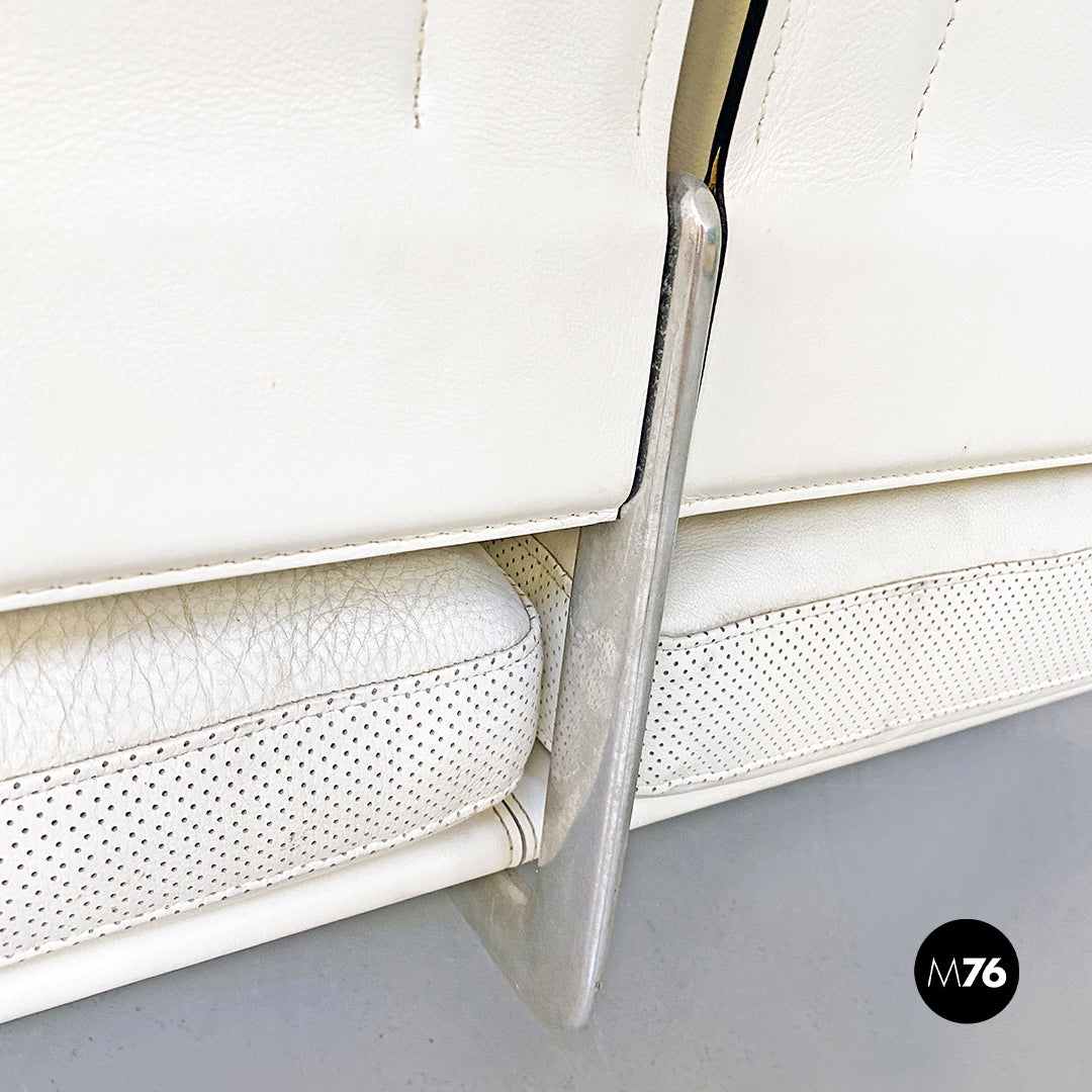 Divano tre posti modello Diesis con braccioli con struttura in alluminio e cuscini imbottiti e rivesititi in pelle bianca dell’epoca ancora perfetta.