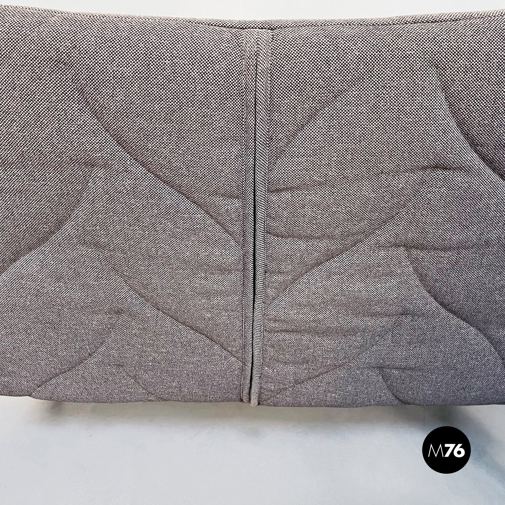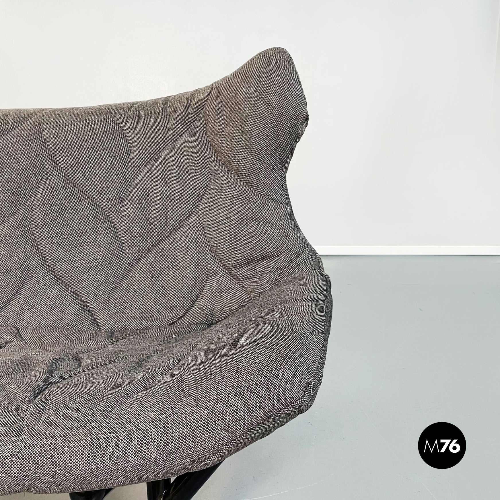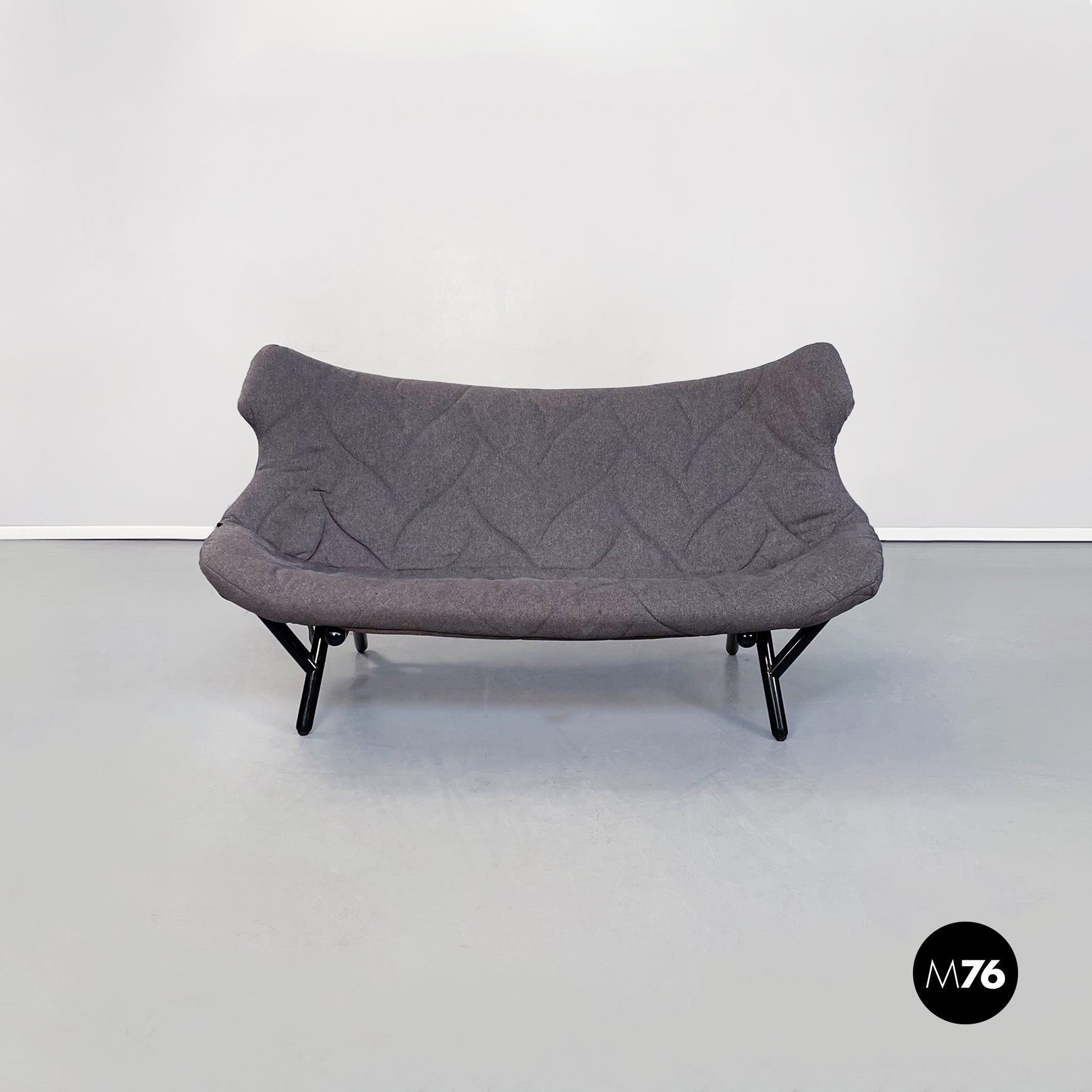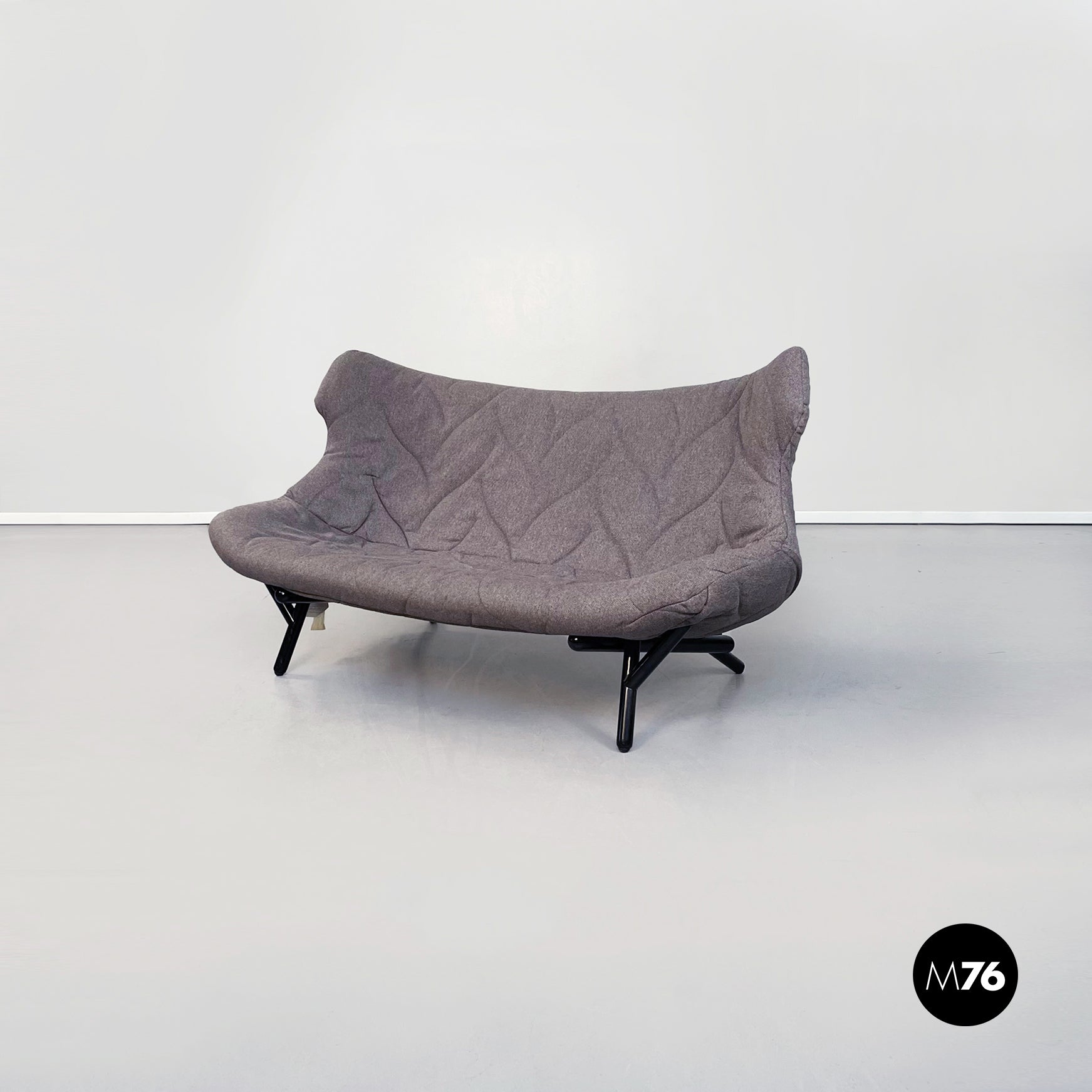 Divano modello Foliage a due posti con struttura tubolare in ferro verniciato nero seduta e schienale imbottiti in schiuma poliuretanica e rivestita in tessuto grigio su cui sono impunturate delle forme di foglie. Infatti la seduta riprende la forma e l’idea della chioma di un albero.