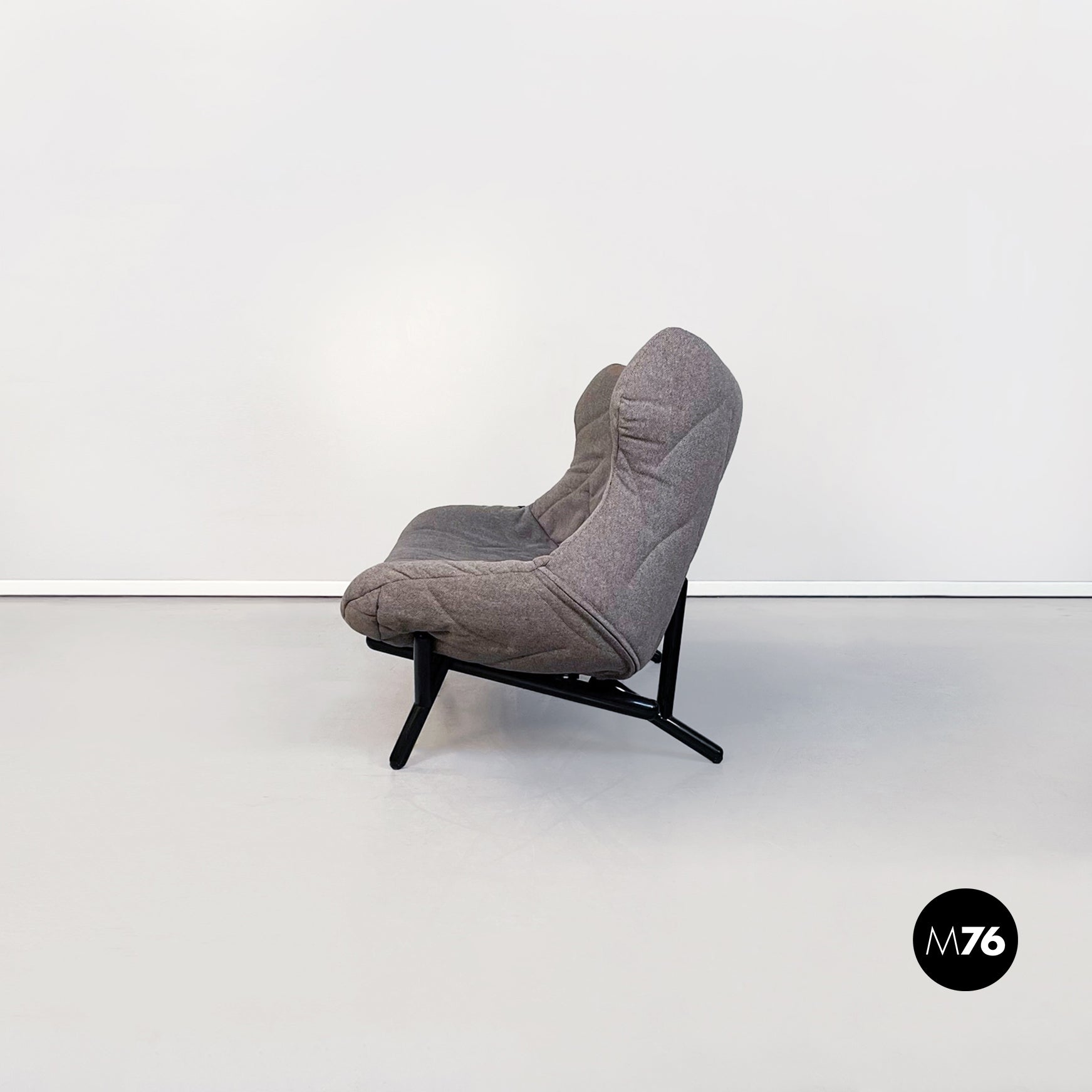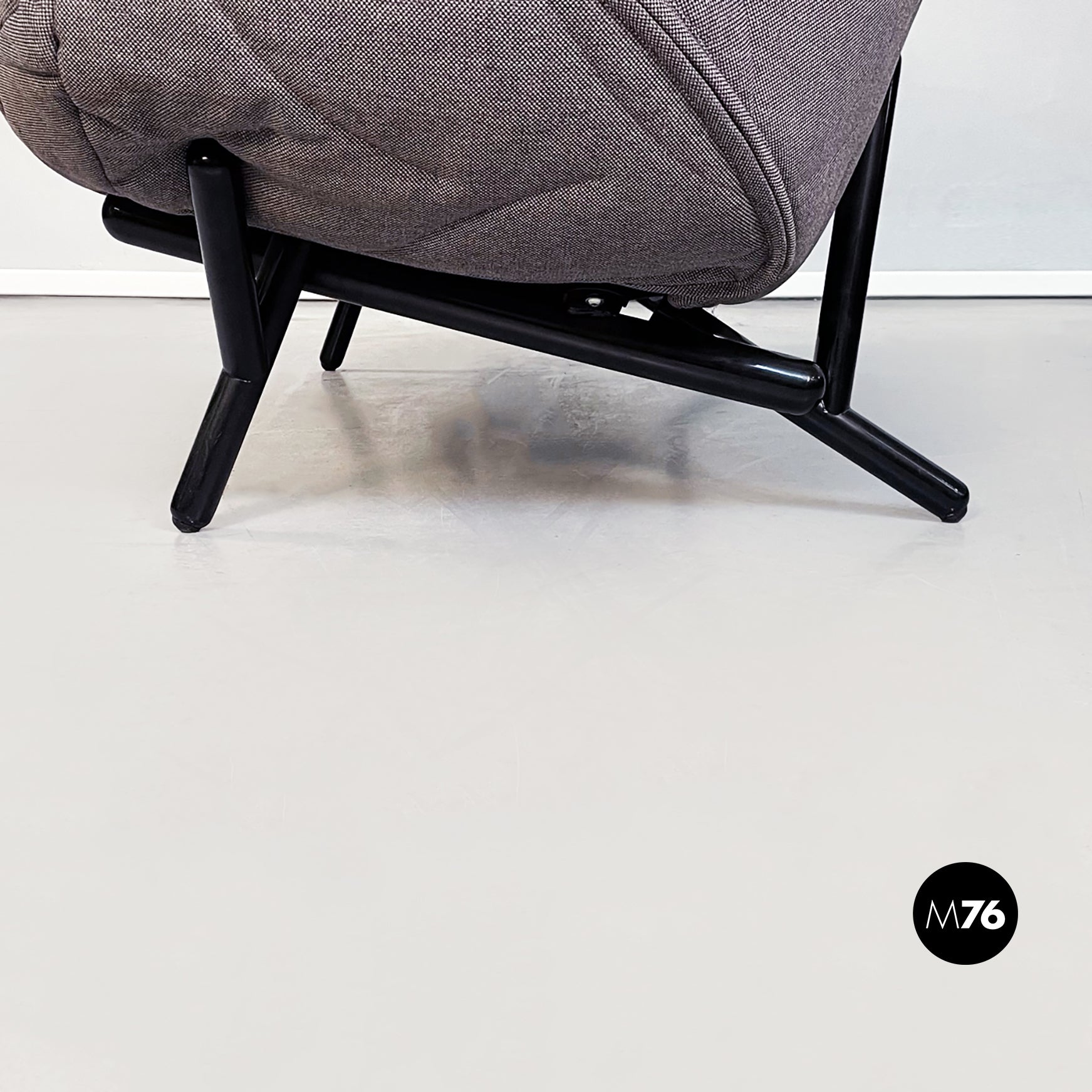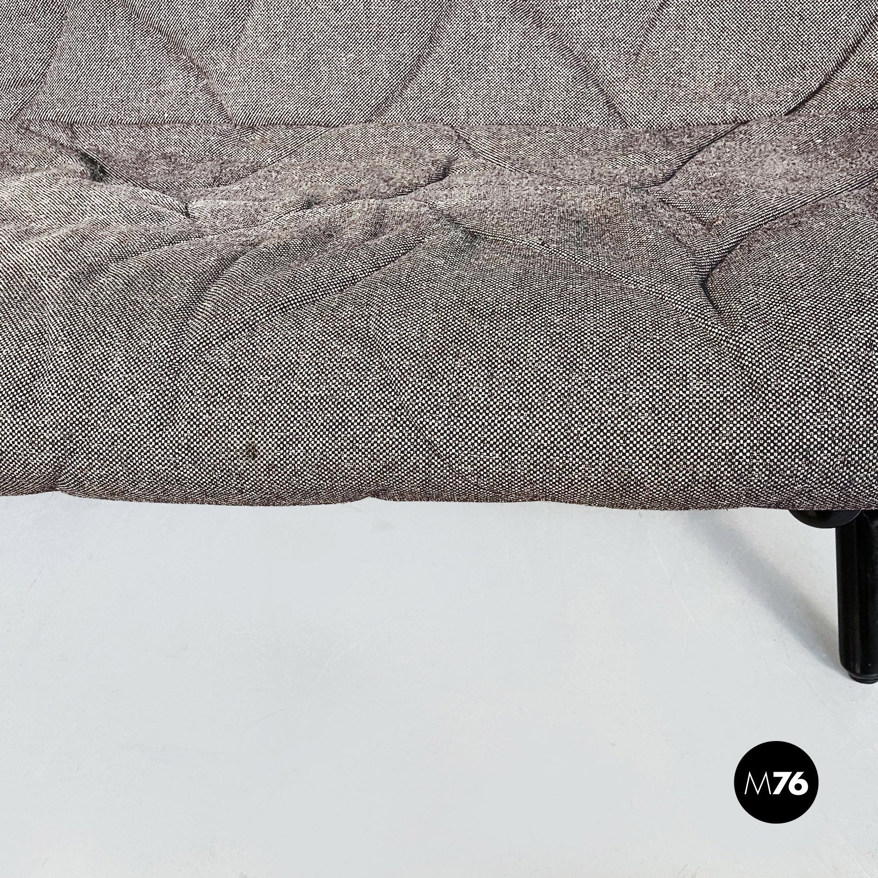 Divano modello Foliage a due posti con struttura tubolare in ferro verniciato nero seduta e schienale imbottiti in schiuma poliuretanica e rivestita in tessuto grigio su cui sono impunturate delle forme di foglie. Infatti la seduta riprende la forma e l’idea della chioma di un albero.