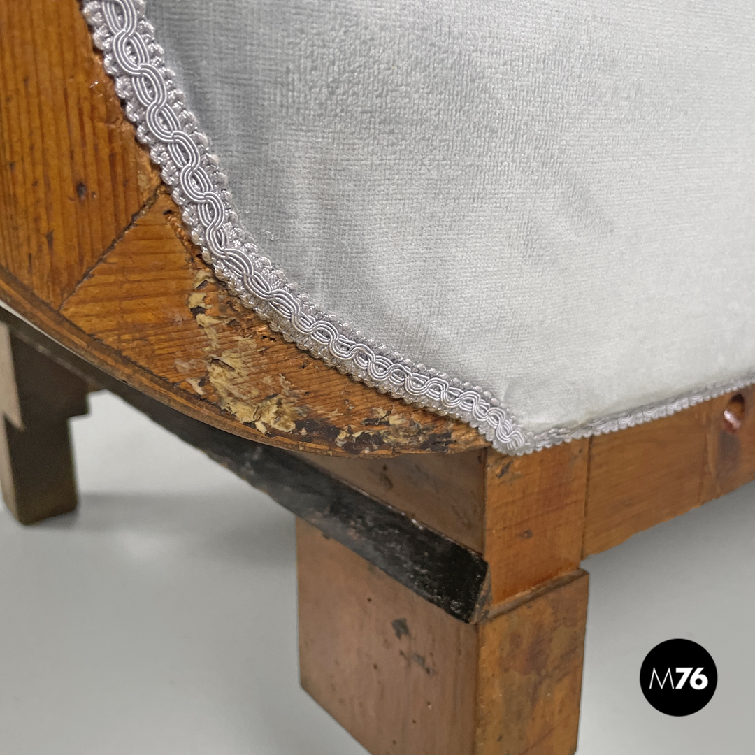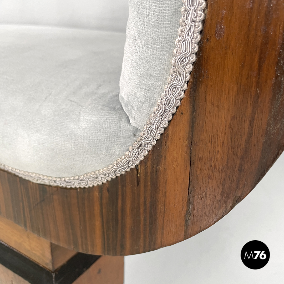 Divano in legno e tessuto. La struttura in legno è curva e tondeggiante e compone la struttura portante e i due braccioli. La seduta i braccioli e lo schienale sono imbottiti e rivestiti di velluto color celeste carta da zucchero pastello e passamaneria grigia. Tra la parte superiore e le gambe si trova una fascia decorativa di legno dipinta di nero che percorre tutto il perimetro. Con quattro gambe di forma geometrica a sezione quadrata all’appoggio a terra.