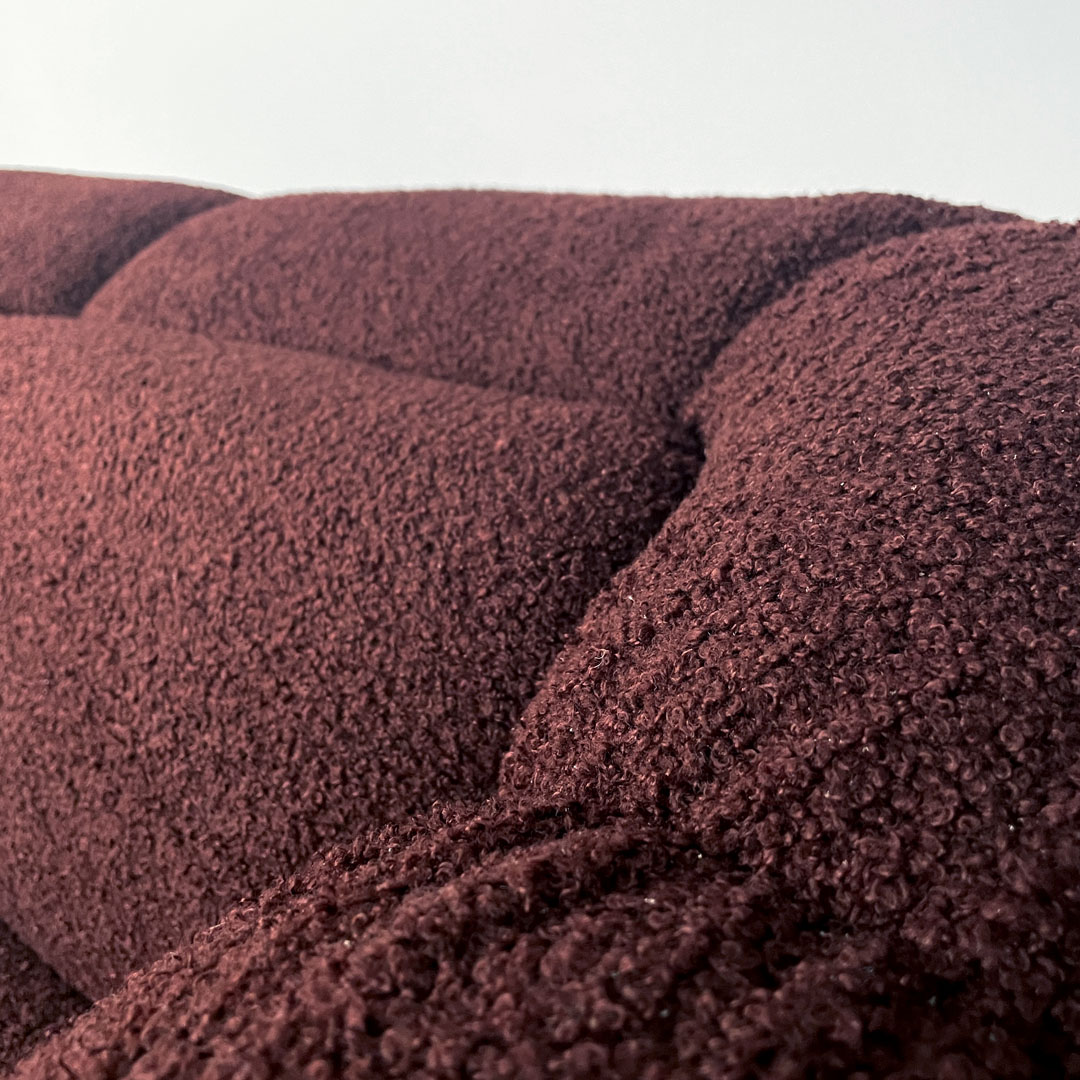 Three-seat sofa in burgundy Teddy fabric. It features soft and curved lines from the backrest to the seat and armrests. With three cushions corresponding to the three seats in front of the backrest. There are two buttons on each seat. The sofa rests directly on the ground.