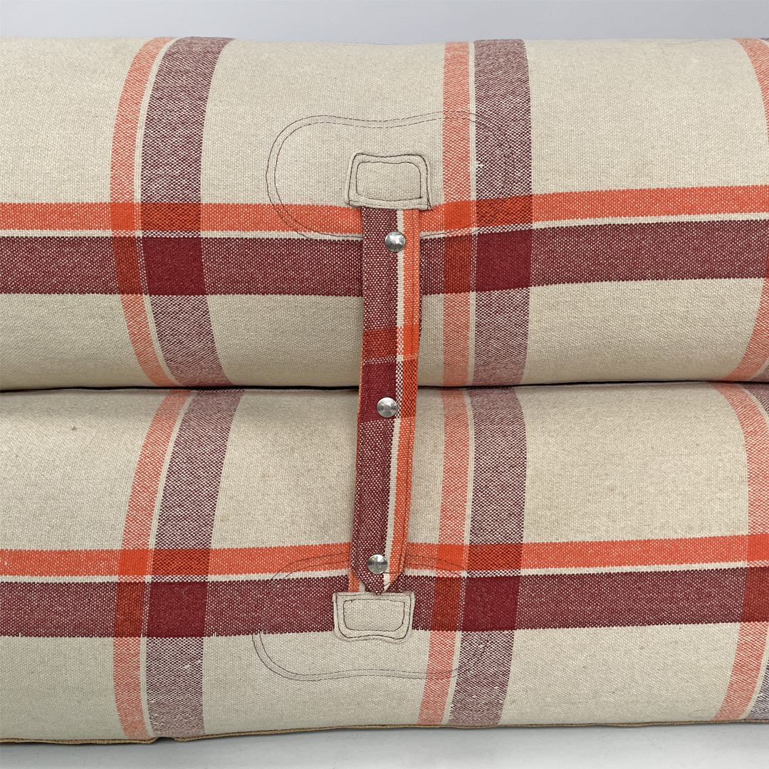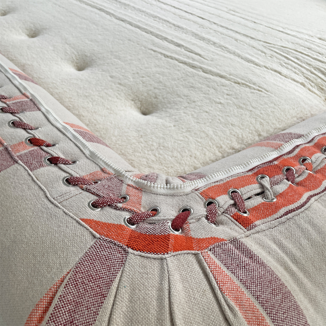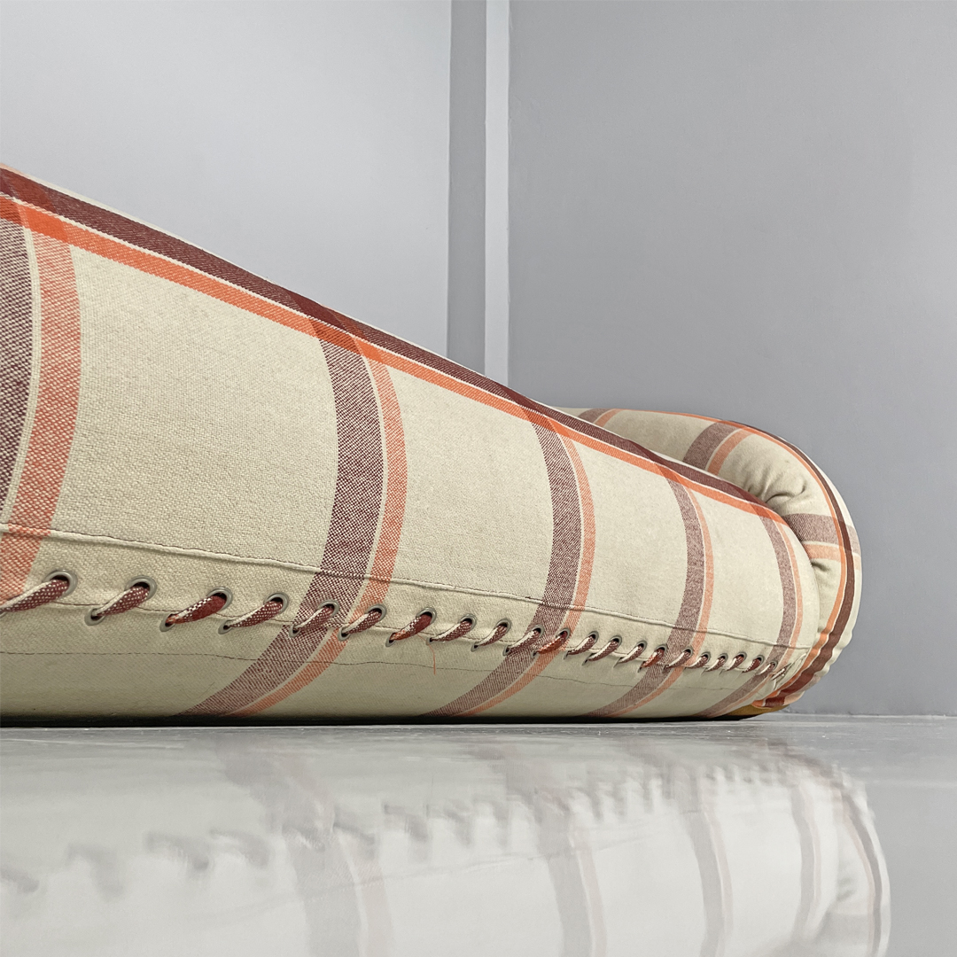 Divano letto modello Anfibio con seduta e schienale imbottiti e rivestiti in tessuto. Sul fronte sono presenti lacci intrecciati decorativi. Sui lati e sullo schienale sono presenti 4 cinghie in tessuto con 3 bottoni metallici. Sganciando le 4 cinghie e la cerniera bianca, il divano può essere aperto e utilizzato come letto matrimoniale o come chaise longue. Il materasso è imbottito e rivestito in tessuto bianco.