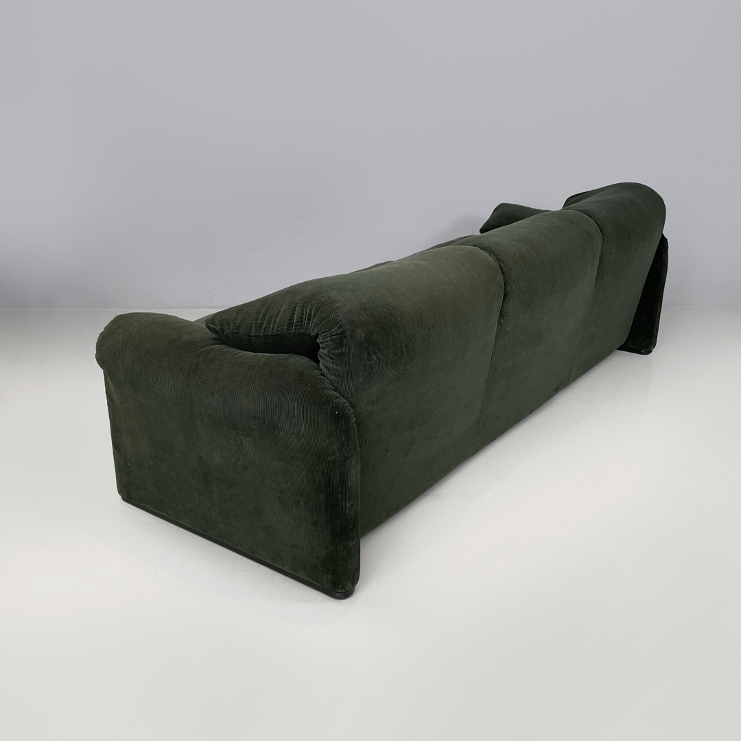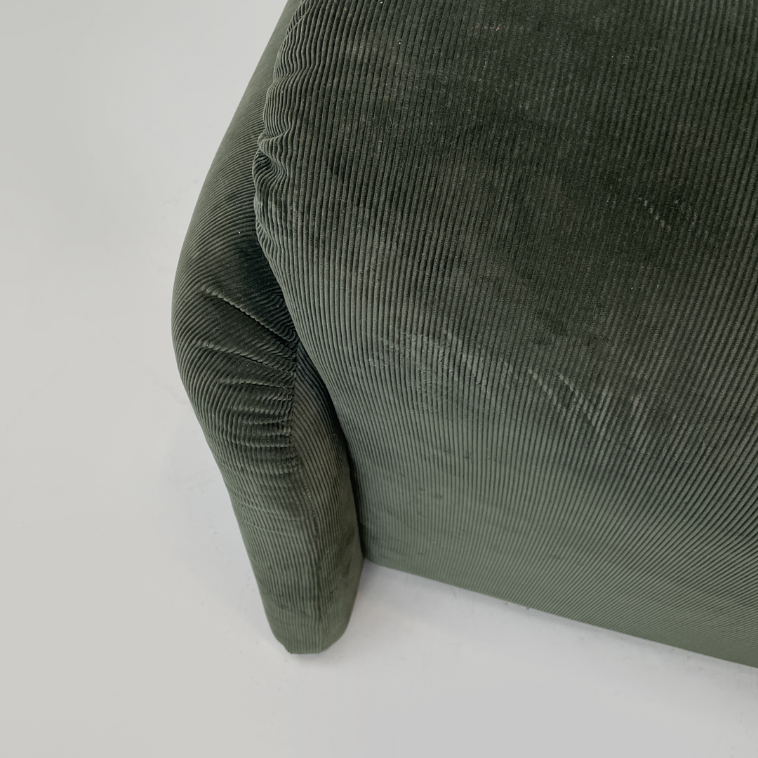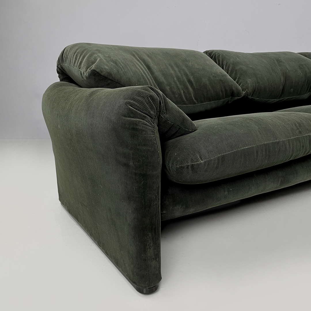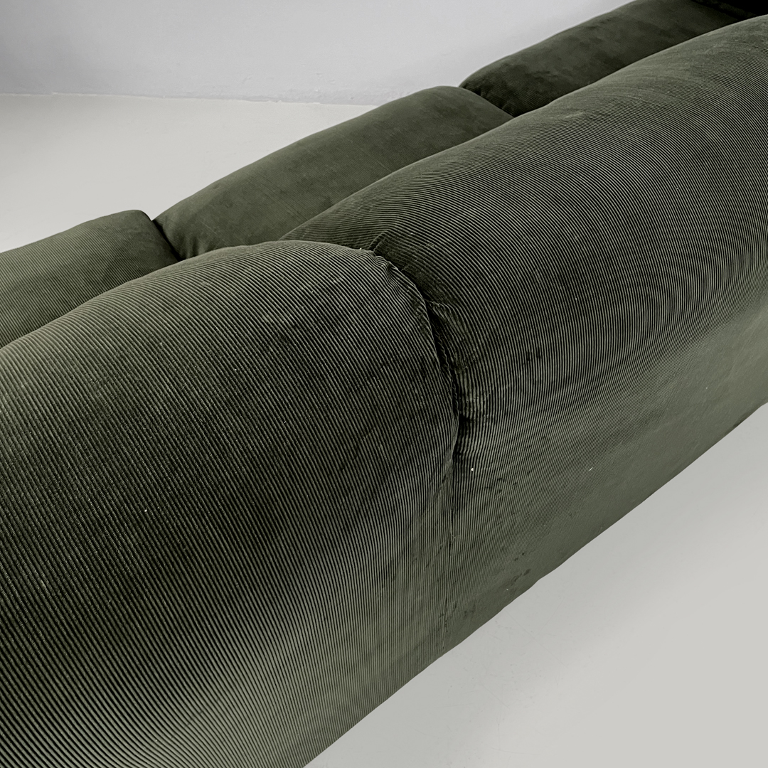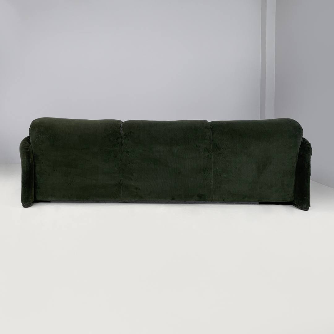 Divano modello Maralunga a tre posti imbottito e rivestito in velluto a coste verde scuro. Presenta un poggiatesta ribaltabile indipendente per ogni singolo posto con due braccioli sono curvi e “ripiegati” verso la seduta. Le due gambe laterali hanno una copertura in plastica nera all’appoggio a terra.