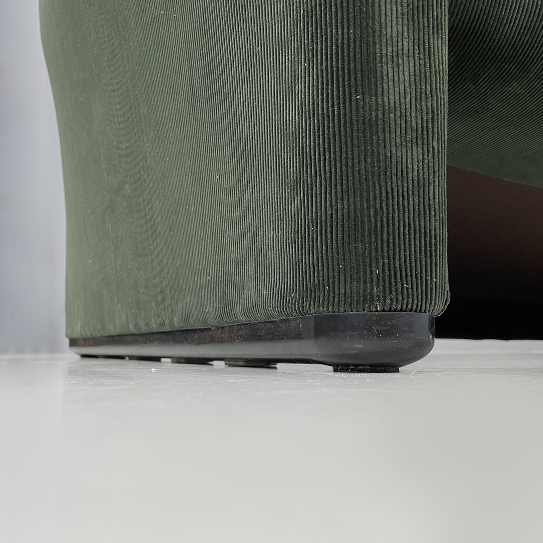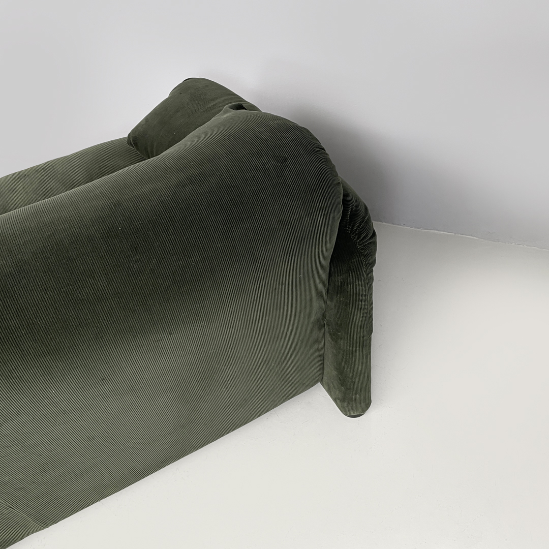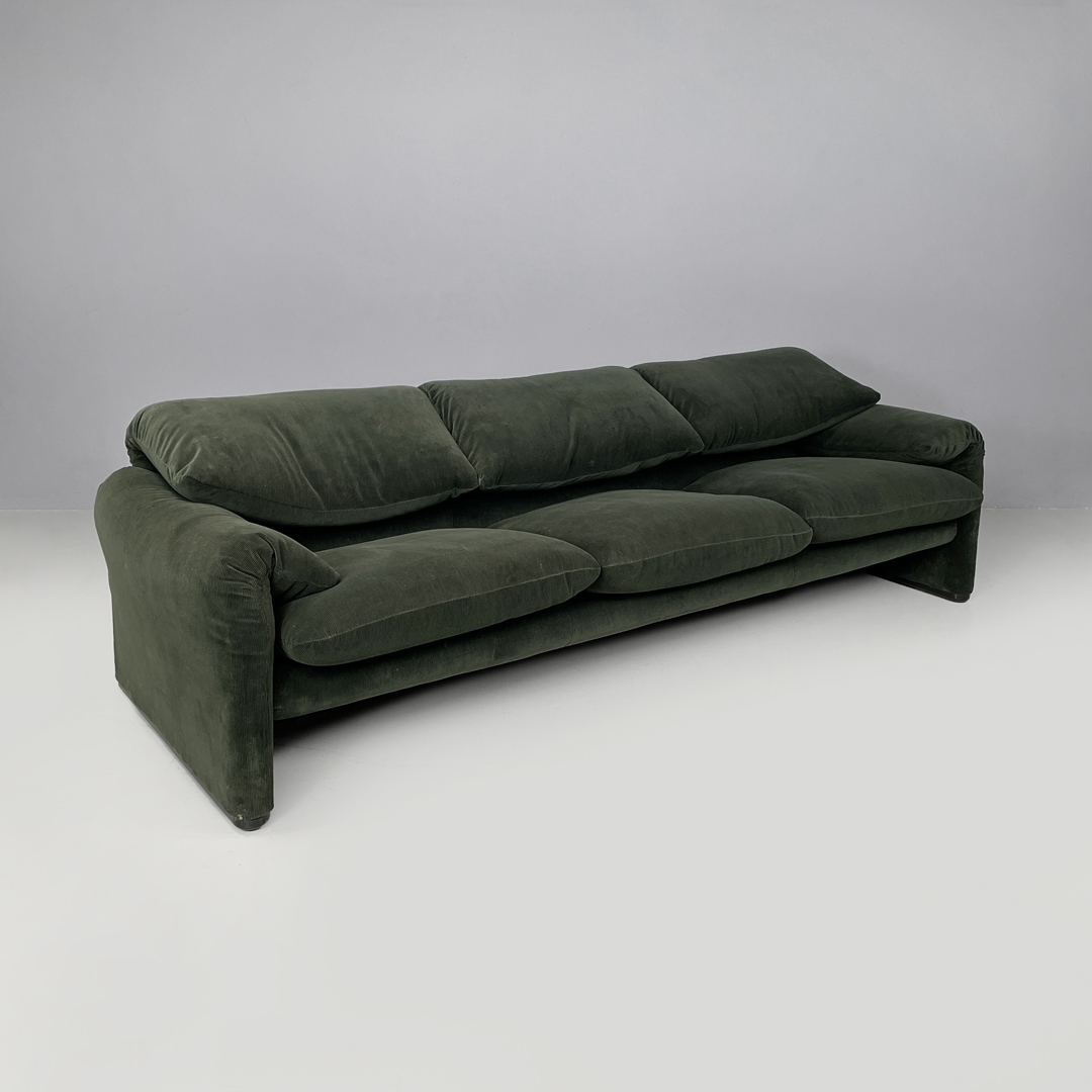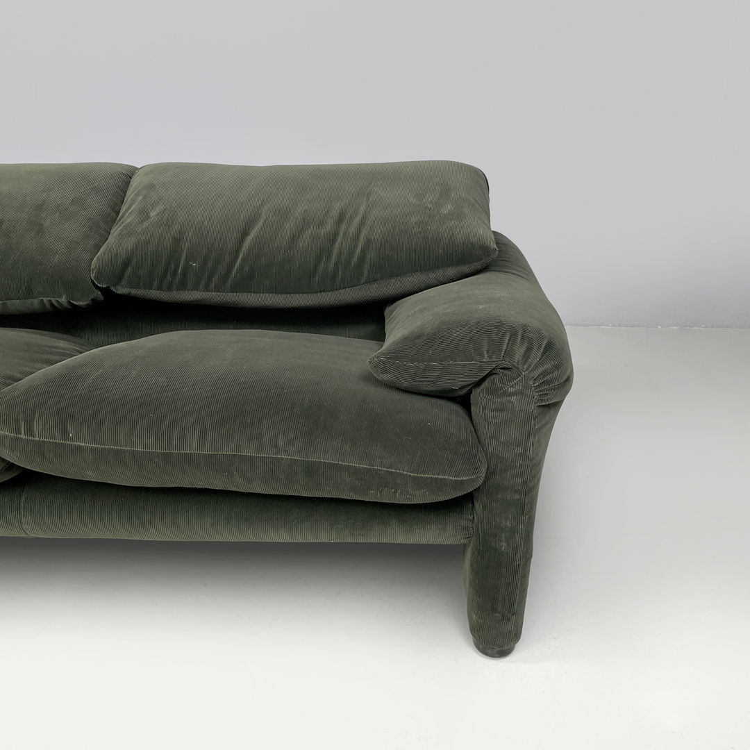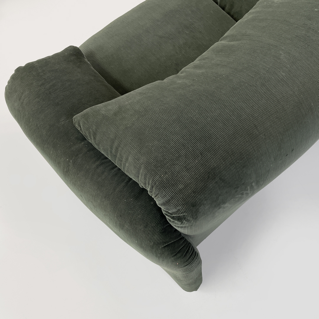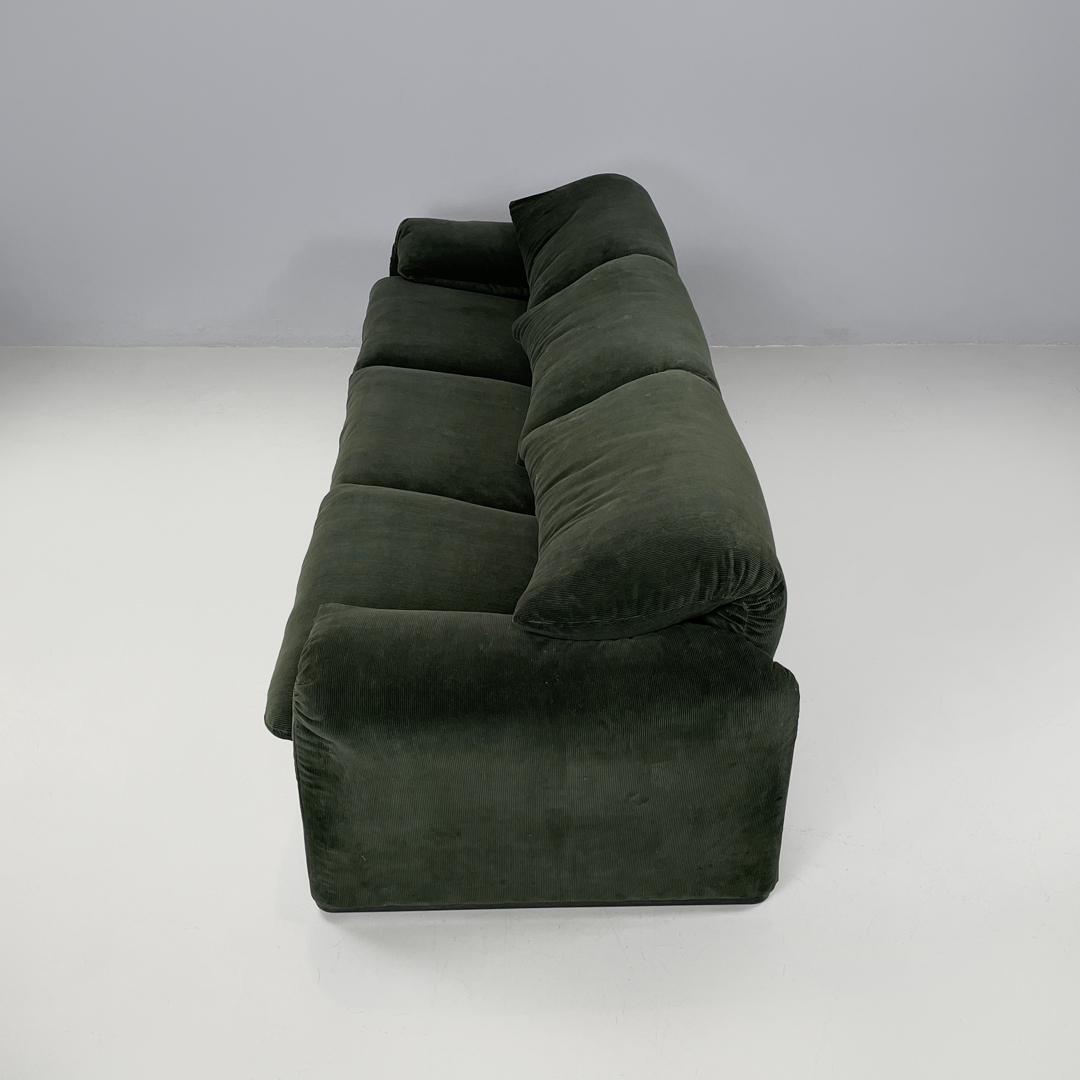 Divano modello Maralunga a tre posti imbottito e rivestito in velluto a coste verde scuro. Presenta un poggiatesta ribaltabile indipendente per ogni singolo posto con due braccioli sono curvi e “ripiegati” verso la seduta. Le due gambe laterali hanno una copertura in plastica nera all’appoggio a terra.