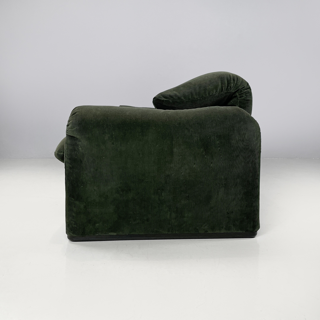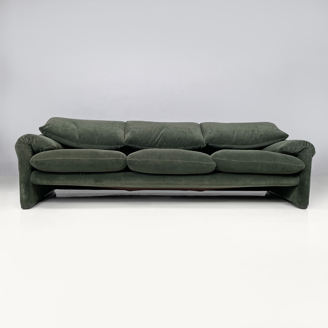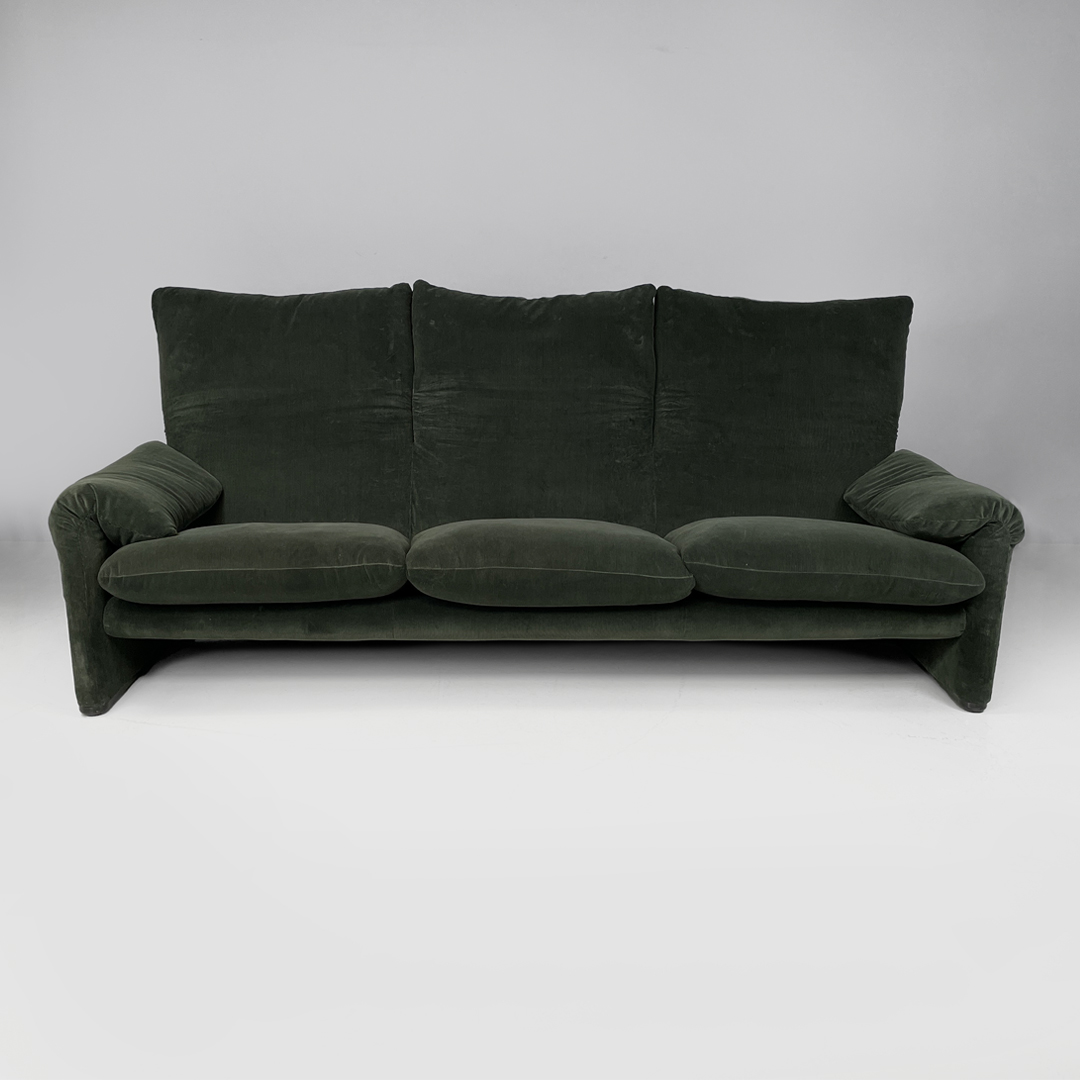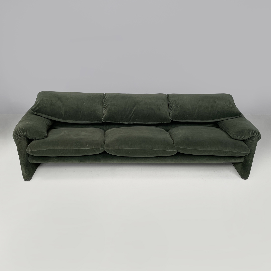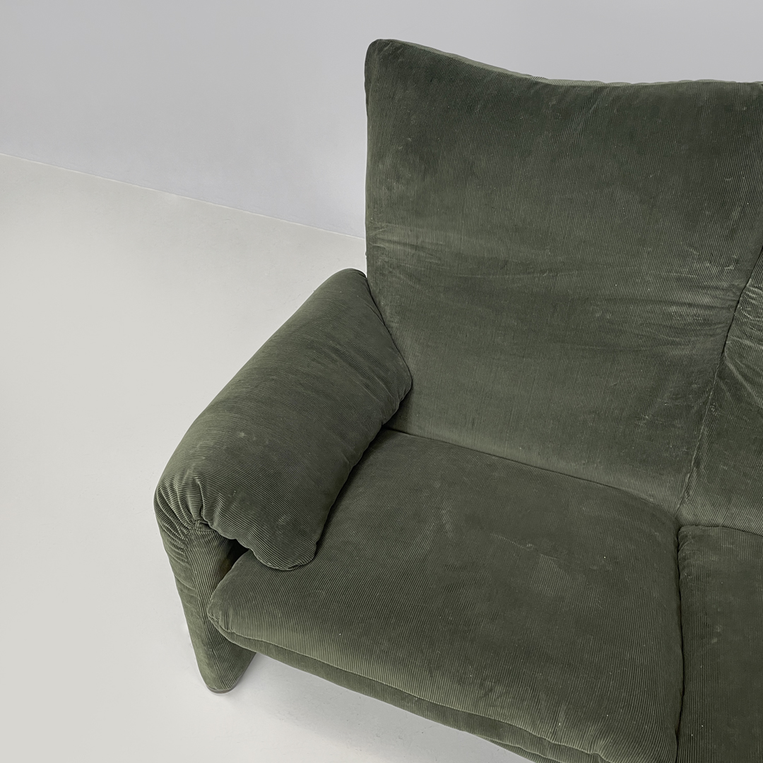 Divano modello Maralunga a tre posti imbottito e rivestito in velluto a coste verde scuro. Presenta un poggiatesta ribaltabile indipendente per ogni singolo posto con due braccioli sono curvi e “ripiegati” verso la seduta. Le due gambe laterali hanno una copertura in plastica nera all’appoggio a terra.