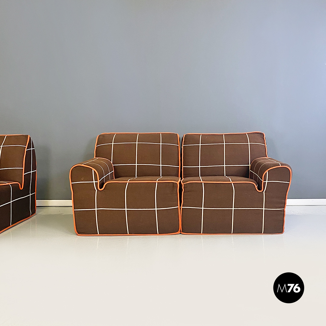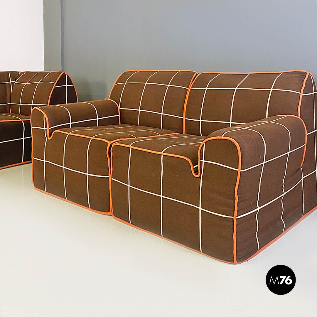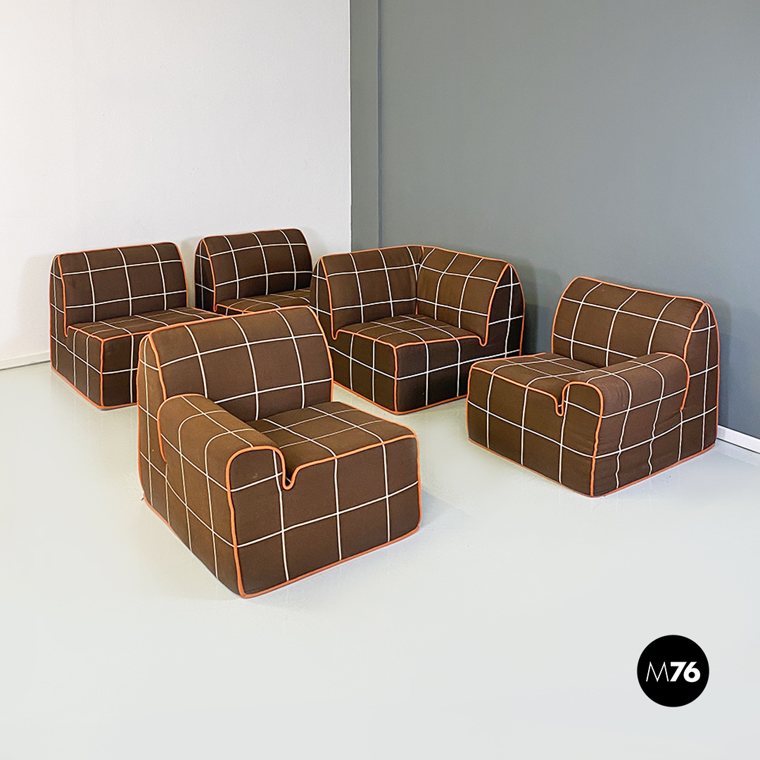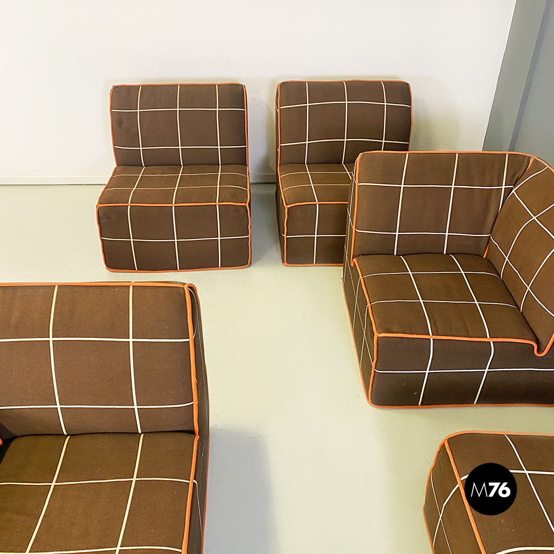 Divano modulare modello Me Too con struttura composta da due moduli senza braccioli altri due con bracciolo singolo e un modulo angolare tutti rivestiti in tessuto di cotone marrone a quadrettoni bianchi con profili arancioni.