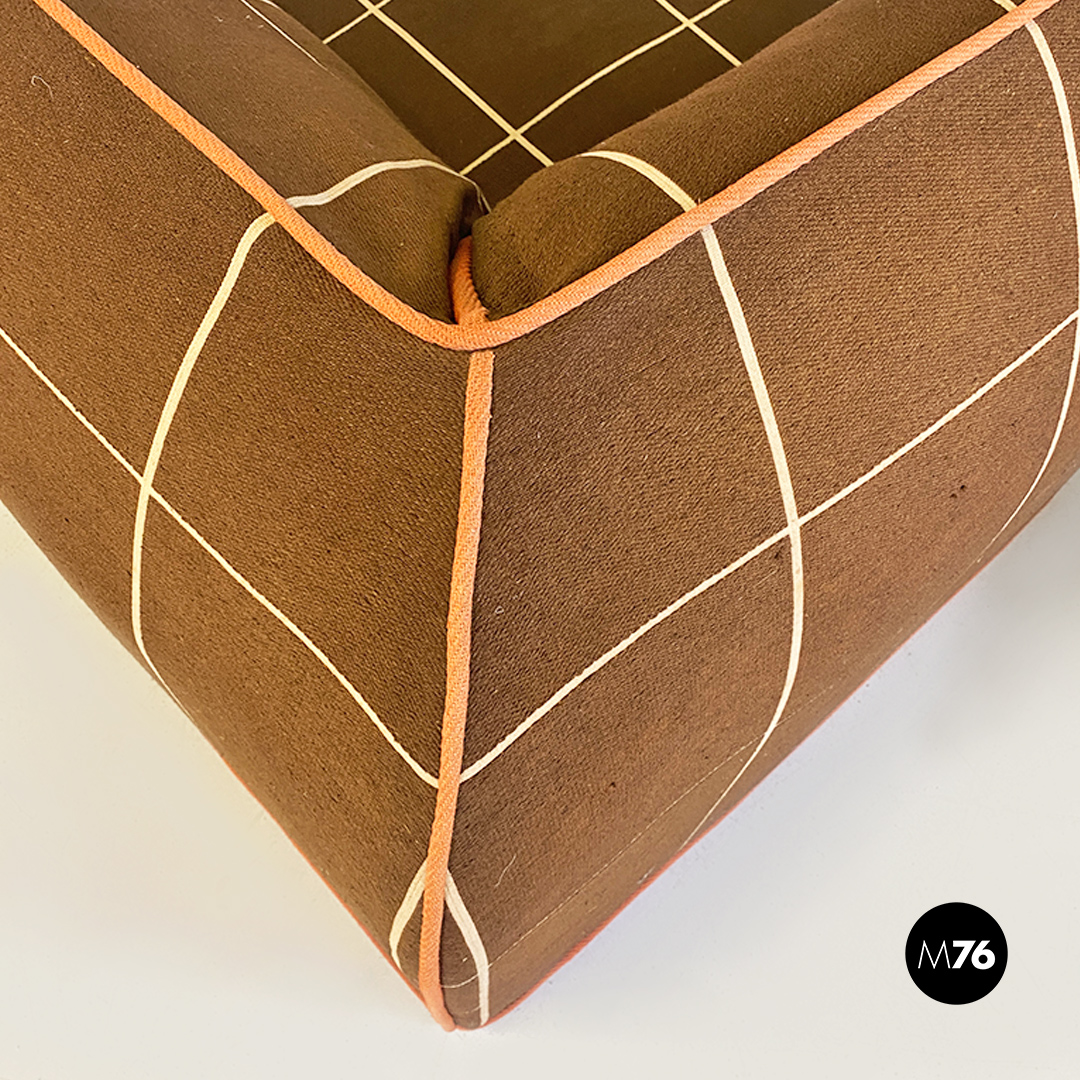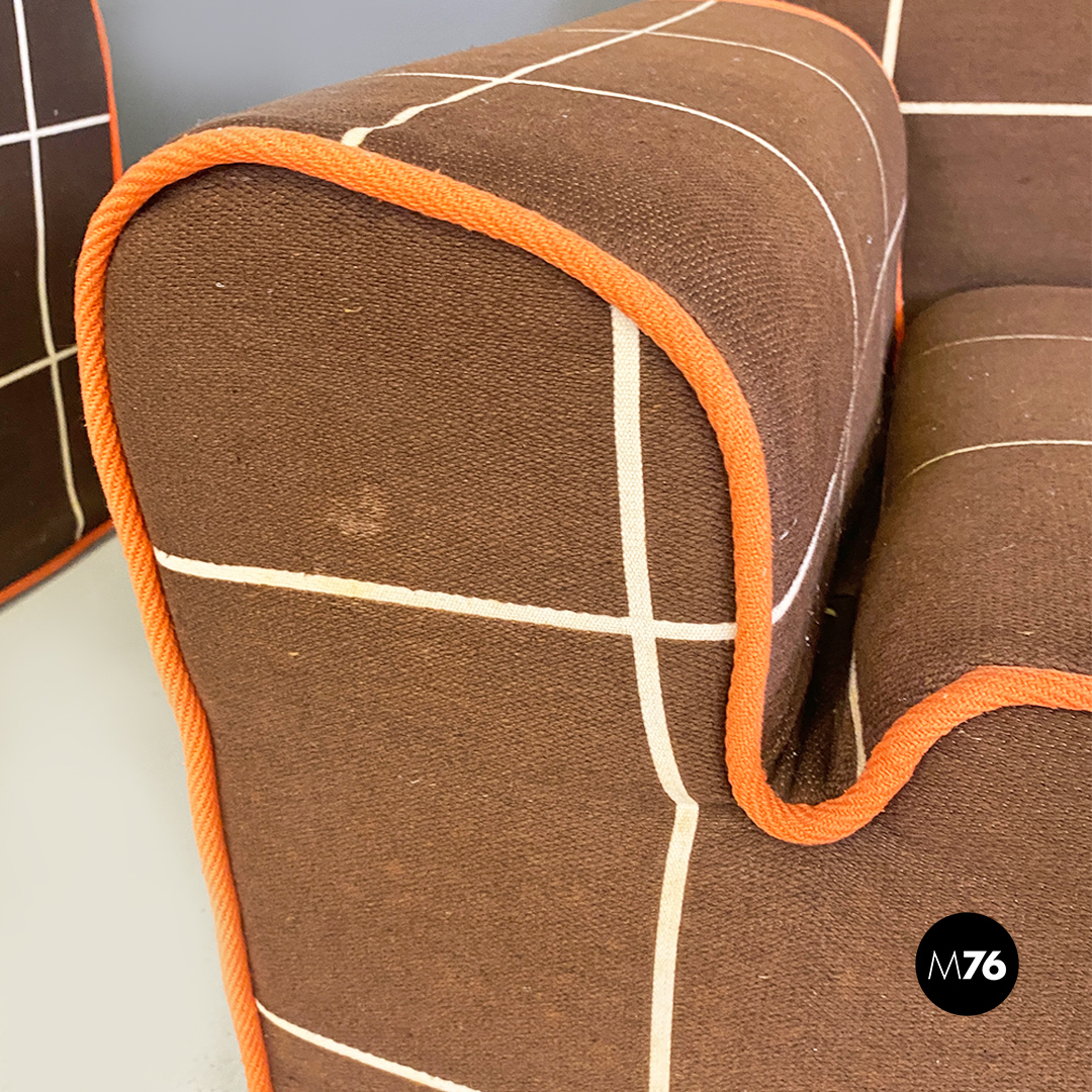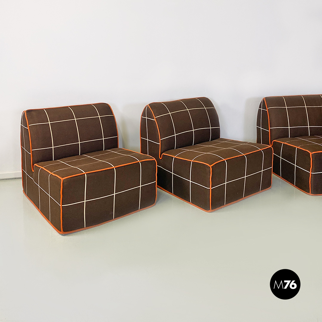 Divano modulare modello Me Too con struttura composta da due moduli senza braccioli altri due con bracciolo singolo e un modulo angolare tutti rivestiti in tessuto di cotone marrone a quadrettoni bianchi con profili arancioni.