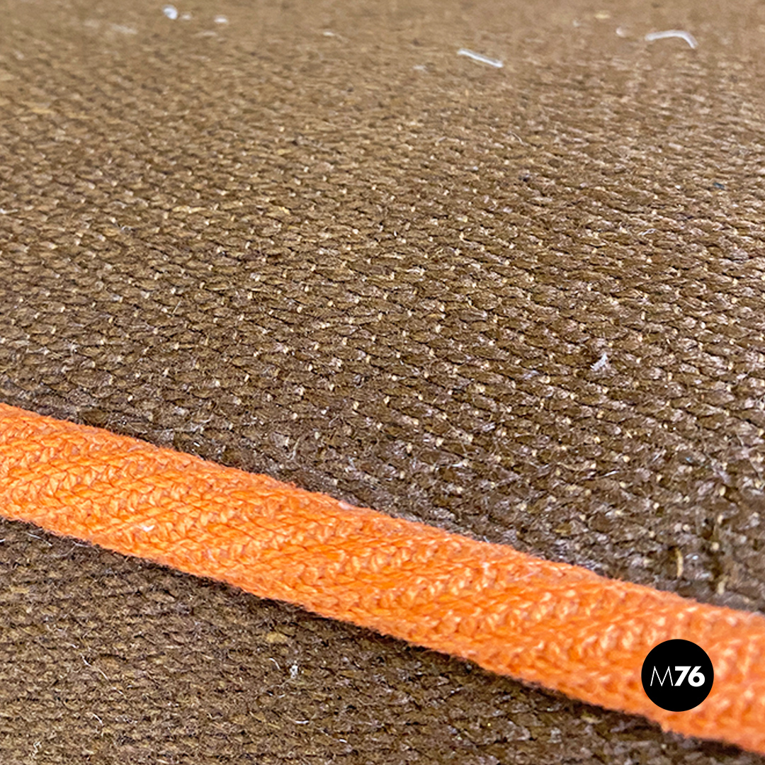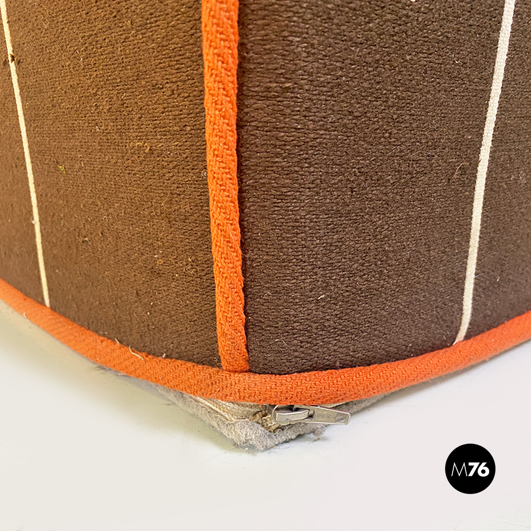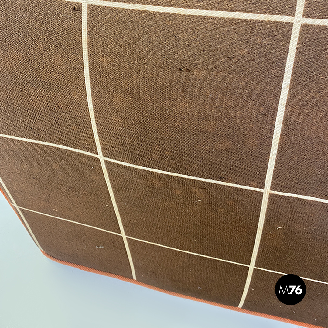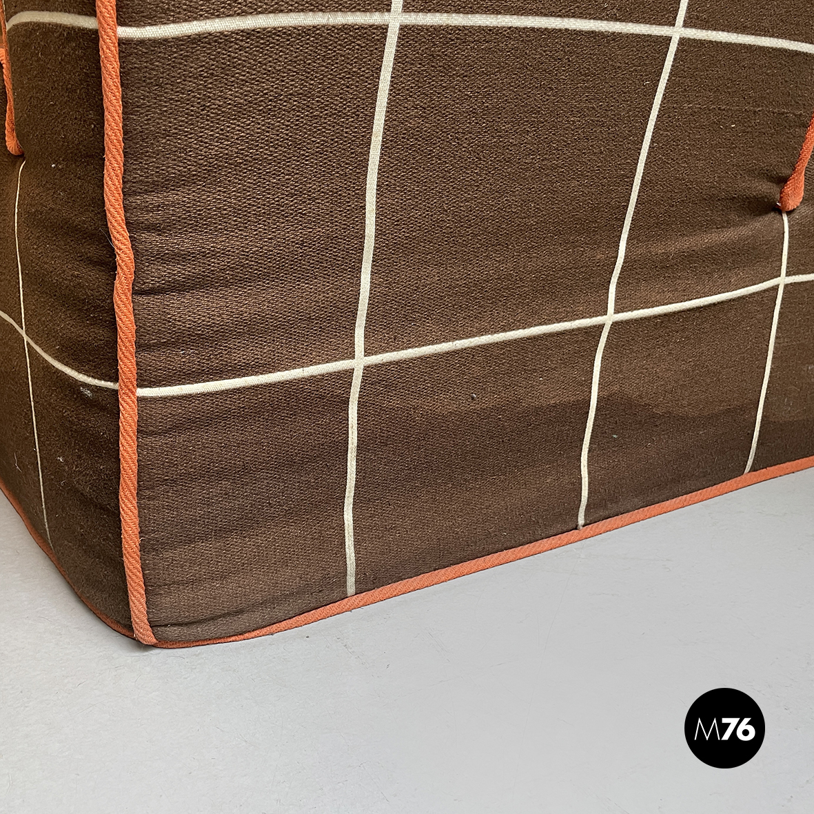 Divano modulare modello Me Too con struttura composta da due moduli senza braccioli altri due con bracciolo singolo e un modulo angolare tutti rivestiti in tessuto di cotone marrone a quadrettoni bianchi con profili arancioni.