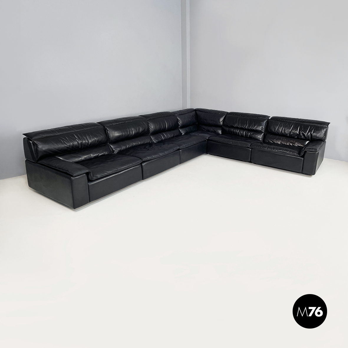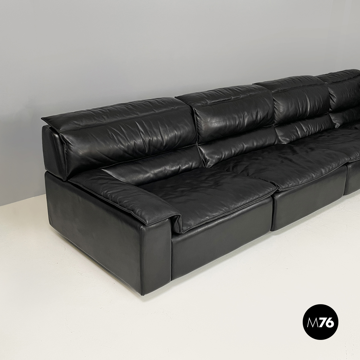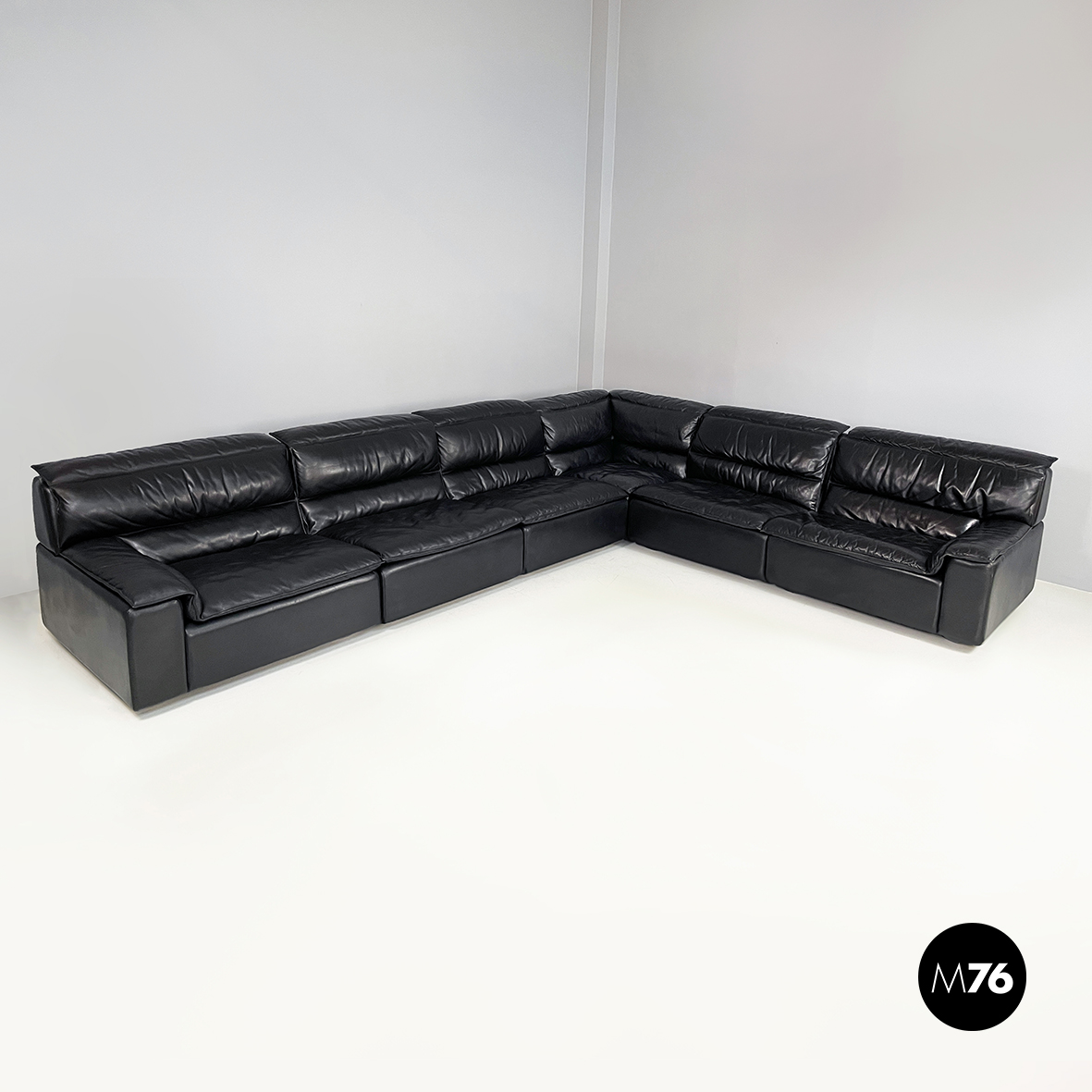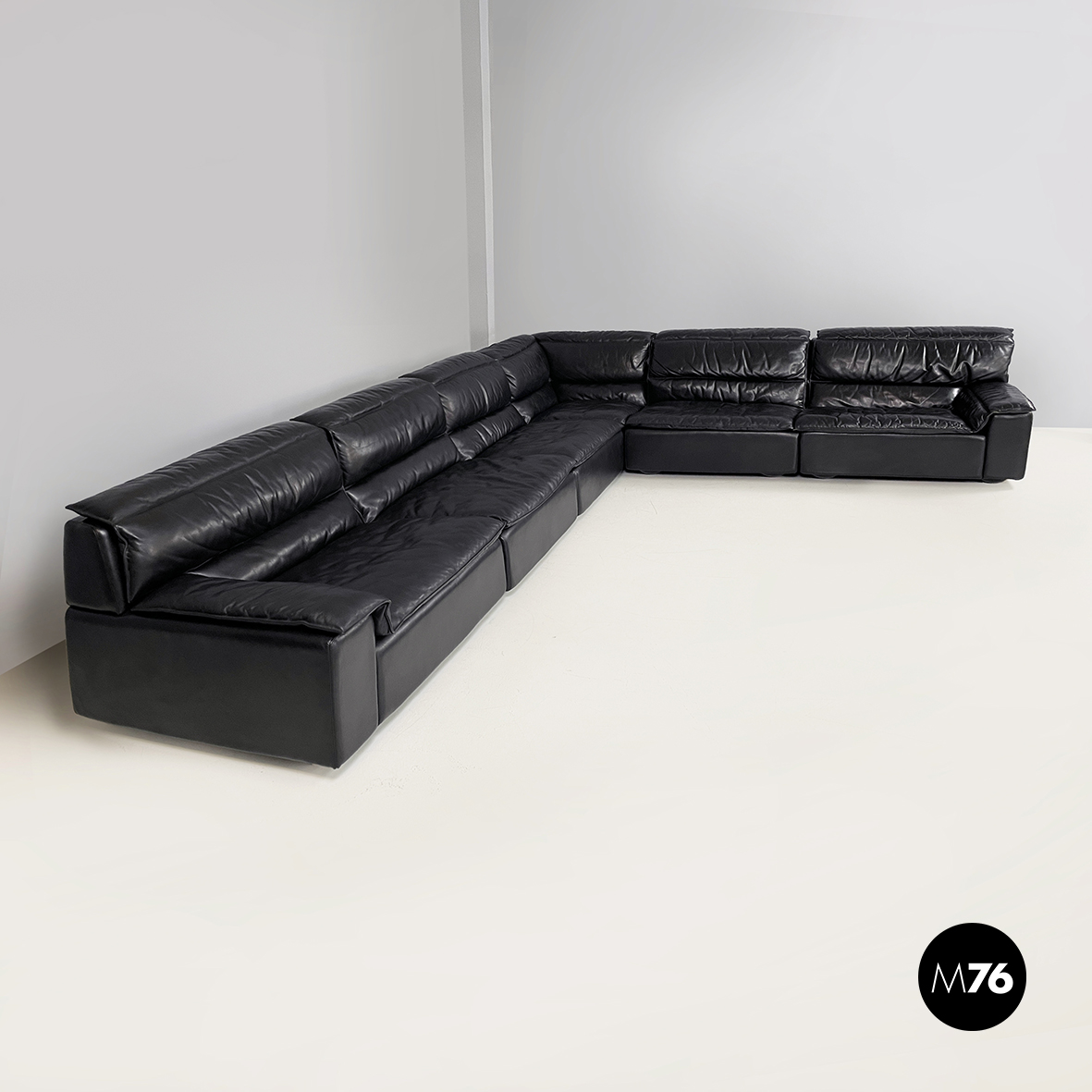 Divano modulare modello Bogo interamente imbottito e rivestito in pelle nera. Il divano comprende sei moduli: due moduli con braccioli tre moduli semplici e un modulo angolare. La forma di seduta schienale e braccioli è squadrata con cuscini tondeggianti. Piedini non visibili. Il divano può essere composto a piacere.