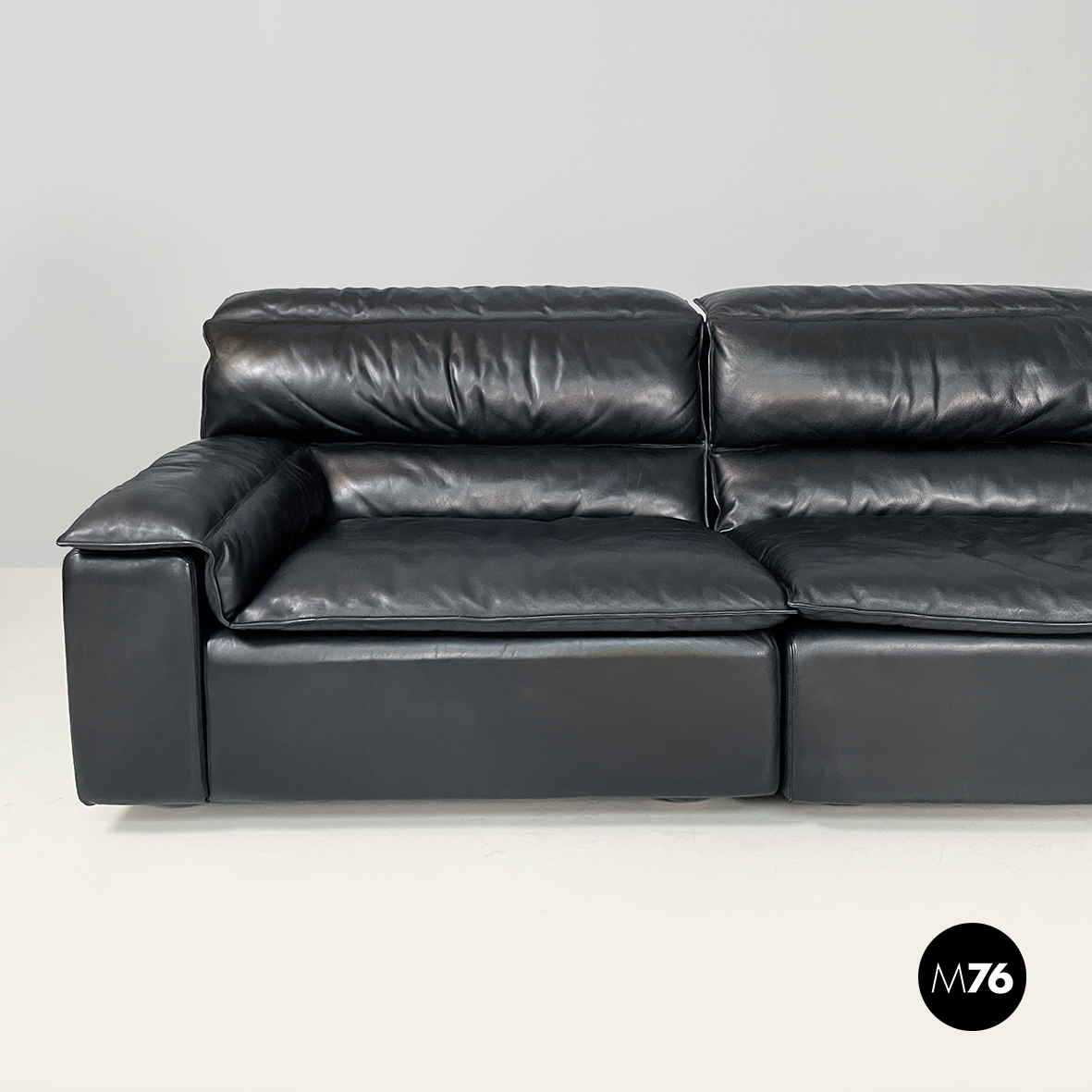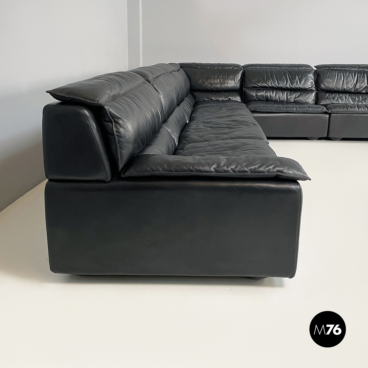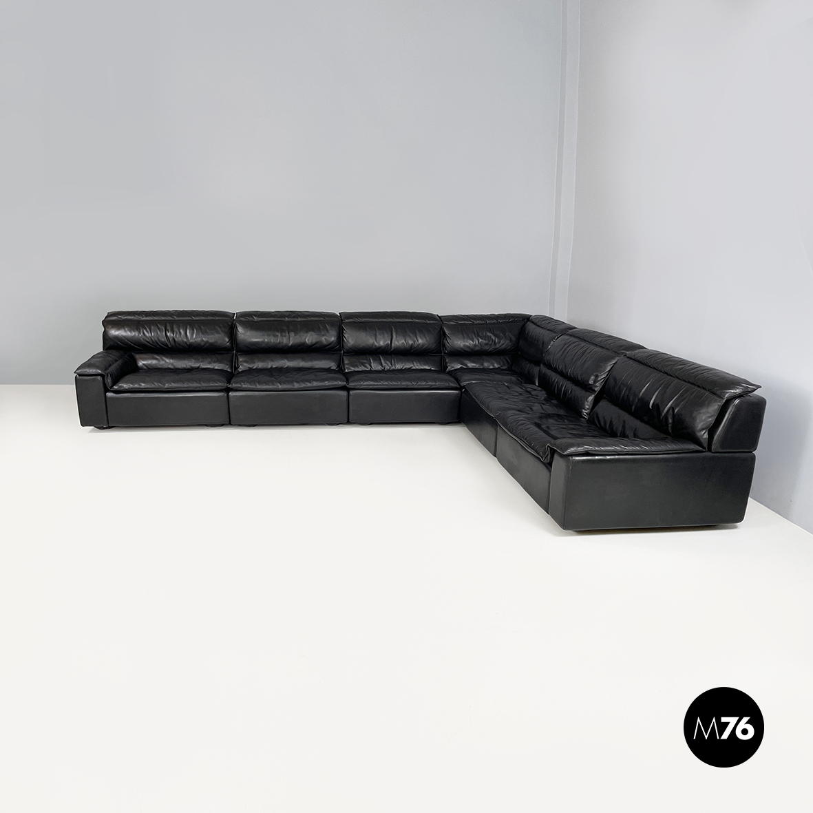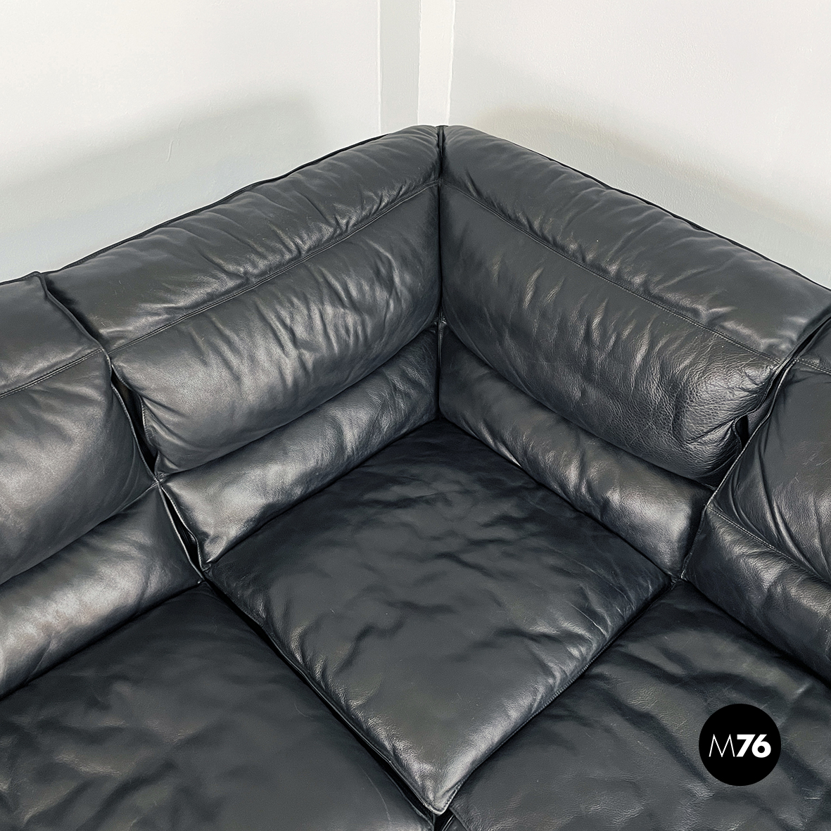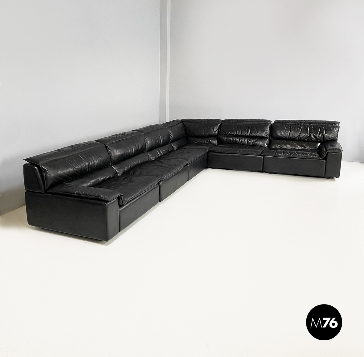 Divano modulare modello Bogo interamente imbottito e rivestito in pelle nera. Il divano comprende sei moduli: due moduli con braccioli tre moduli semplici e un modulo angolare. La forma di seduta schienale e braccioli è squadrata con cuscini tondeggianti. Piedini non visibili. Il divano può essere composto a piacere.