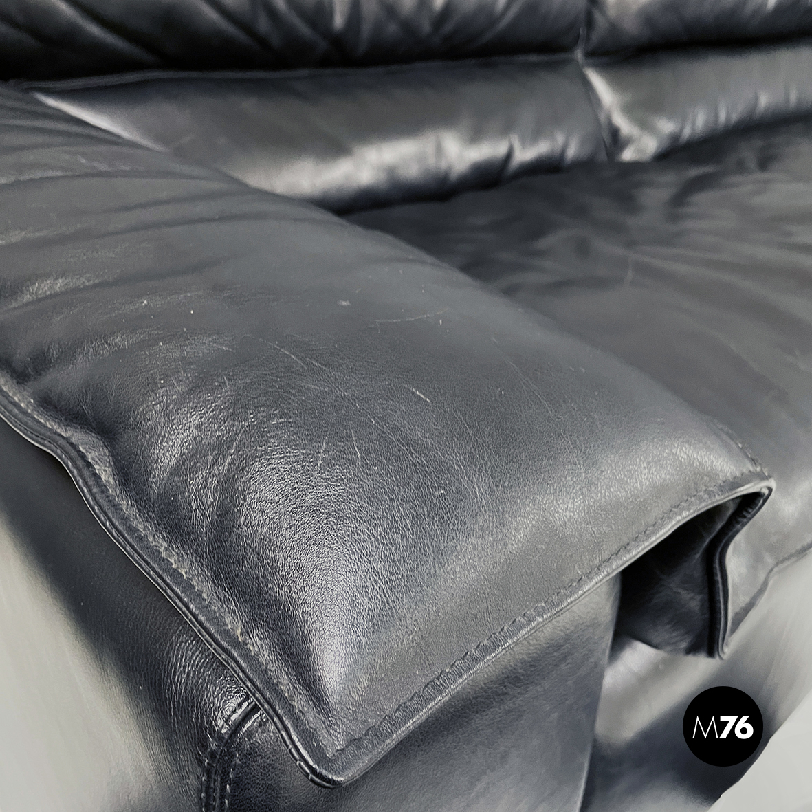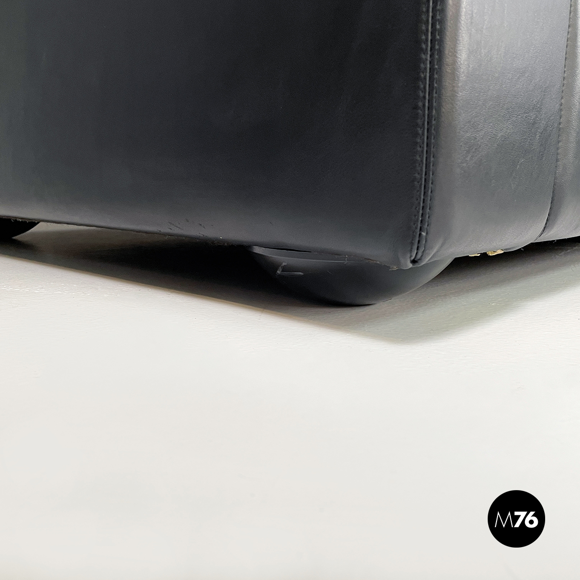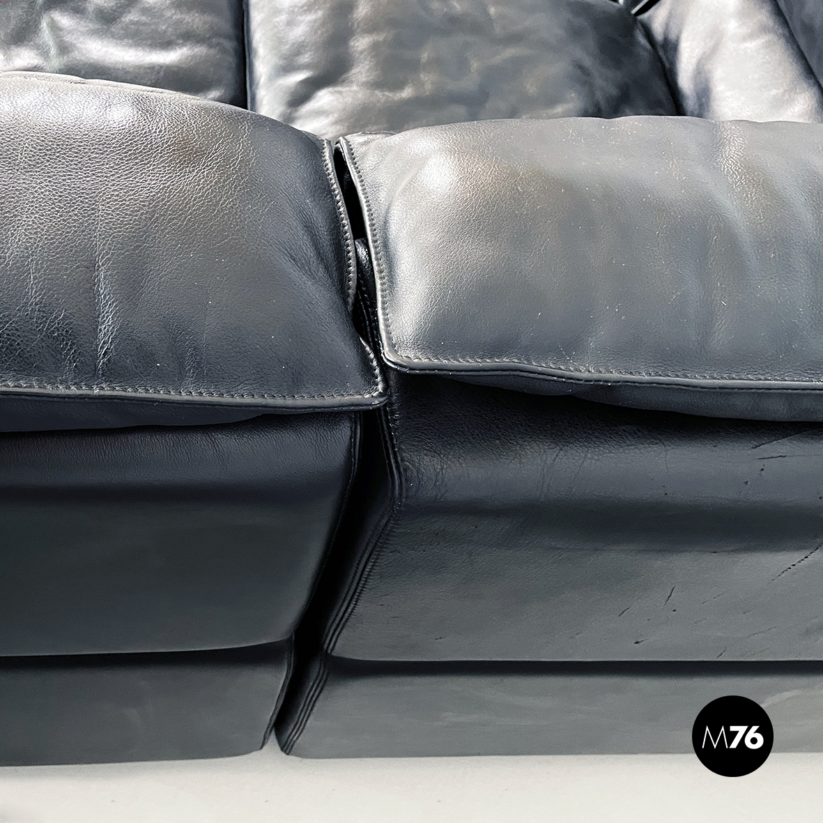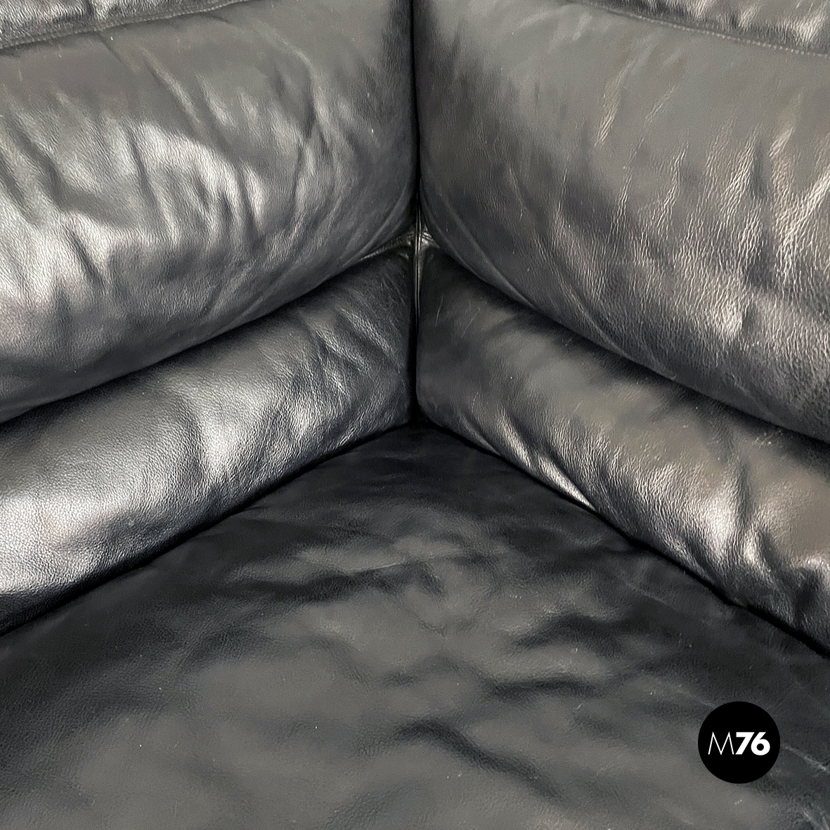 Divano modulare modello Bogo interamente imbottito e rivestito in pelle nera. Il divano comprende sei moduli: due moduli con braccioli tre moduli semplici e un modulo angolare. La forma di seduta schienale e braccioli è squadrata con cuscini tondeggianti. Piedini non visibili. Il divano può essere composto a piacere.