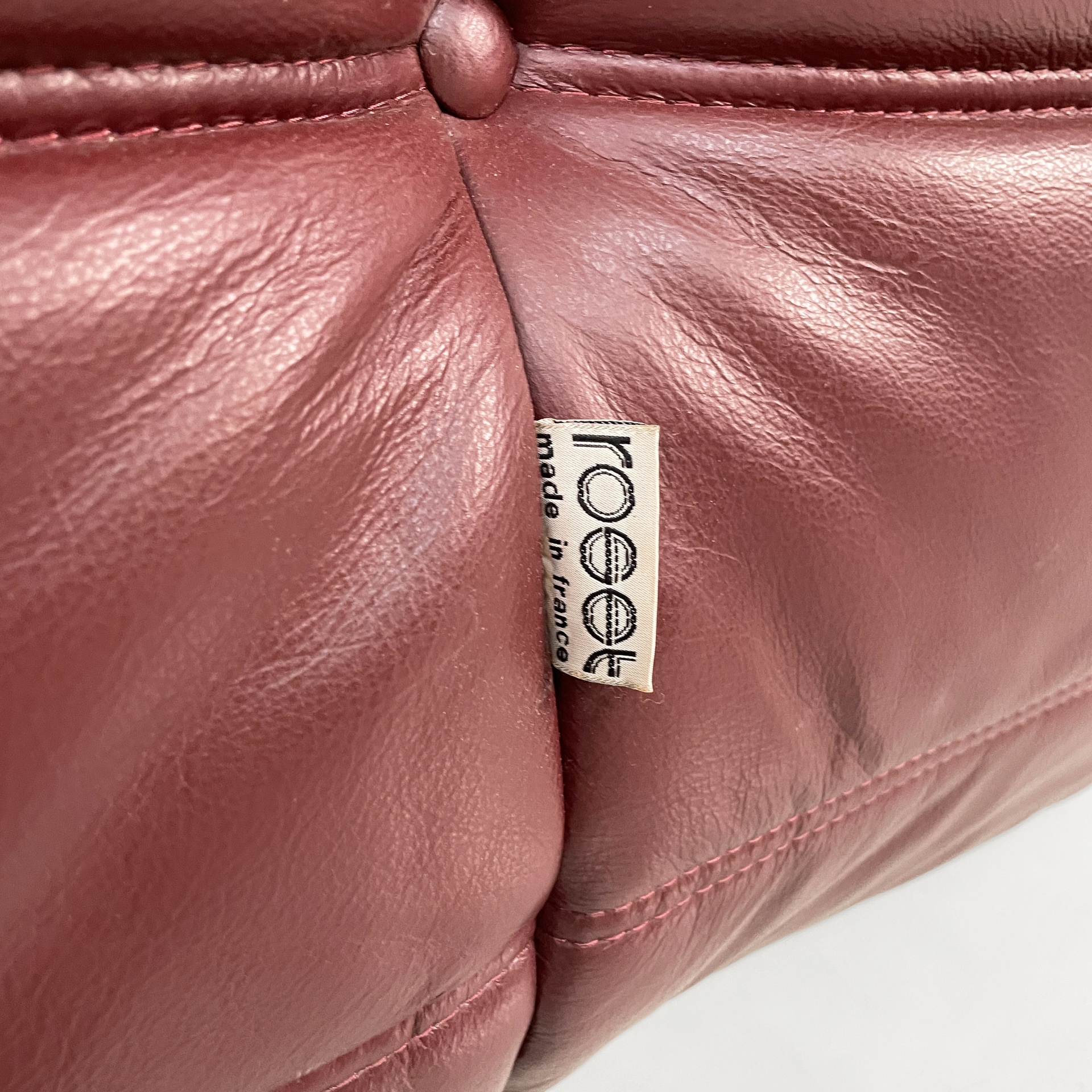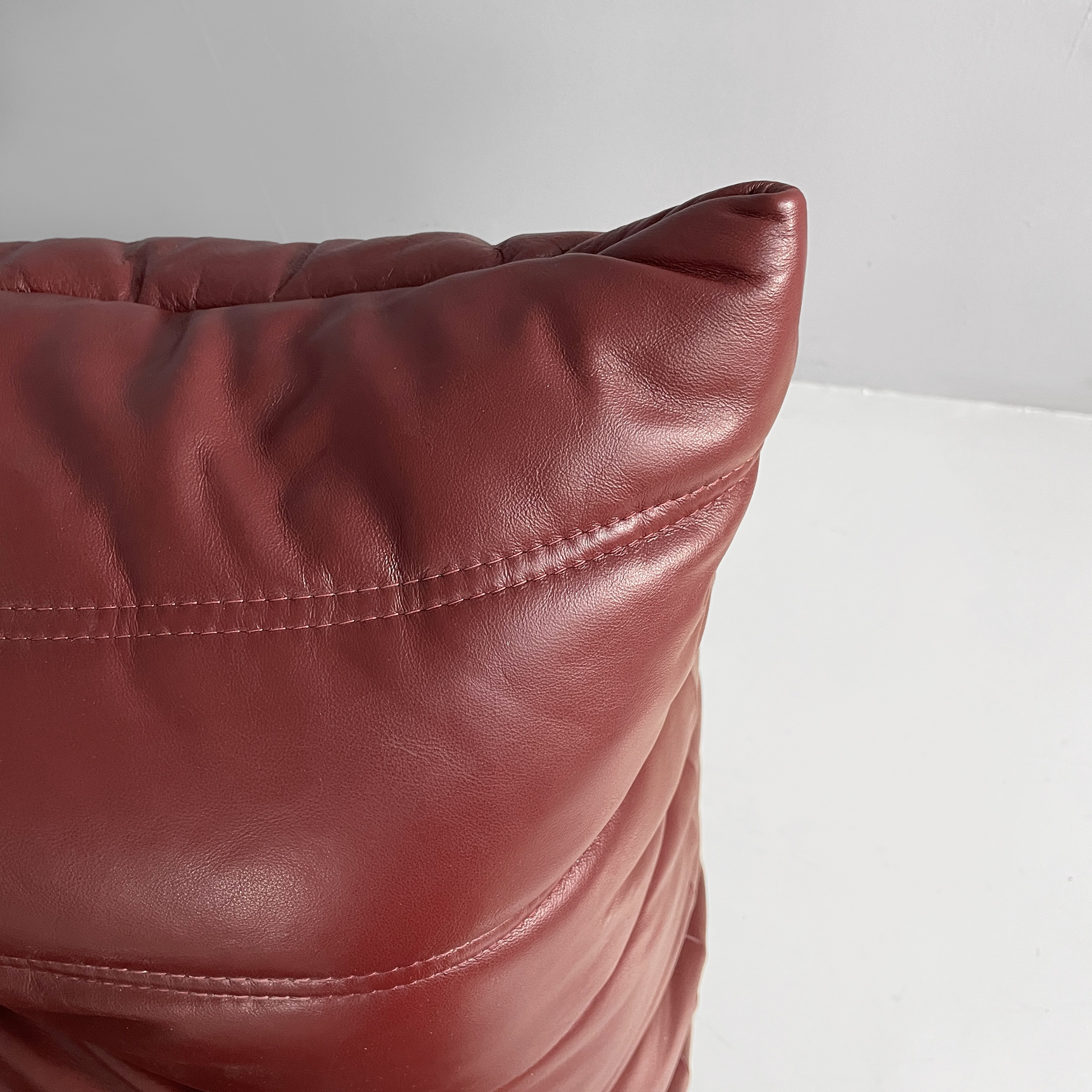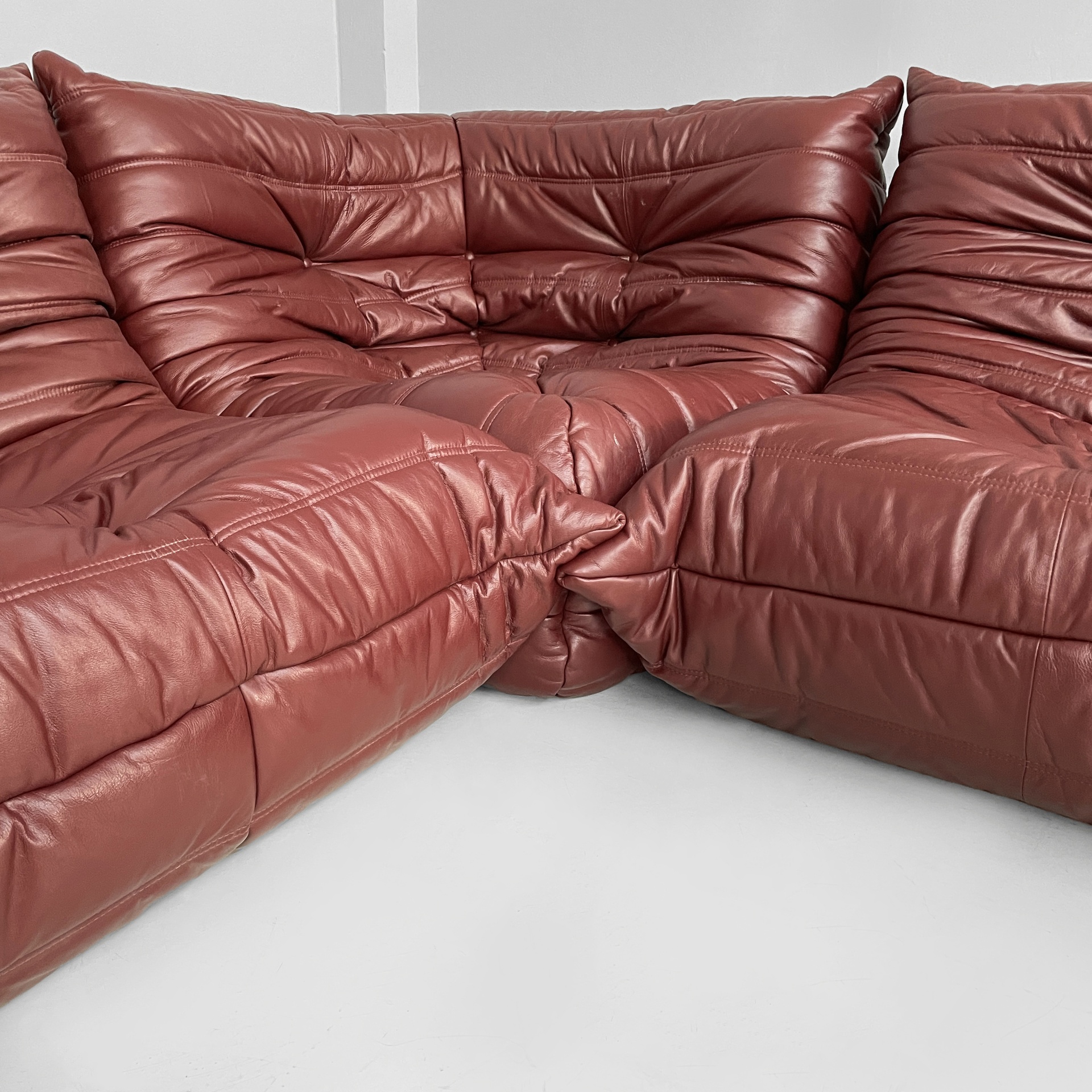 Divano modulare modello Togo interamente imbottito e rivestito in pelle rosso vinaccia. Il divano è composto da un modulo angolare, un modulo a due posti, un modulo a tre posti e un modulo semplice. Ogni modulo è caratterizzato da una silhouette morbida e tondeggiante. Sulla seduta e sullo schienale sono presenti dei bottoni. I moduli possono essere posizionati a piacere, possono essere anche usati come poltrone o piccoli divani.