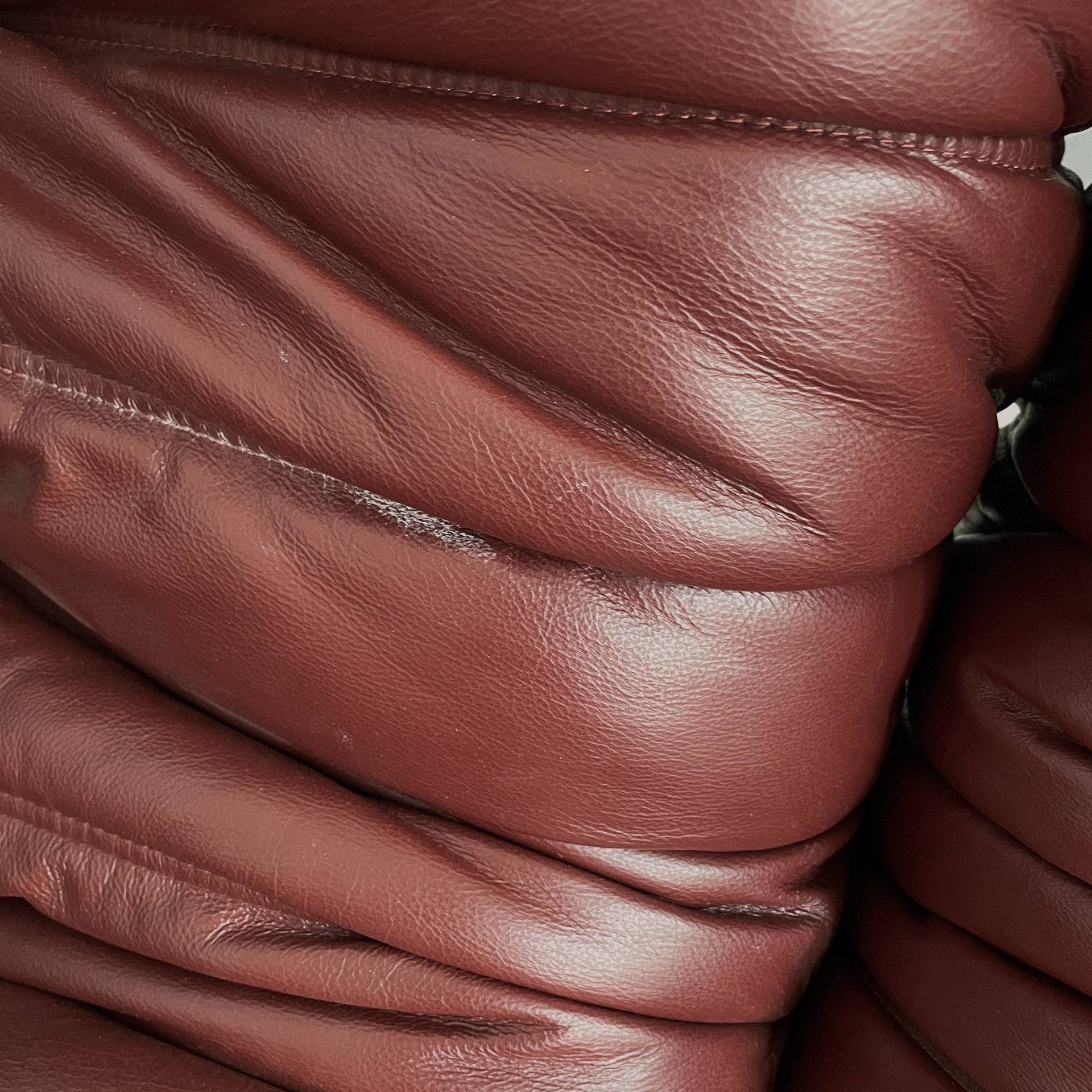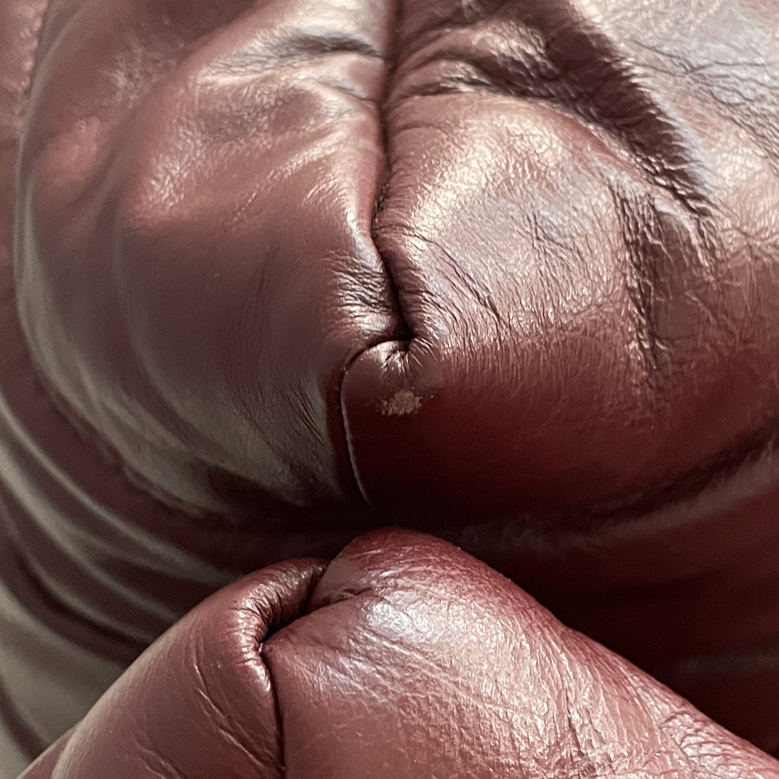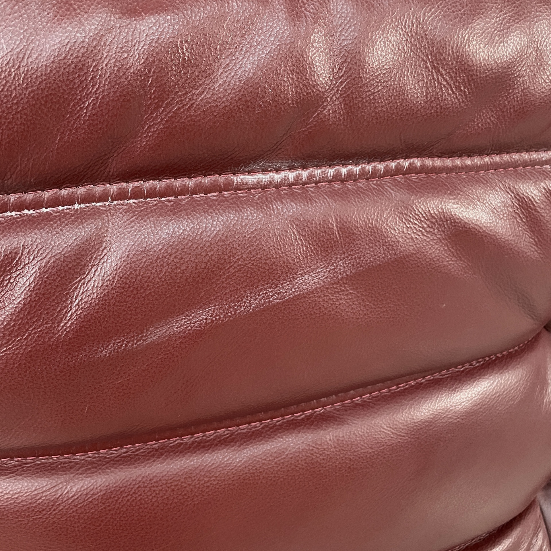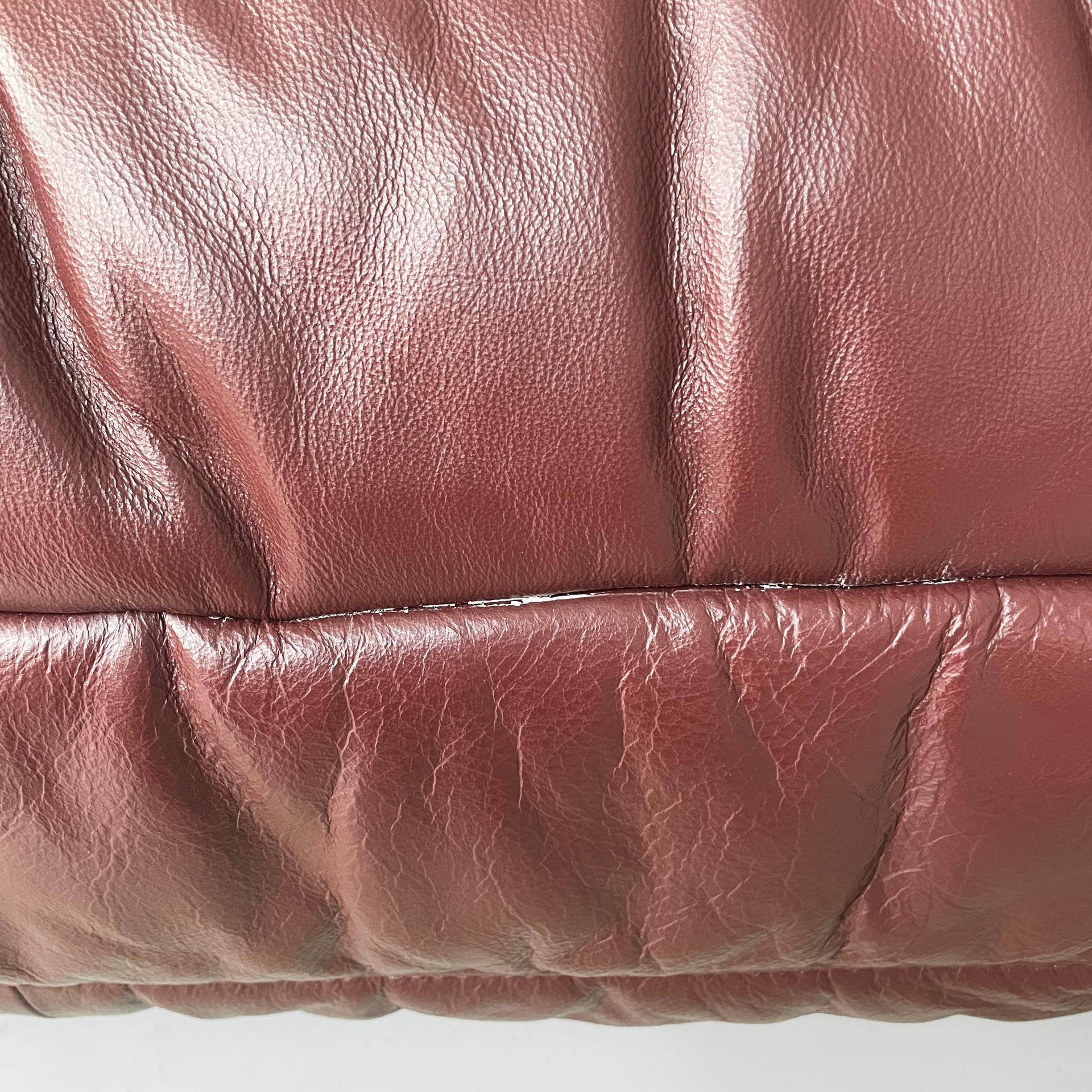 Divano modulare modello Togo interamente imbottito e rivestito in pelle rosso vinaccia. Il divano è composto da un modulo angolare, un modulo a due posti, un modulo a tre posti e un modulo semplice. Ogni modulo è caratterizzato da una silhouette morbida e tondeggiante. Sulla seduta e sullo schienale sono presenti dei bottoni. I moduli possono essere posizionati a piacere, possono essere anche usati come poltrone o piccoli divani.