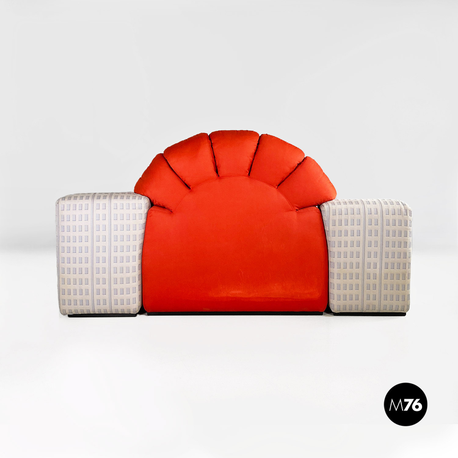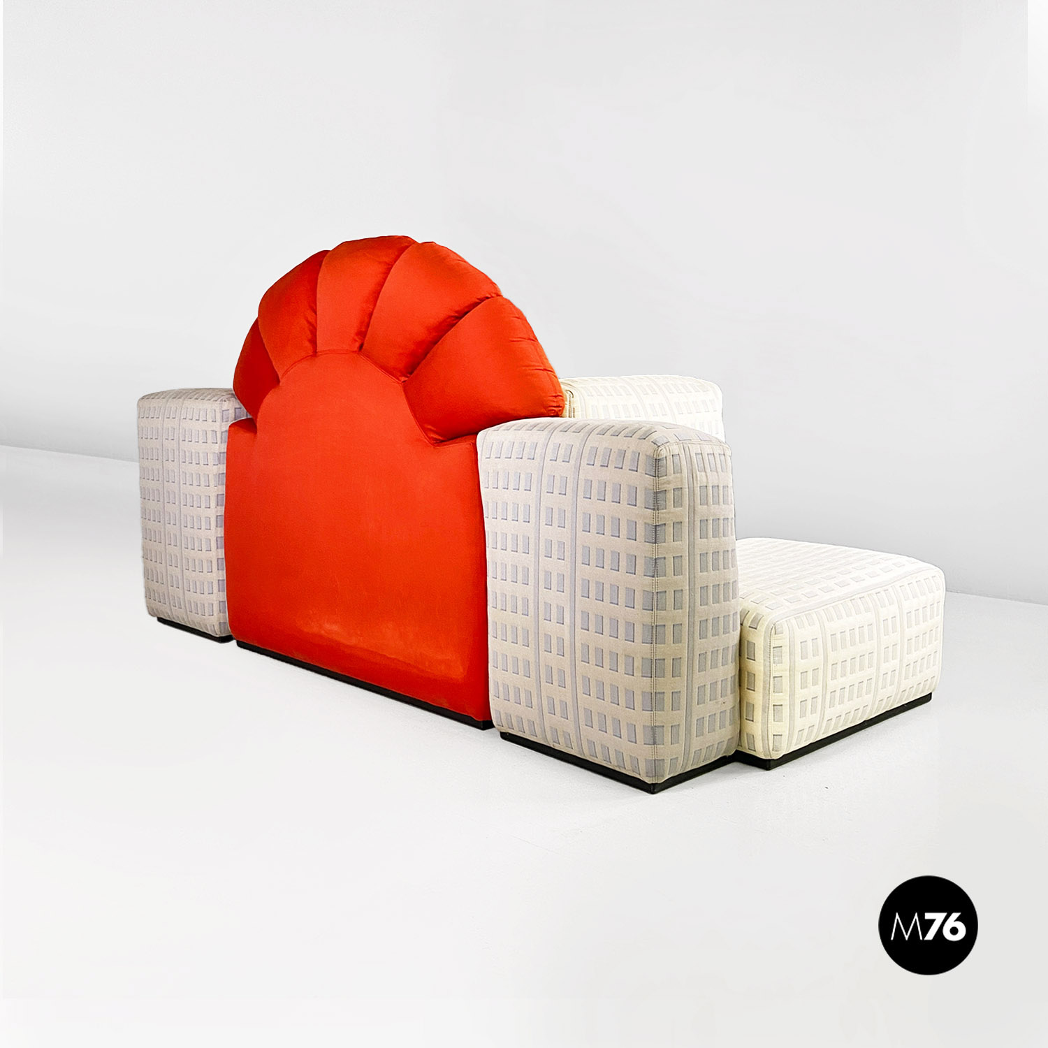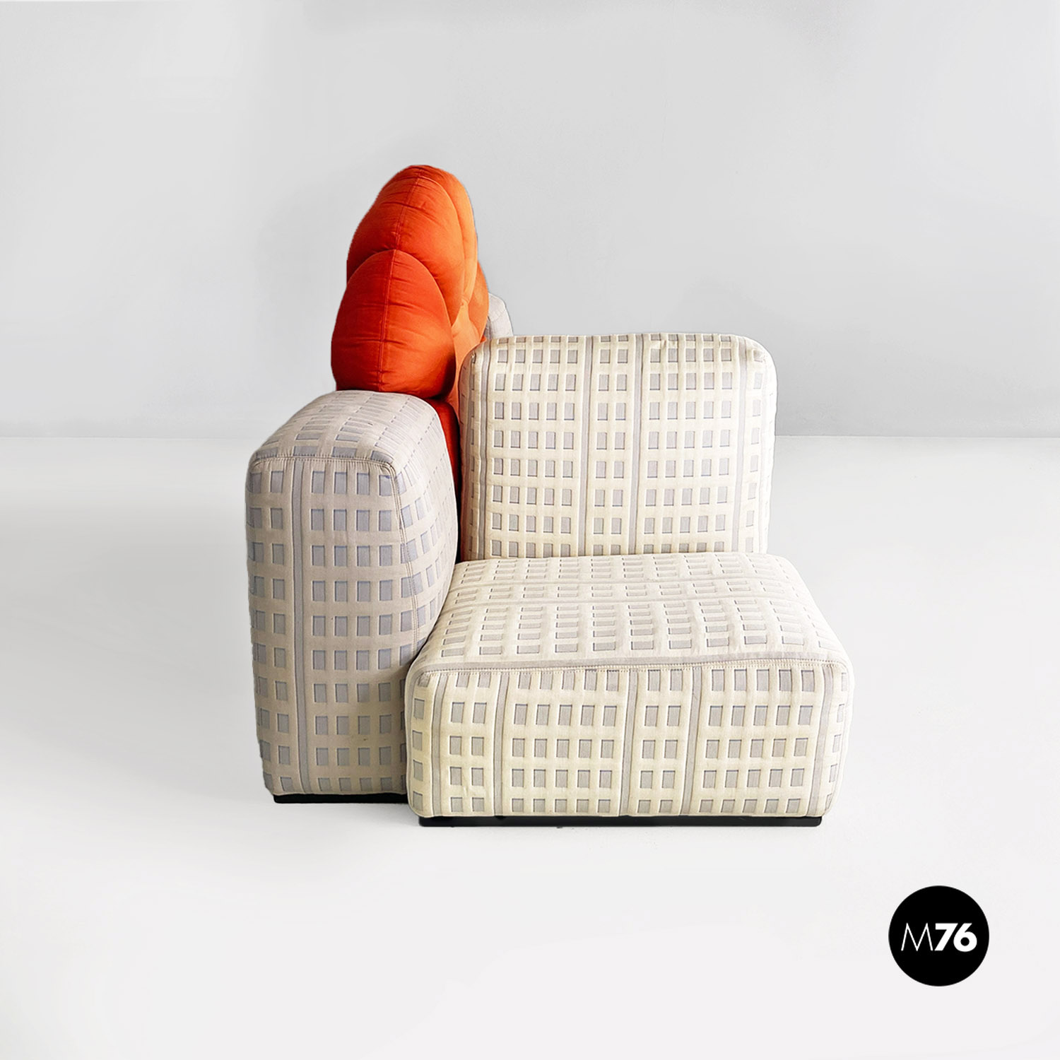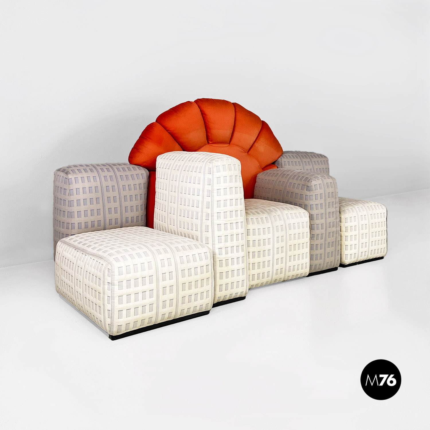 Divano modulare modello Tramonto a New York formato da otto pezzi tra grattacieli e sole. I grattacieli imbottiti fanno da sedute e braccioli e schienali e sono rivestiti in un tessuto con trama a rilievo che accosta il chiaro allo scuro ricreando l’effetto della luce che si riflette sulle finestre. A contrasto il sole che funge da grande schienale centrale rimane a contrasto con un acceso raso arancione rosso scompare al centro tra gli edifici dello schienale.