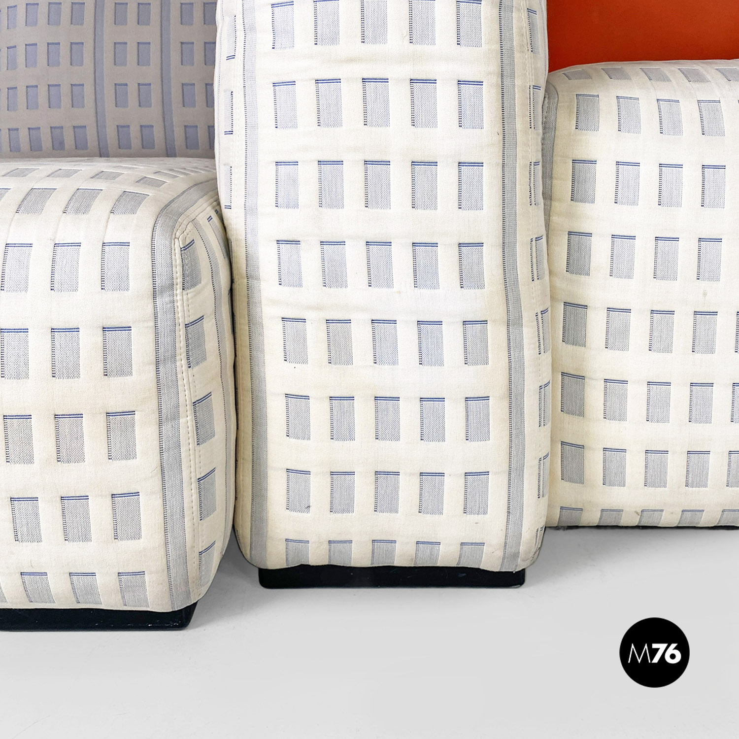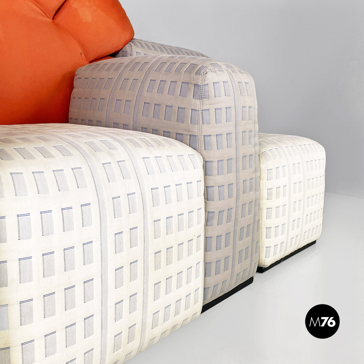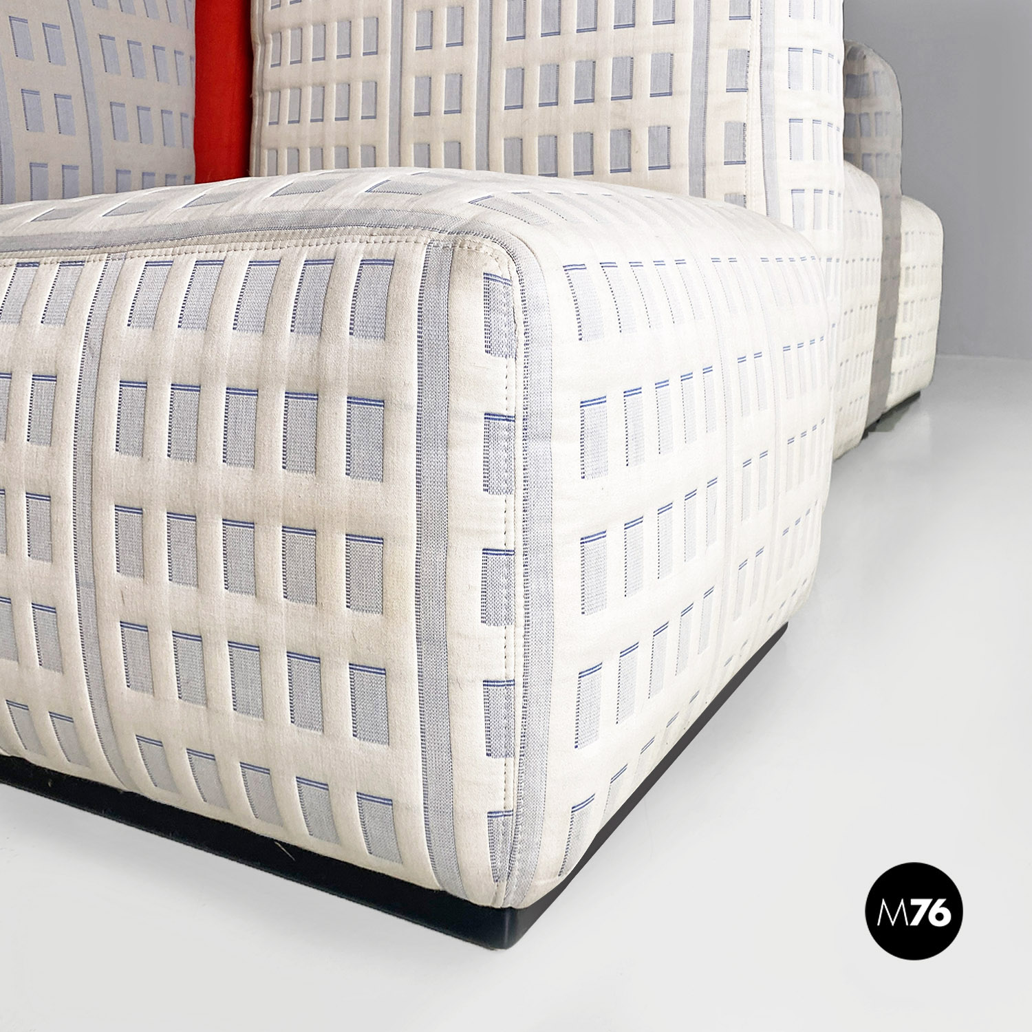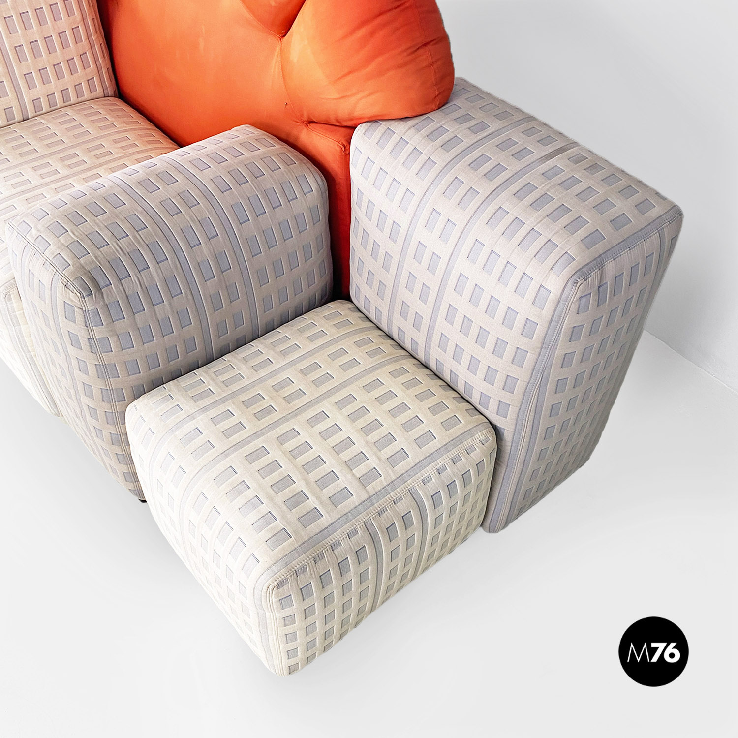 Divano modulare modello Tramonto a New York formato da otto pezzi tra grattacieli e sole. I grattacieli imbottiti fanno da sedute e braccioli e schienali e sono rivestiti in un tessuto con trama a rilievo che accosta il chiaro allo scuro ricreando l’effetto della luce che si riflette sulle finestre. A contrasto il sole che funge da grande schienale centrale rimane a contrasto con un acceso raso arancione rosso scompare al centro tra gli edifici dello schienale.