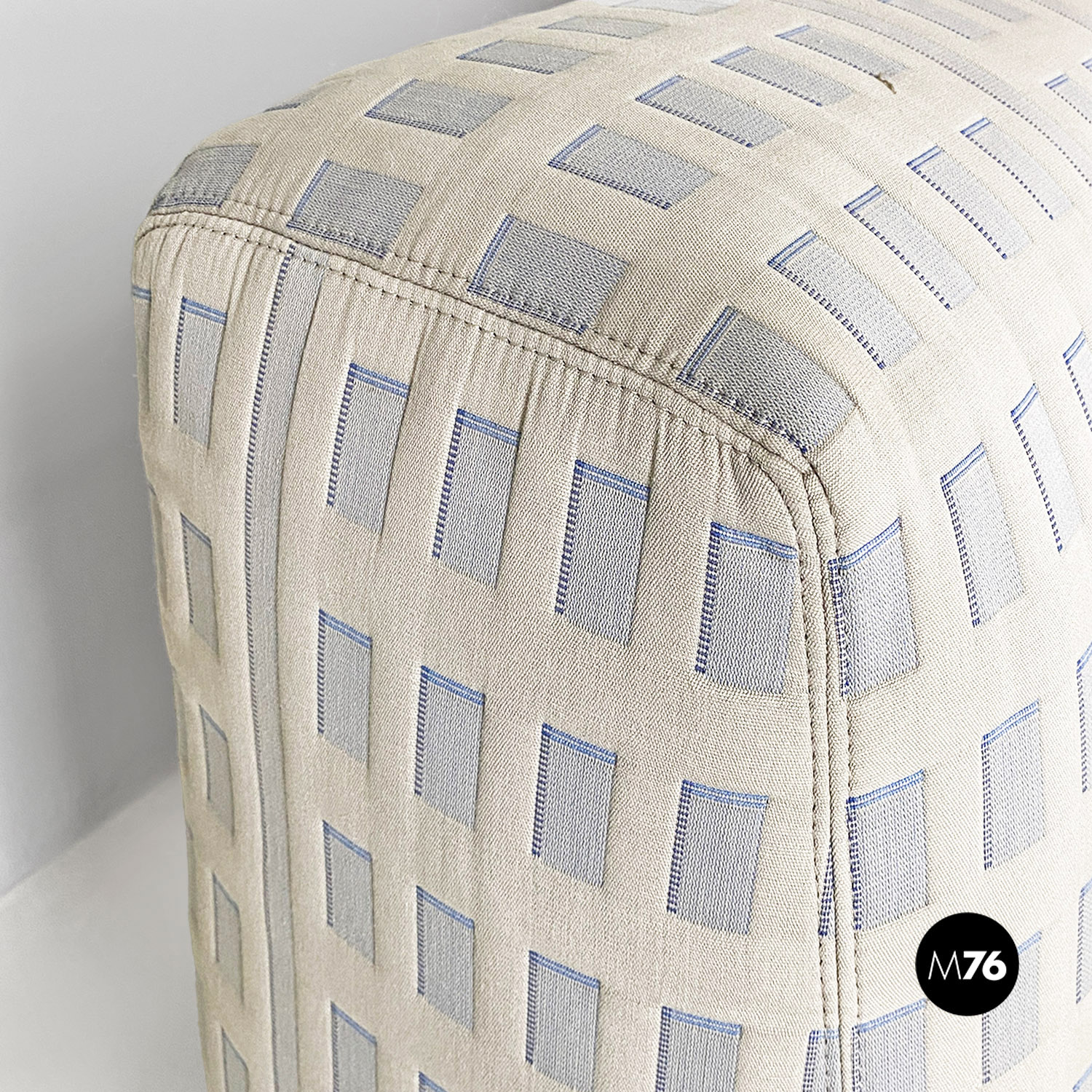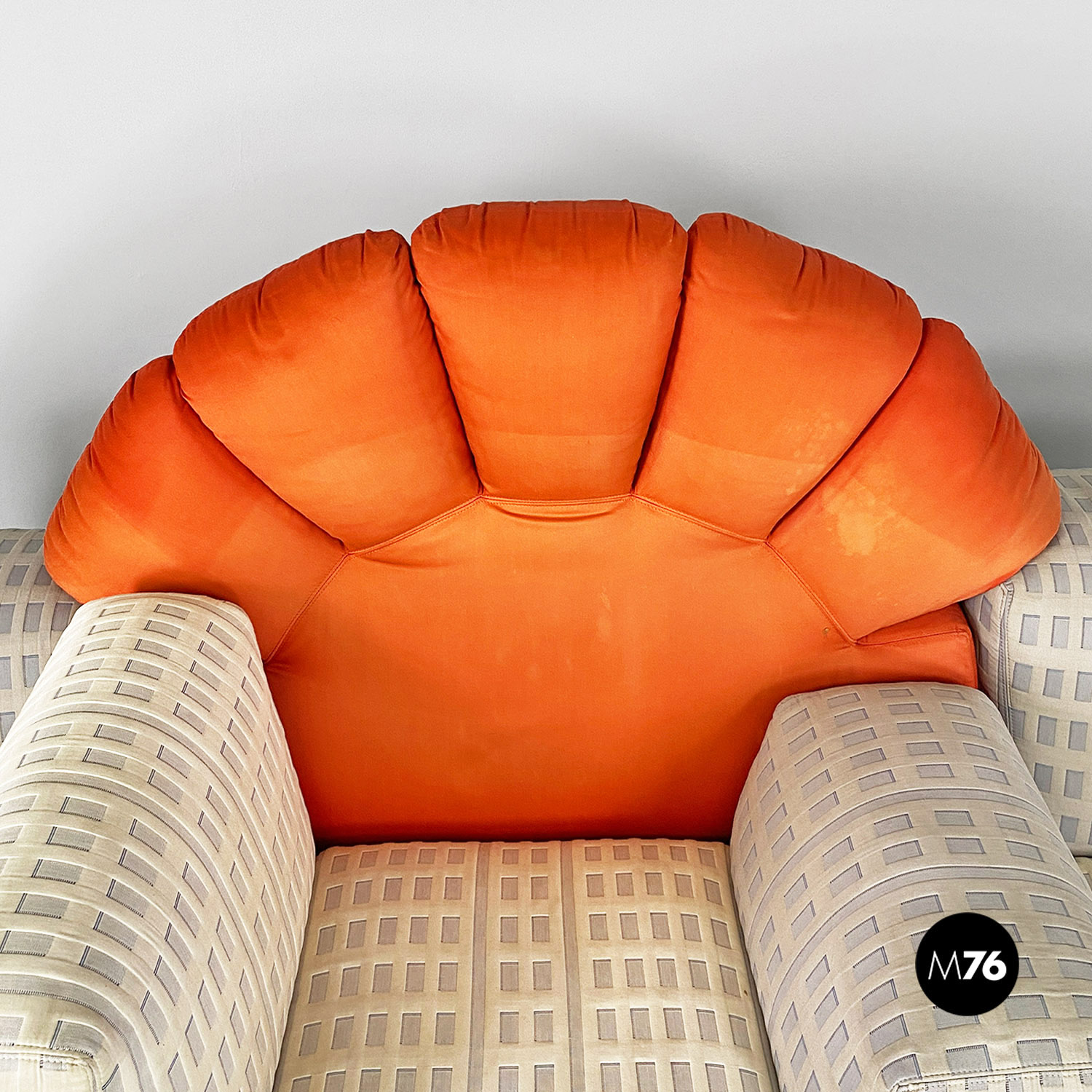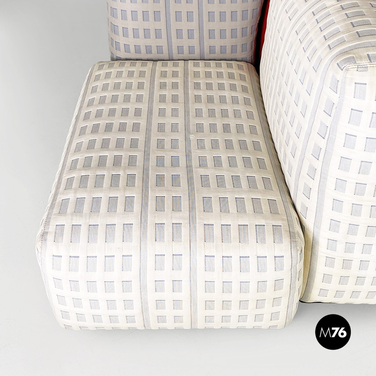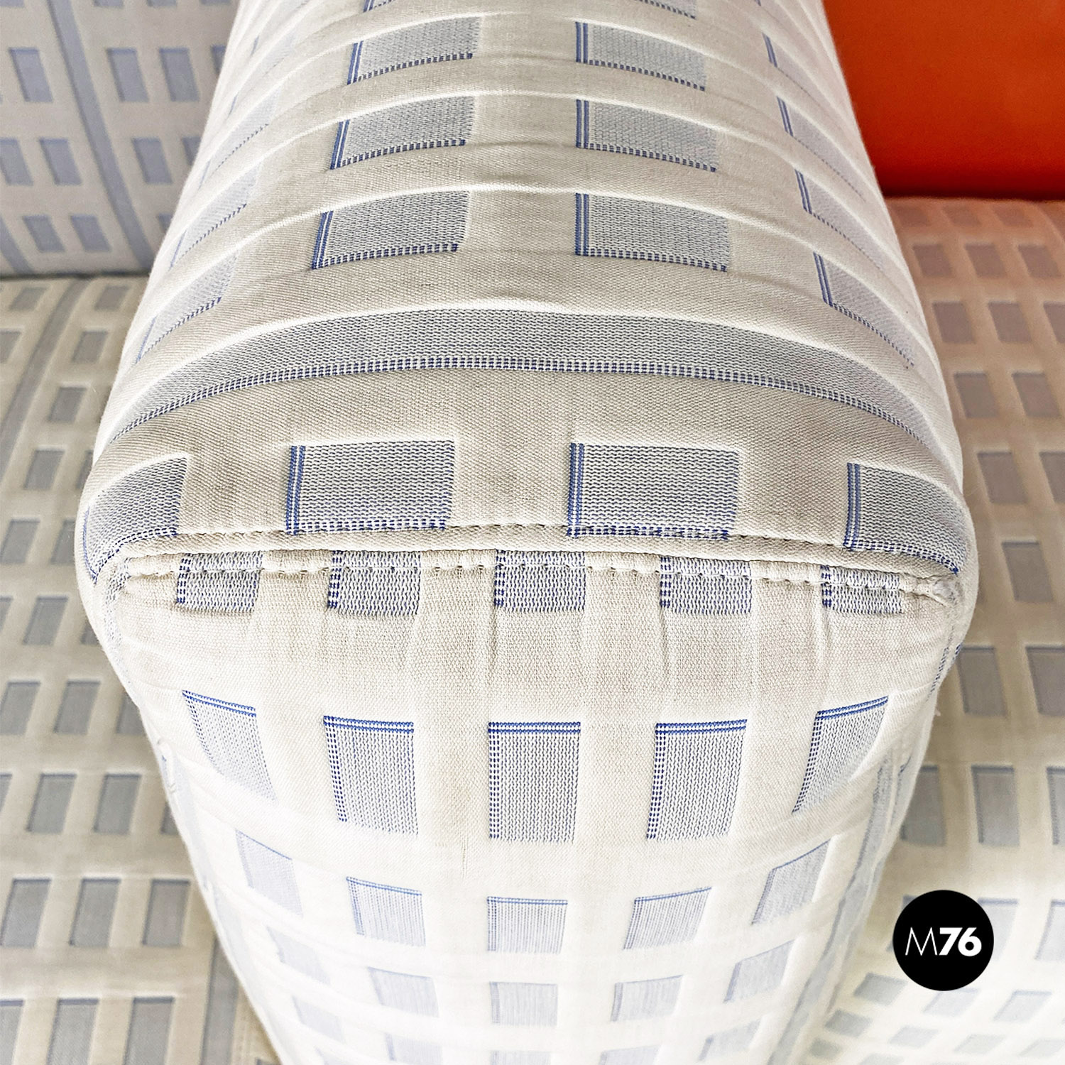 Divano modulare modello Tramonto a New York formato da otto pezzi tra grattacieli e sole. I grattacieli imbottiti fanno da sedute e braccioli e schienali e sono rivestiti in un tessuto con trama a rilievo che accosta il chiaro allo scuro ricreando l’effetto della luce che si riflette sulle finestre. A contrasto il sole che funge da grande schienale centrale rimane a contrasto con un acceso raso arancione rosso scompare al centro tra gli edifici dello schienale.