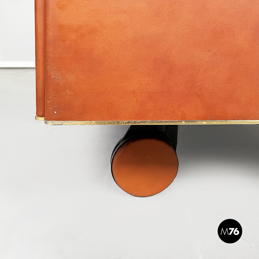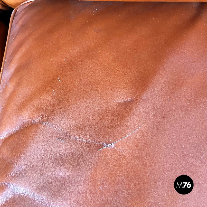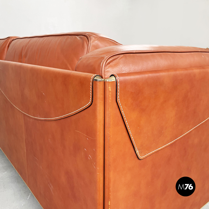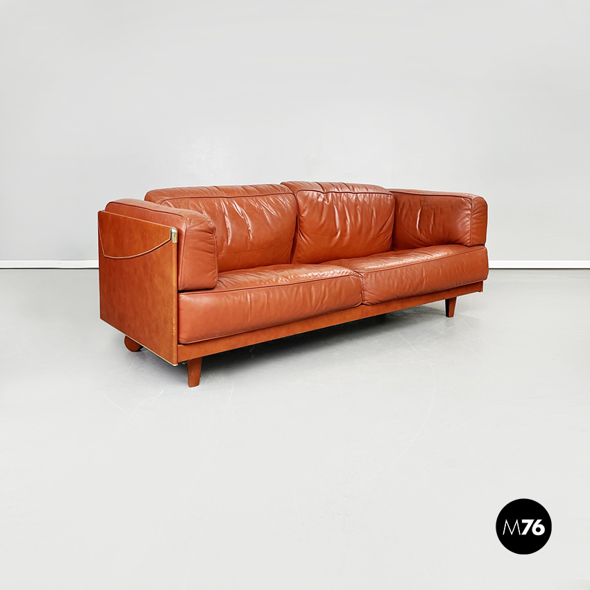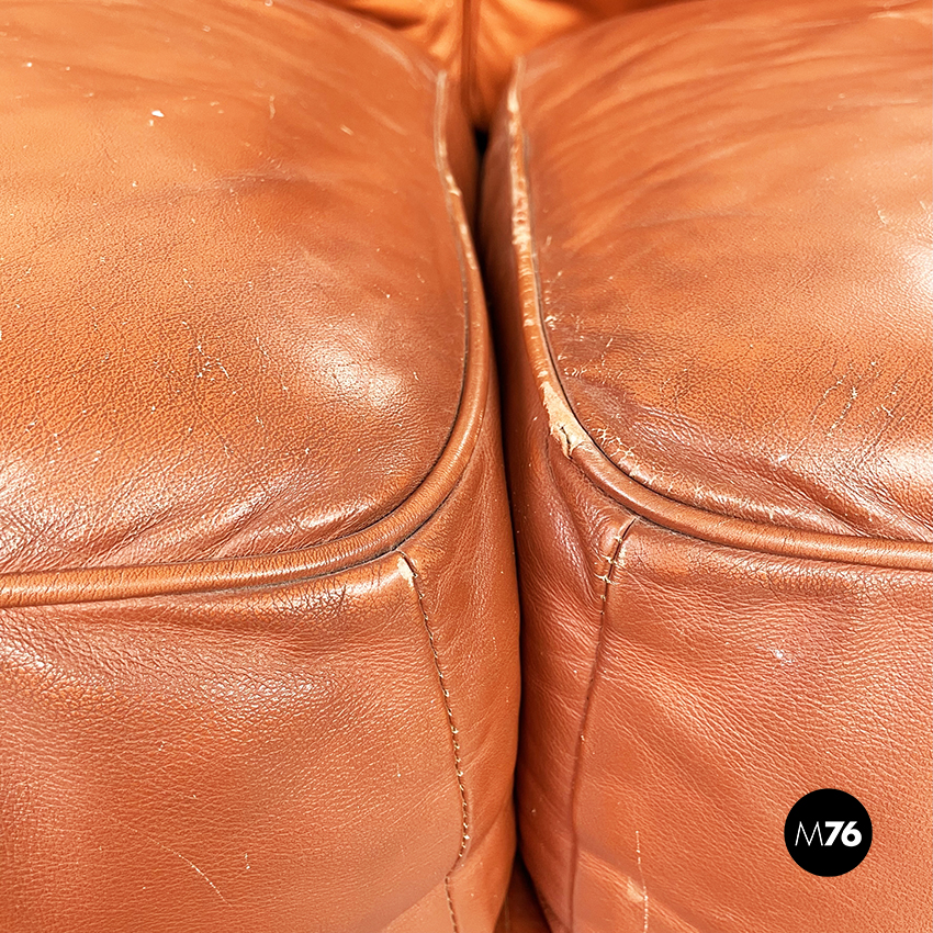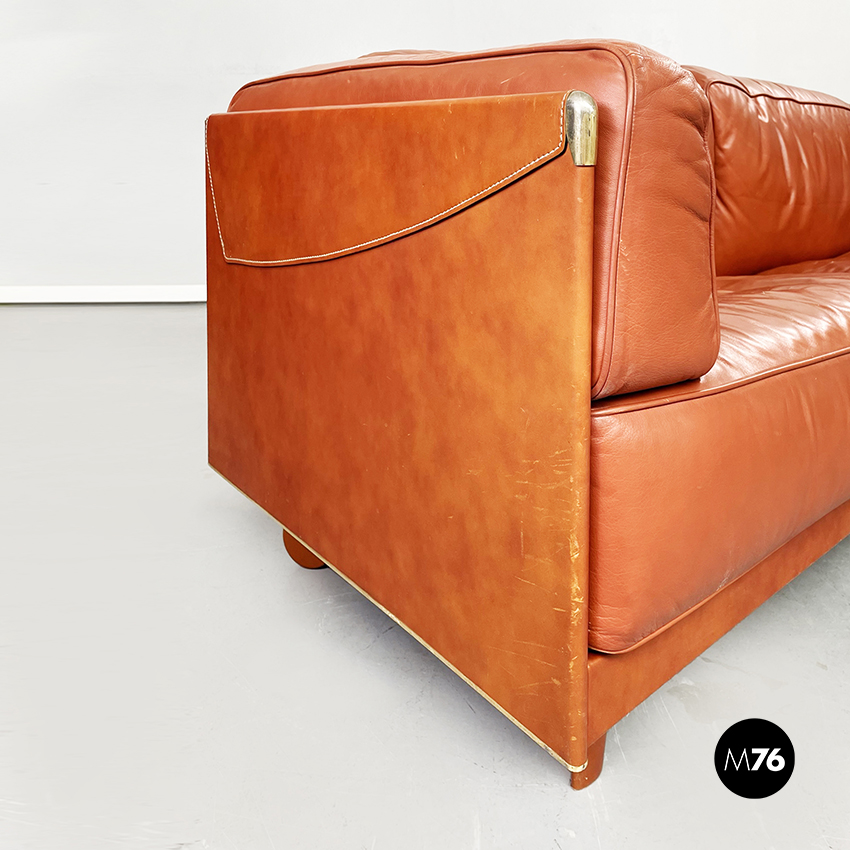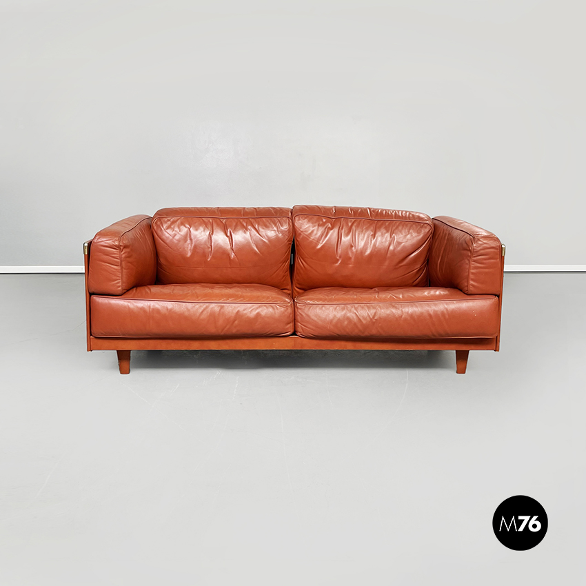 Divano a due posti modello Twice in pelle marrone. La seduta è composta da due cuscini in pelle color cognac come lo schienale. I braccioli sono due cuscini posti in verticale. La struttura esterna è rivestita in cuoio marrone con cucitura a vista e dettagli in metallo cromato. Sulla parte frontale presenta dei piedini mentre nella parte posteriore due ruote.