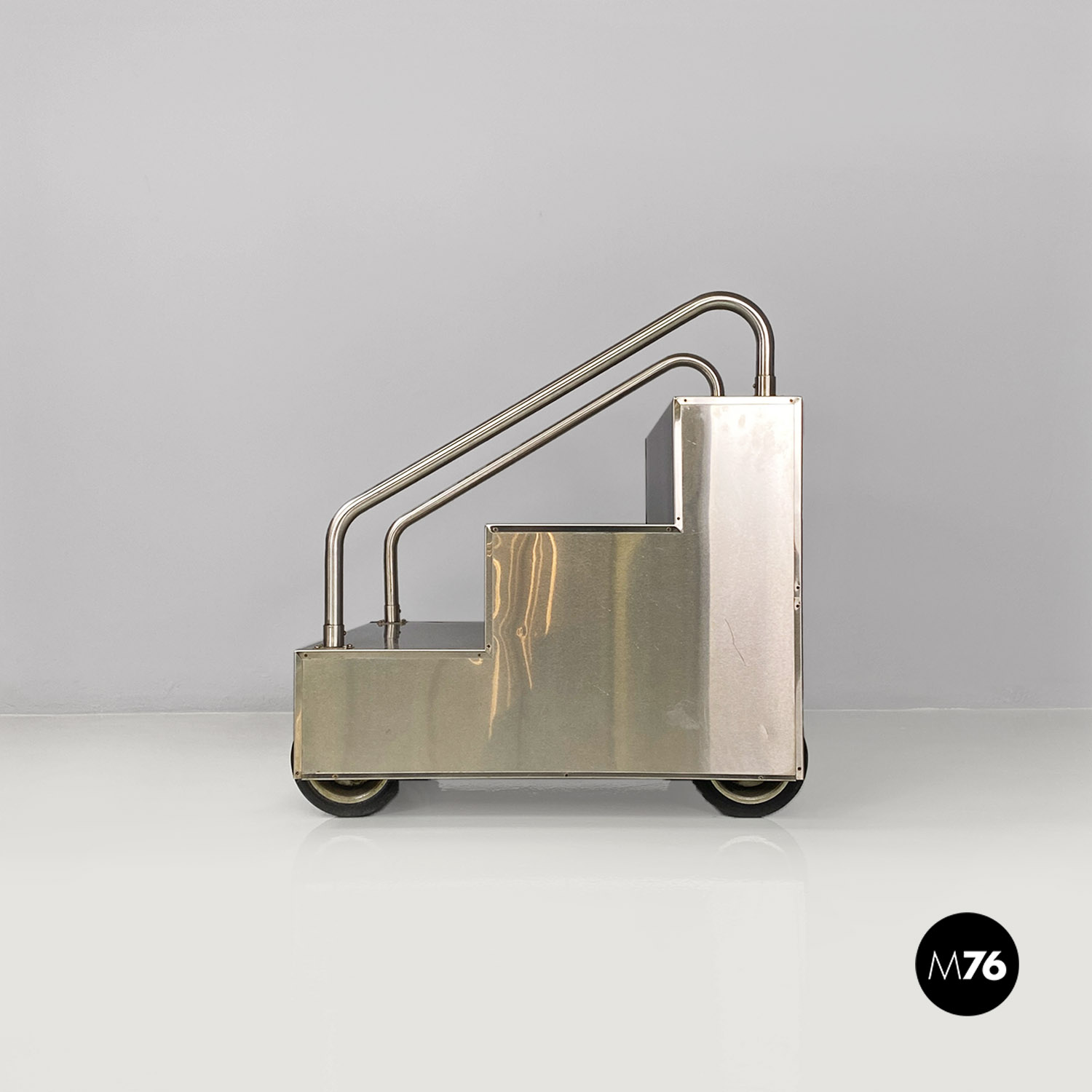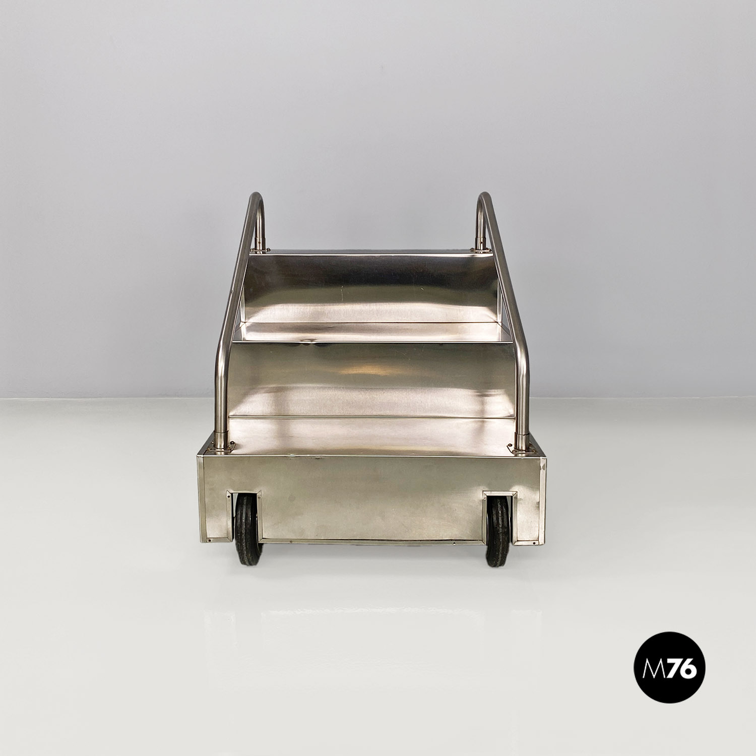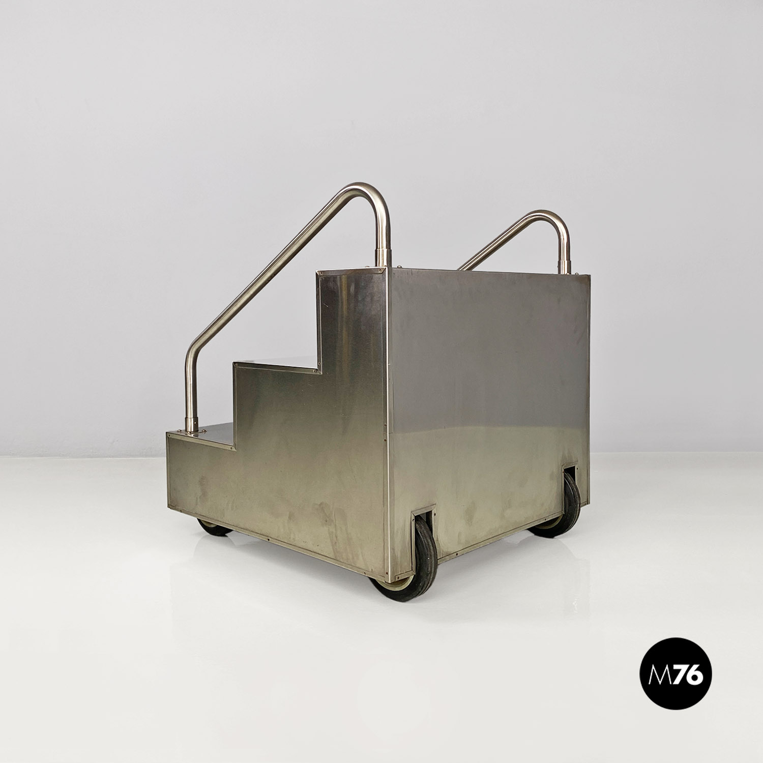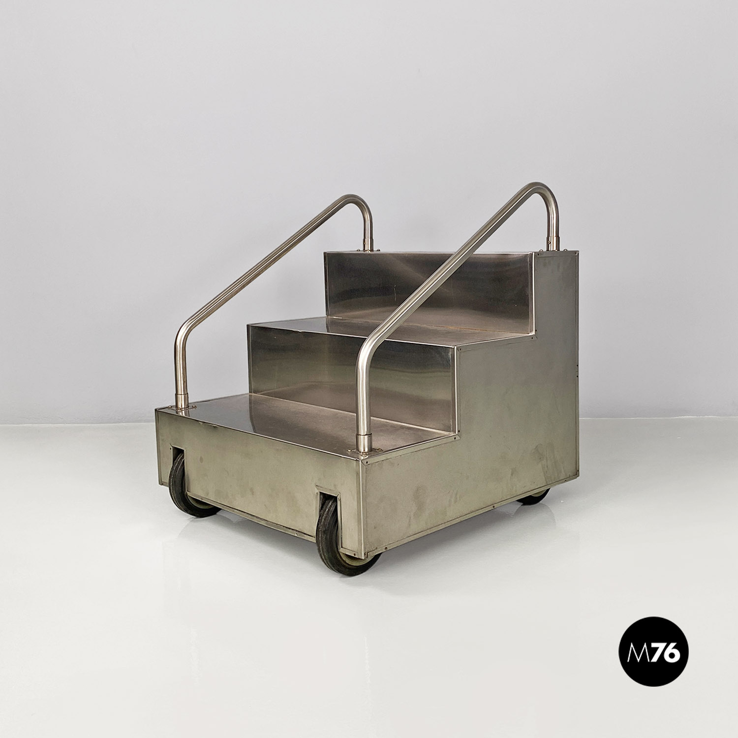 Mobile espositore con forma a scala su ruote con struttura in legno rivestita in acciaio con corrimano e ruote in gomma.