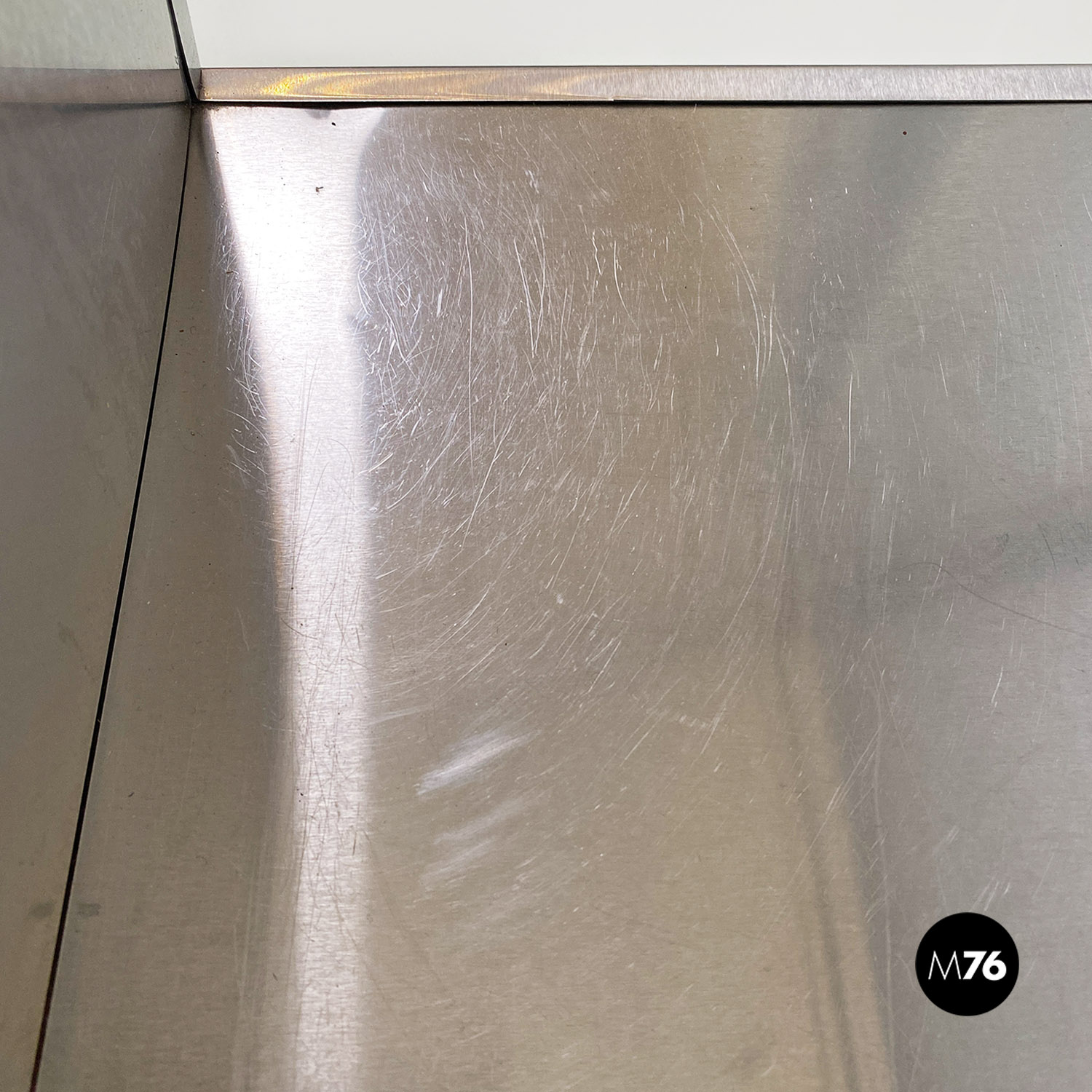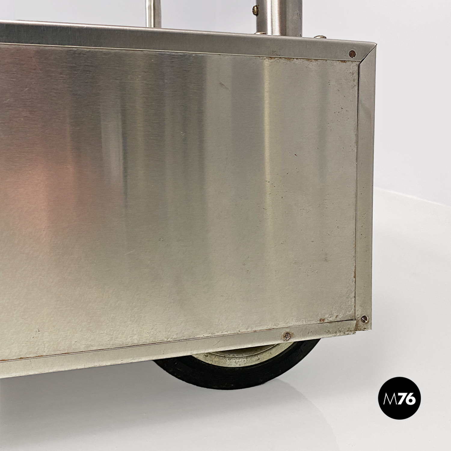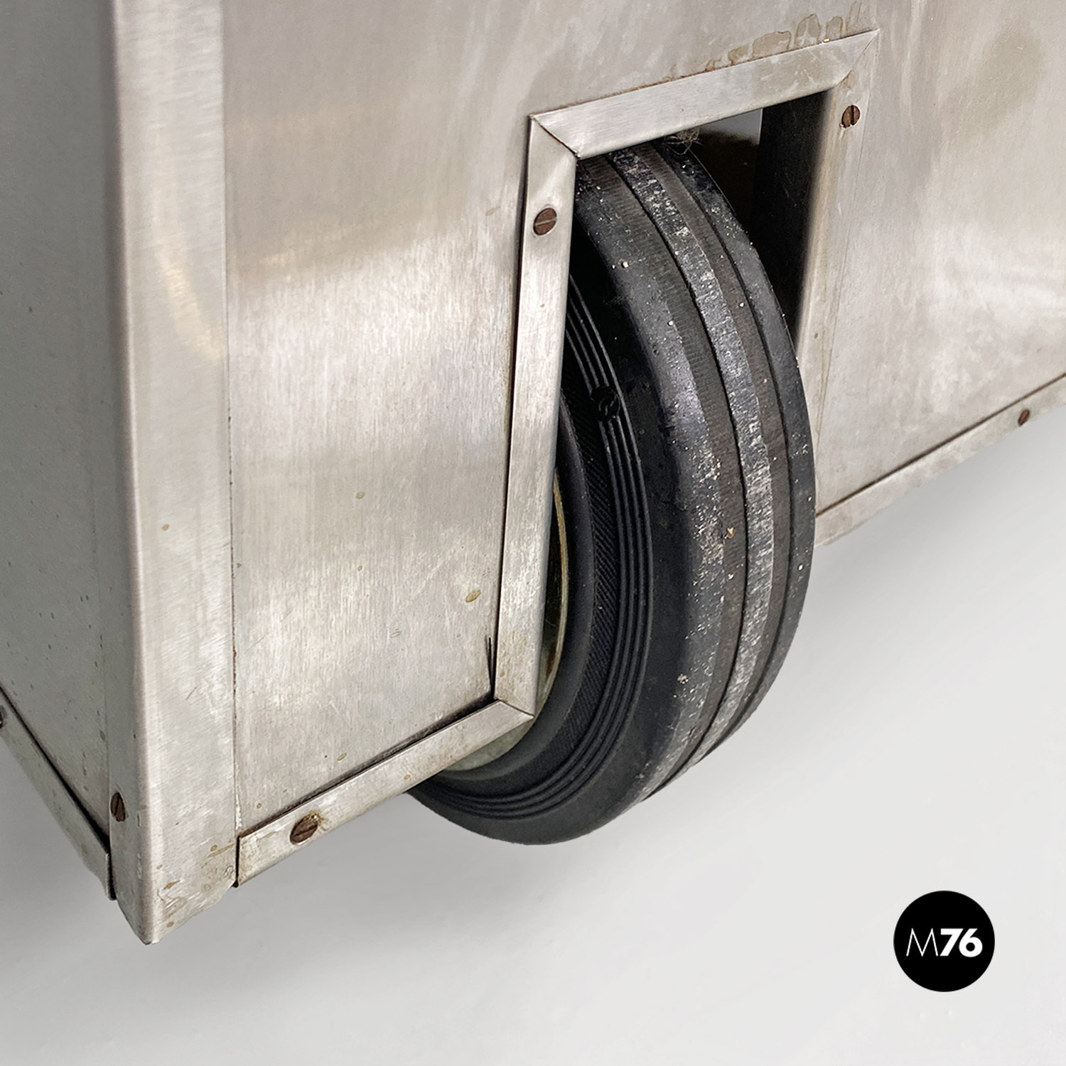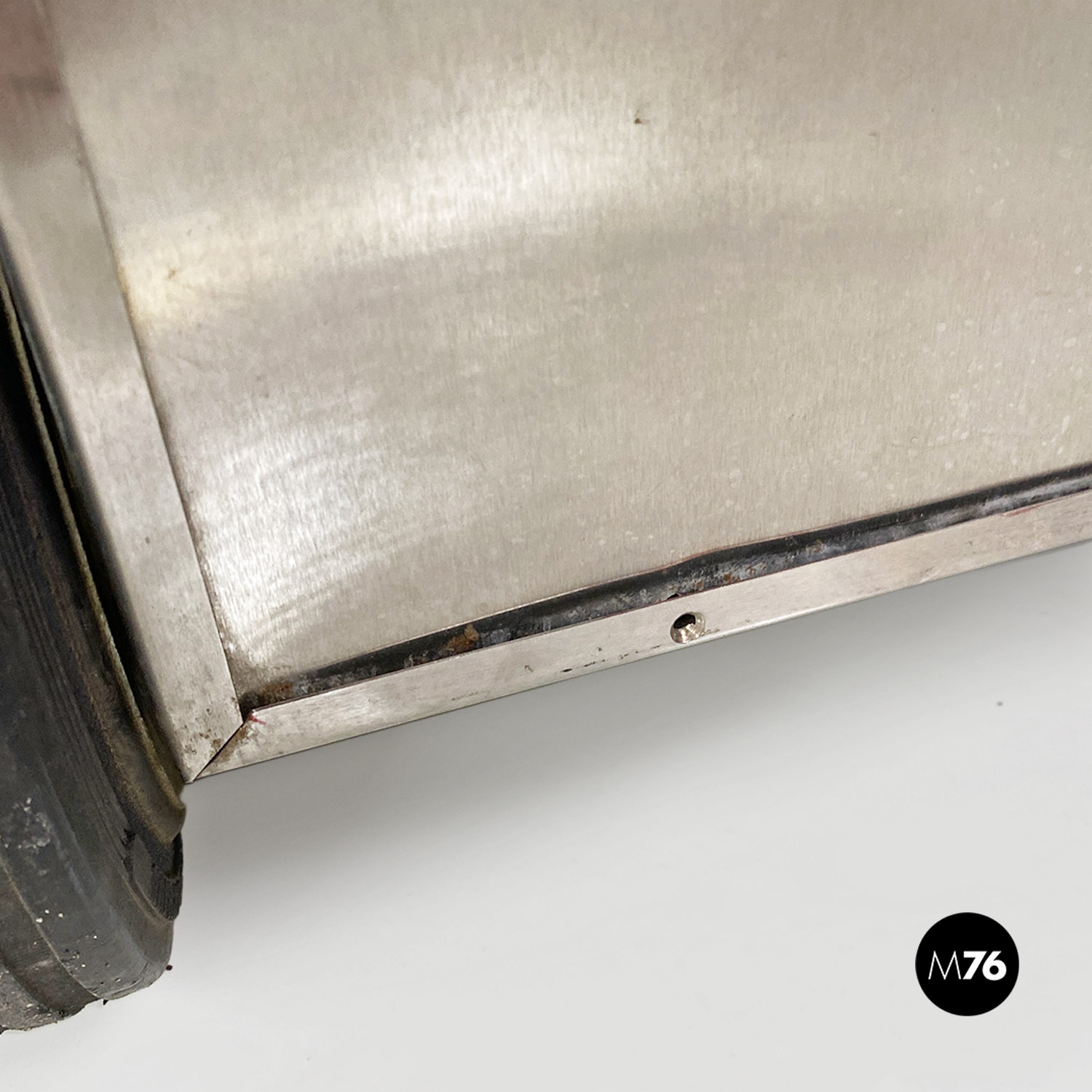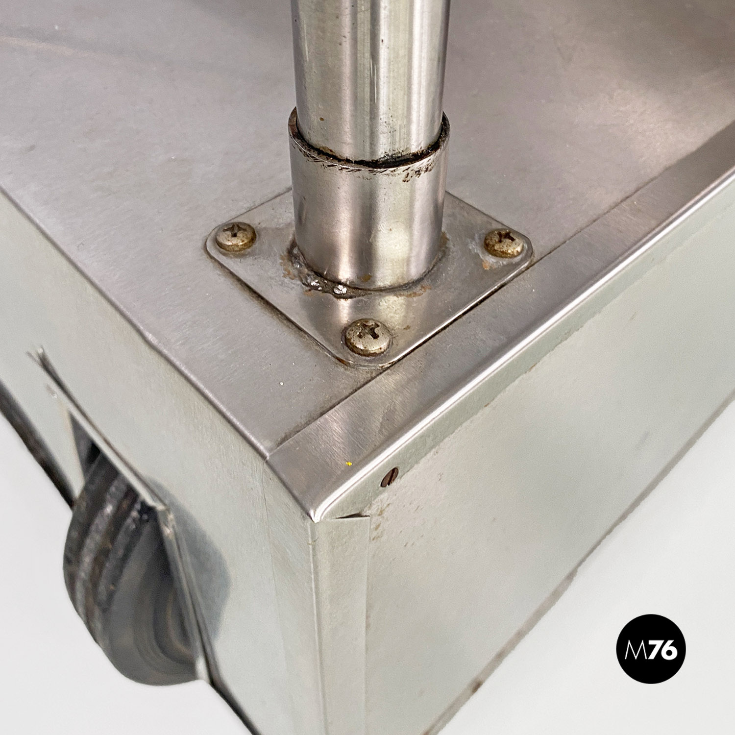 Mobile espositore con forma a scala su ruote con struttura in legno rivestita in acciaio con corrimano e ruote in gomma.
