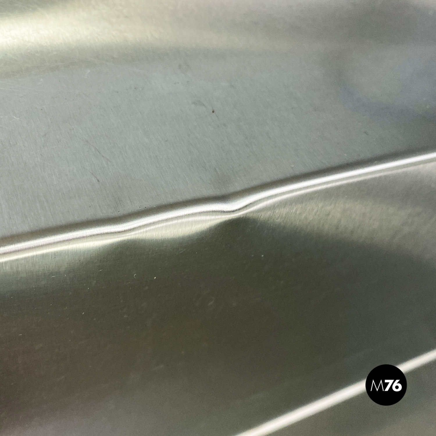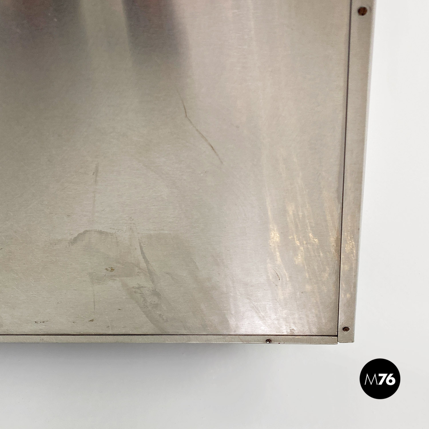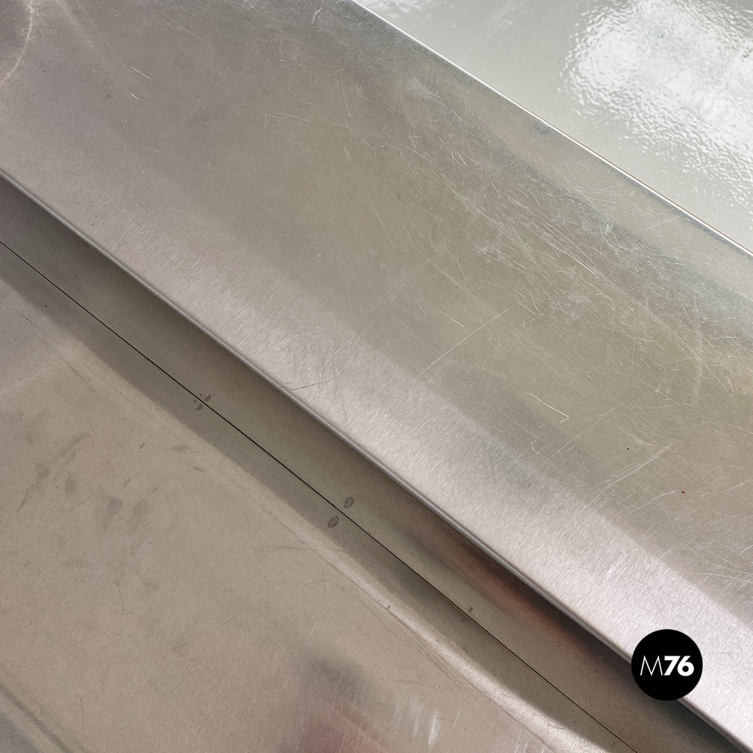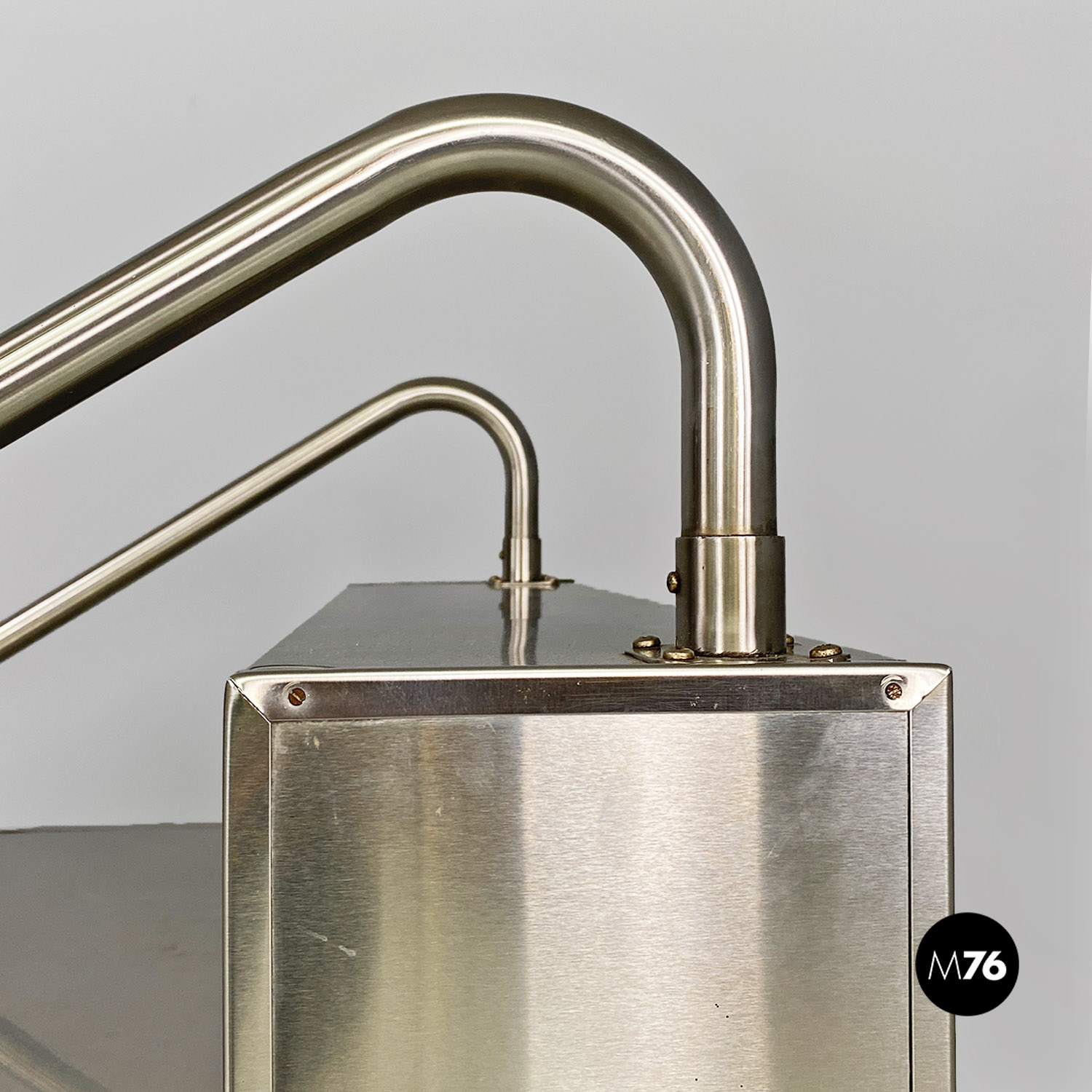 Mobile espositore con forma a scala su ruote con struttura in legno rivestita in acciaio con corrimano e ruote in gomma.
