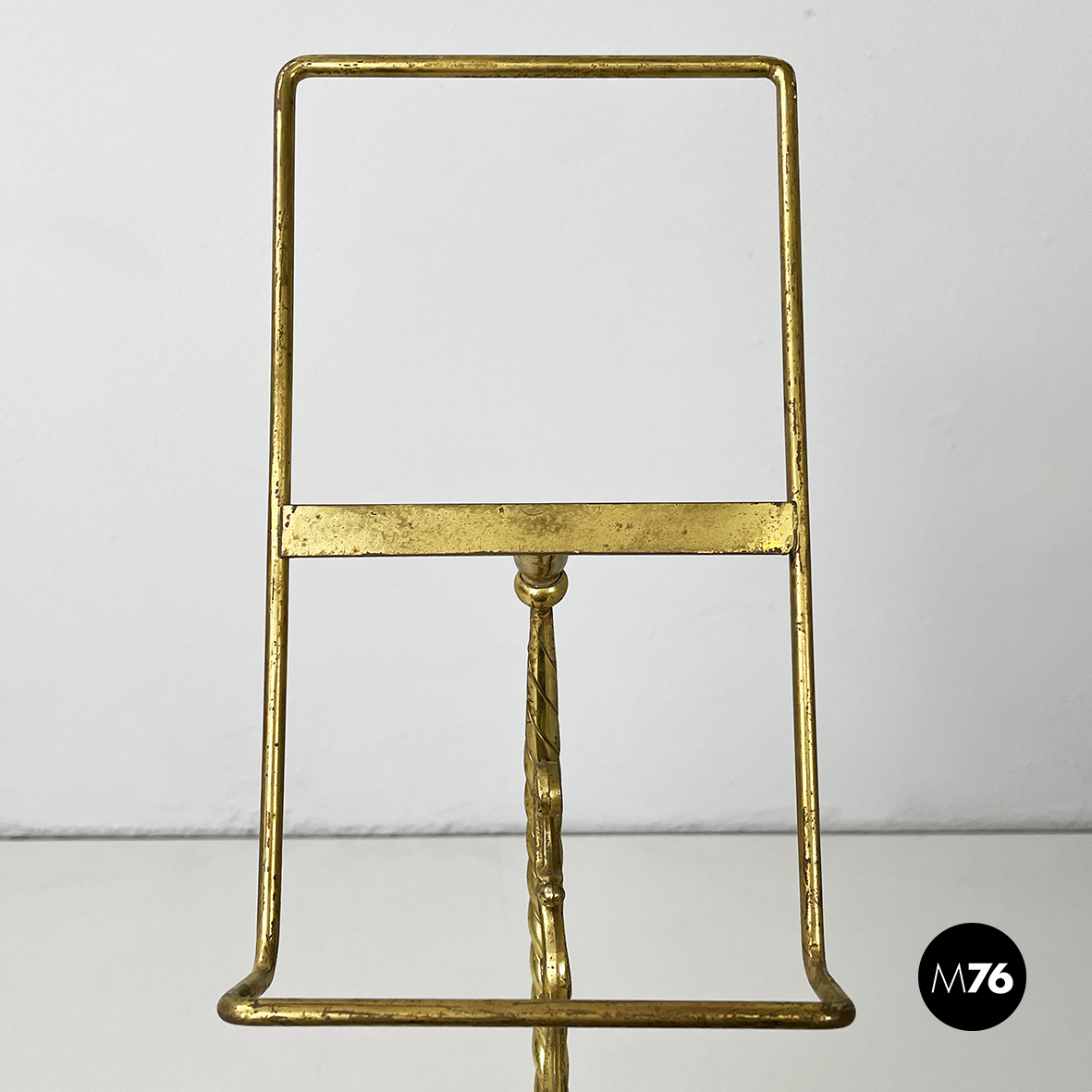 Espositore da tavolo con doppio ripiano d’appoggio in ottone e bronzo. I due ripiani in tondino di ottone sono orientabili. La struttura è in tondino di ottone lavorato. La base triangolare in bronzo è lavorata con piedini a leone. Utilizzabile per esporre piccoli quadri o scarpe. In stile Impero.