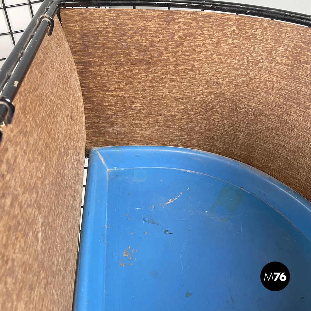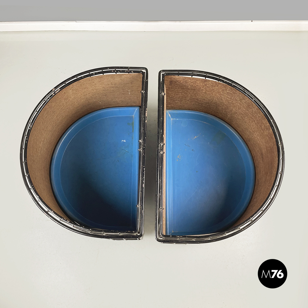 Coppia di fioriere portavasi a base semi-ovale in metallo legno e plastica. La struttura esterna è in tondino di metallo verniciato nero con pannelli in legno sottile verniciato bianco. Al centro è posto un piatto semi-ovale in plastica blu dove porre il vaso con la pianta. Alla base sono presenti 3 ruote. Adatti anche per uso esterno come il terrazzo il balcone o il giardino.
