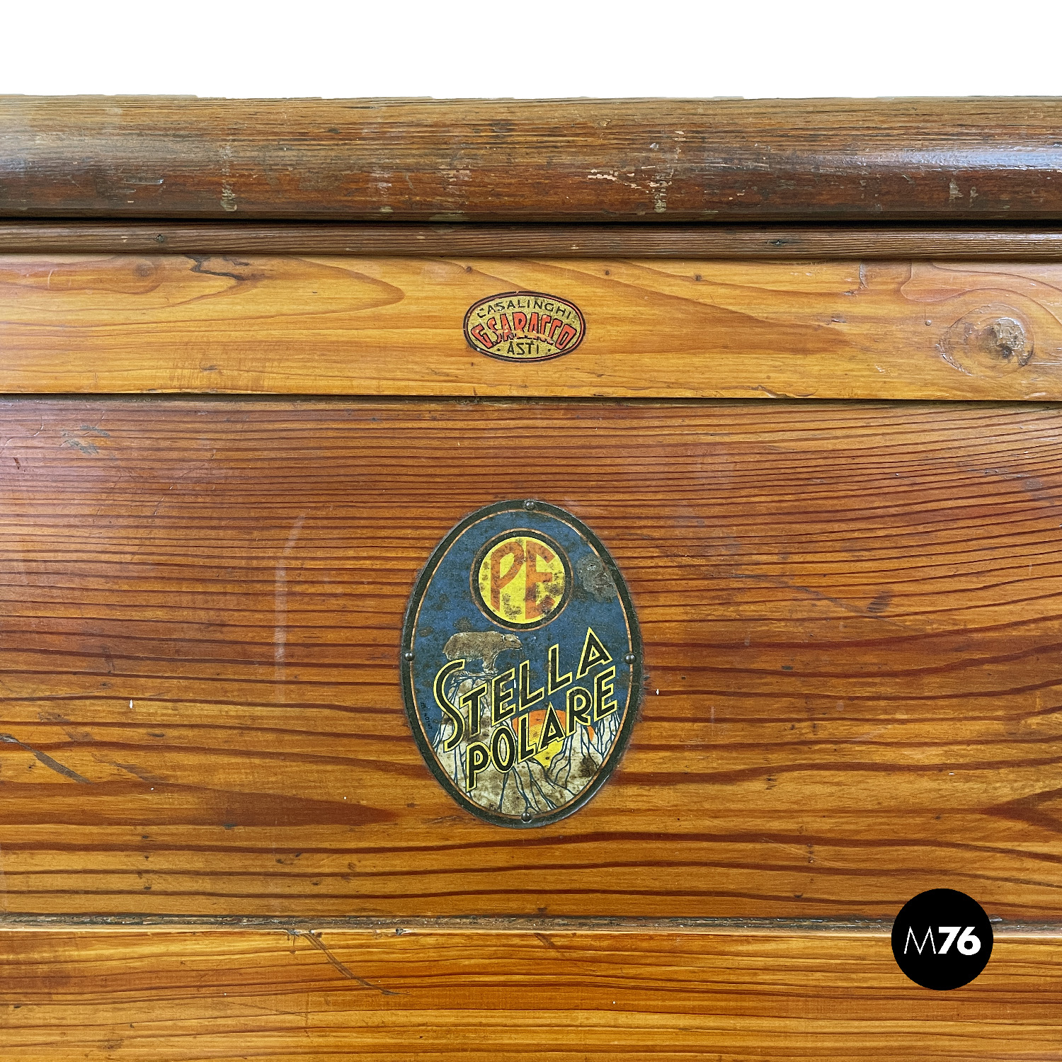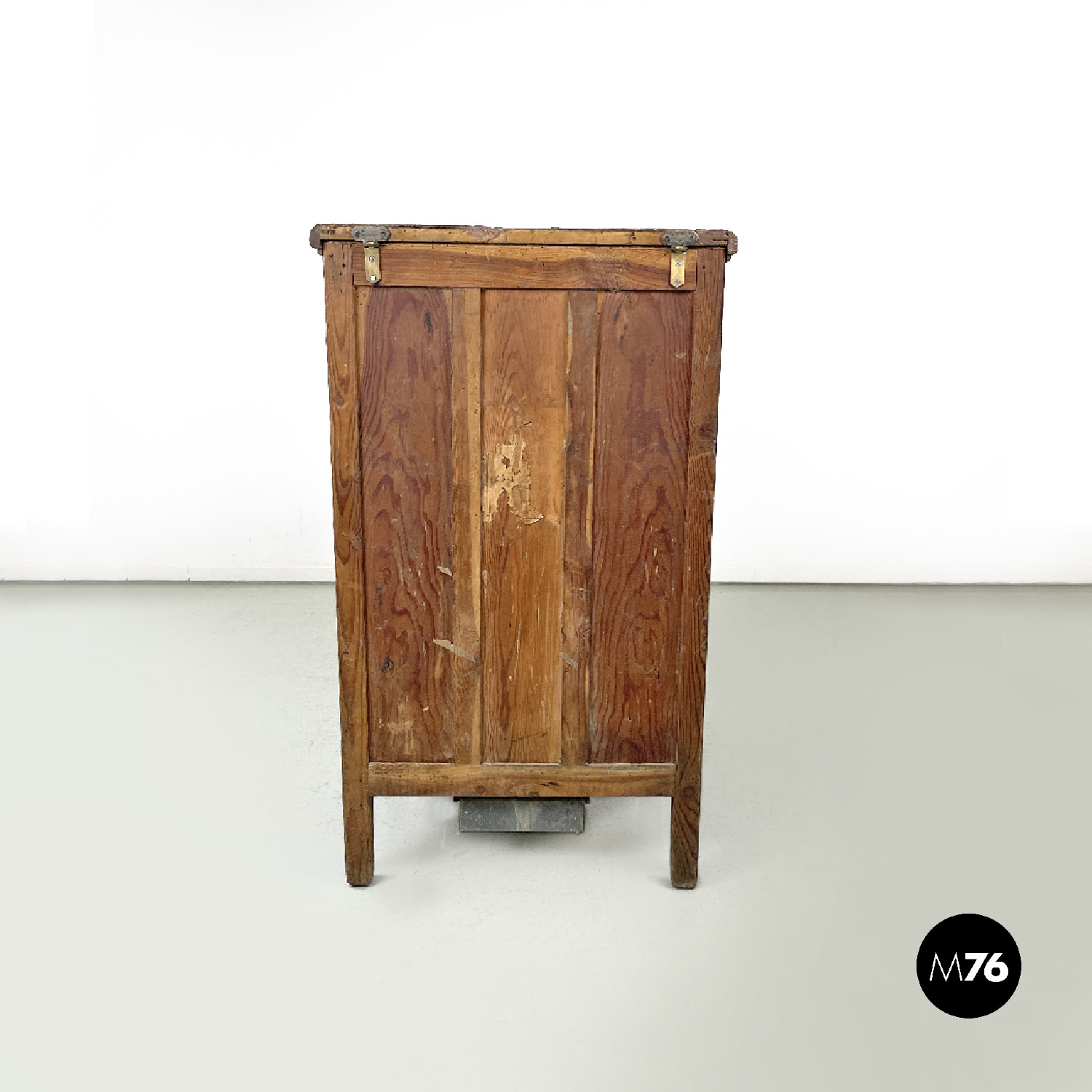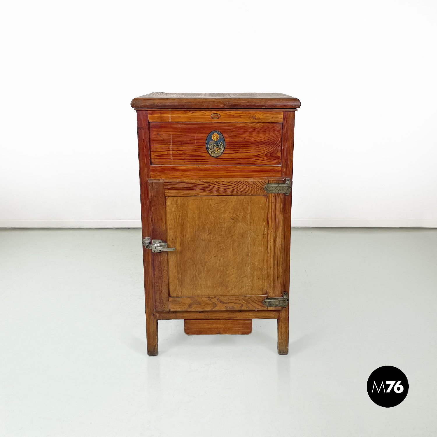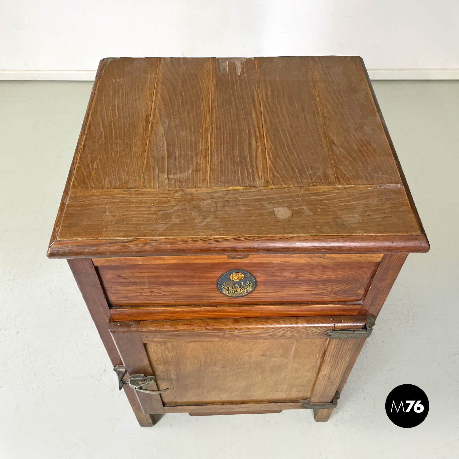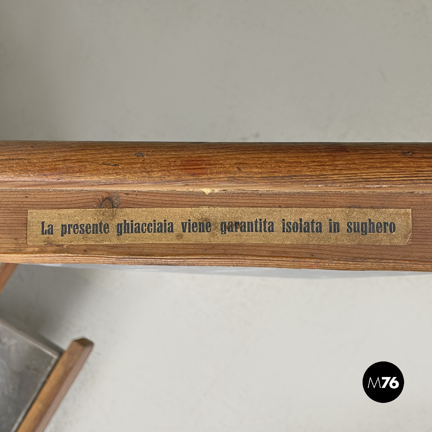 Ghiacciaia in legno a base rettangolare. Il piano superiore è un’apertura a pozzetto che si apre su uno scompartimento in zinco. Nella parte frontale si trova un’anta con due cerniere ai lati e una chiusura in ottone che si apre alla parte interna dove si trova un piccolo divisorio in metallo. Nella parte in basso si trova un piccolo cassetto con il fronte in legno e la struttura in zinco.