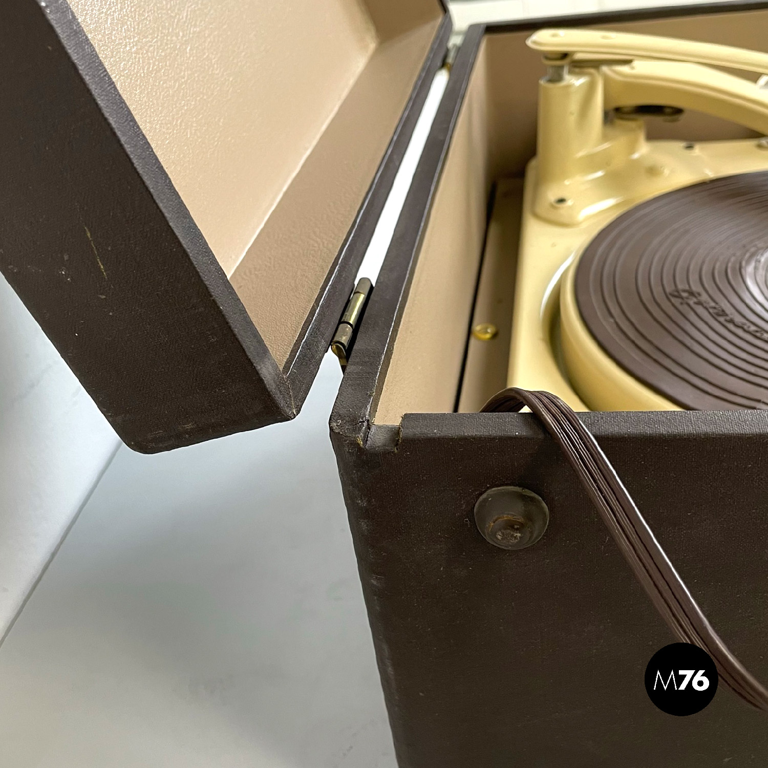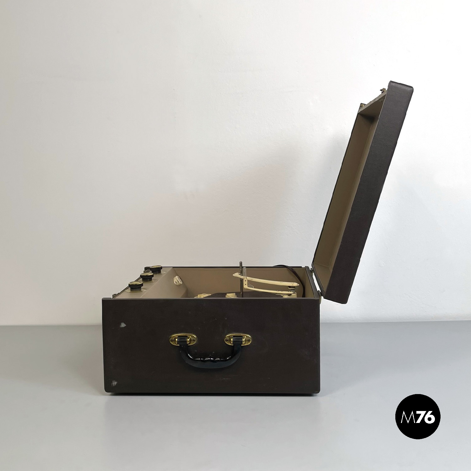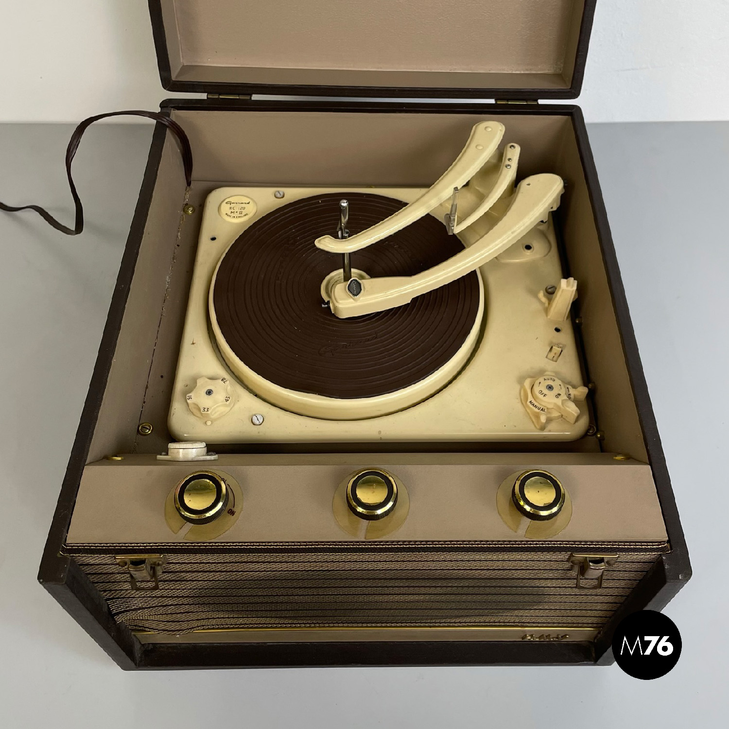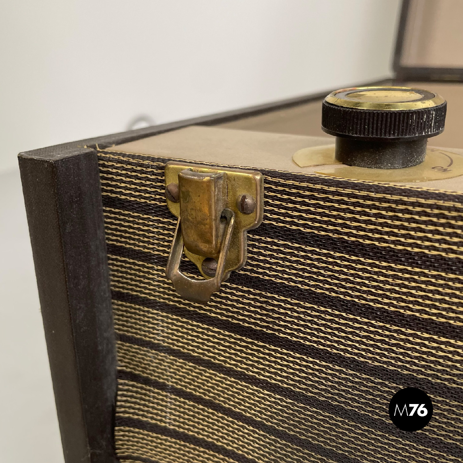 Giradischi a valigetta rettangolare. Struttura in legno marrone scuro e chiaro. La parte del giradischi si trova allu0027interno della valigetta insieme ai suoi diversi componenti. Una volta chiusa la valigetta contiene tutto al suo interno. Sulla struttura si trova su un lato un manico sullu0027altro quattro piedini di plastica nera e sul lato frontale una parte di tessuto con due chiusure in ottone.