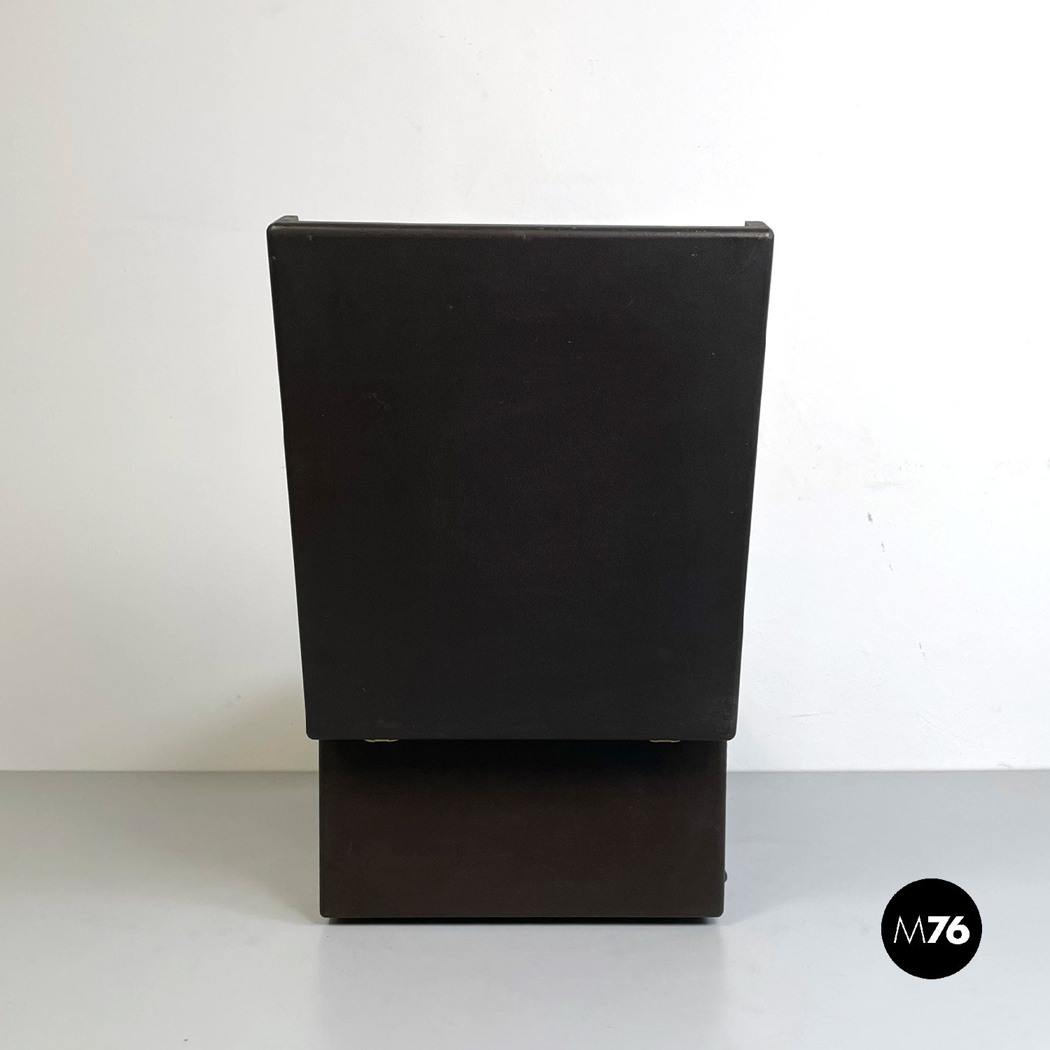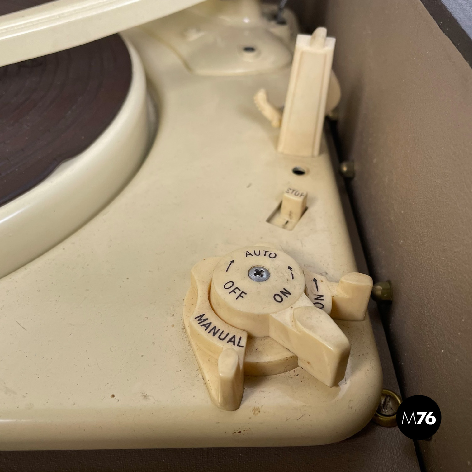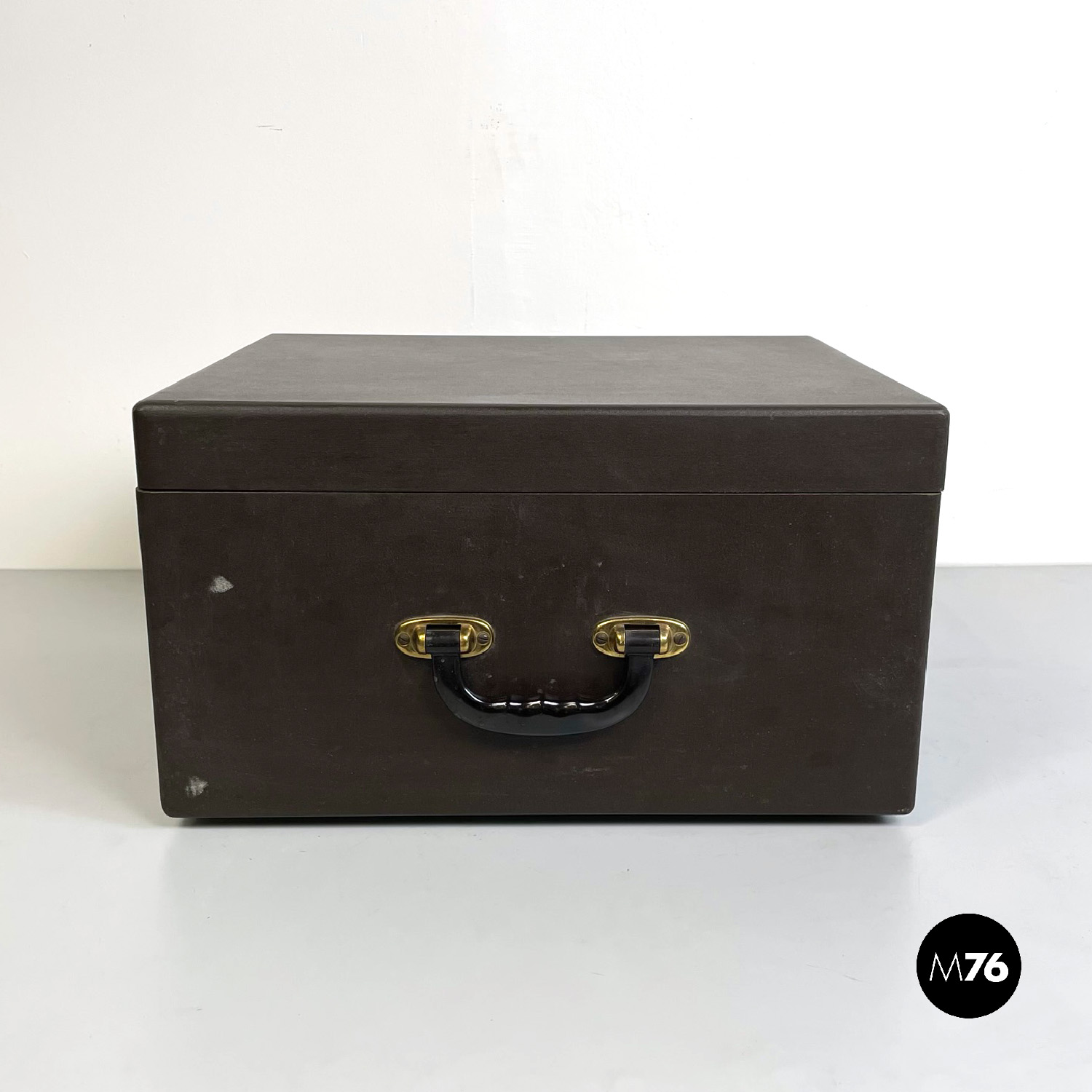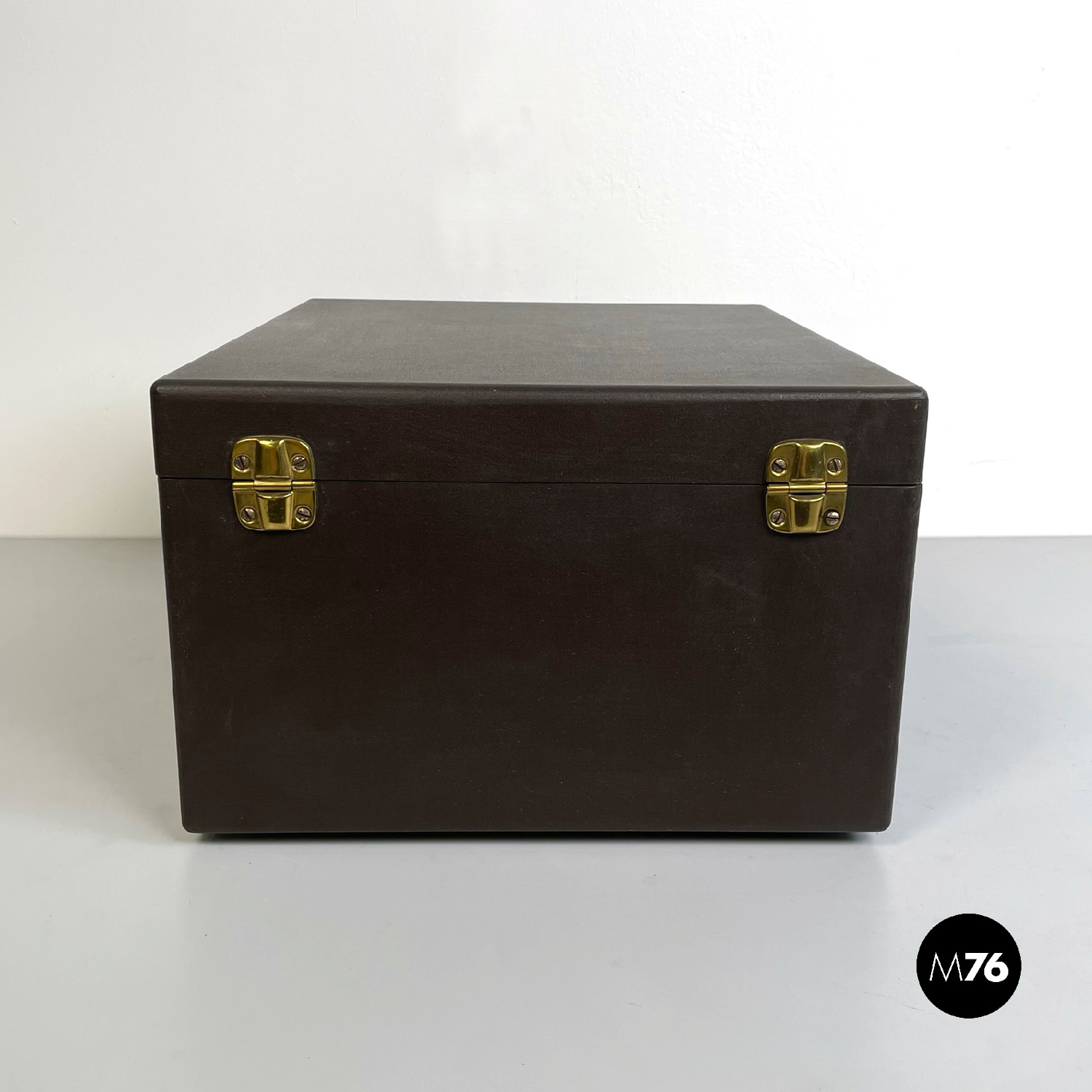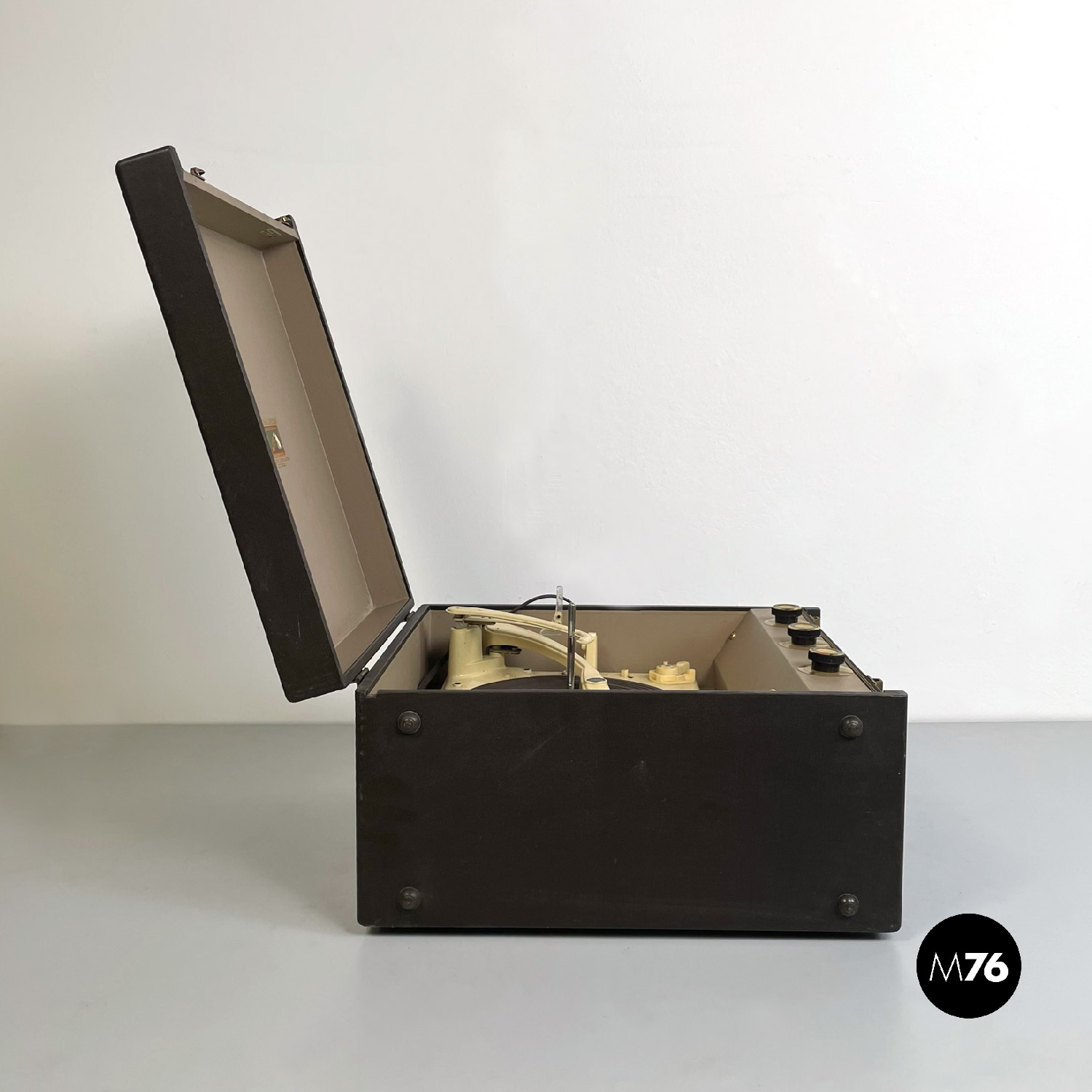 Giradischi a valigetta rettangolare. Struttura in legno marrone scuro e chiaro. La parte del giradischi si trova allu0027interno della valigetta insieme ai suoi diversi componenti. Una volta chiusa la valigetta contiene tutto al suo interno. Sulla struttura si trova su un lato un manico sullu0027altro quattro piedini di plastica nera e sul lato frontale una parte di tessuto con due chiusure in ottone.