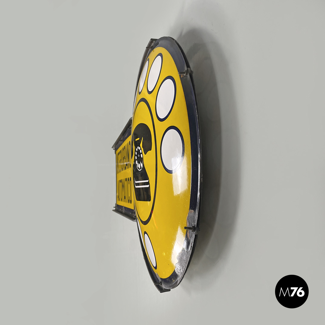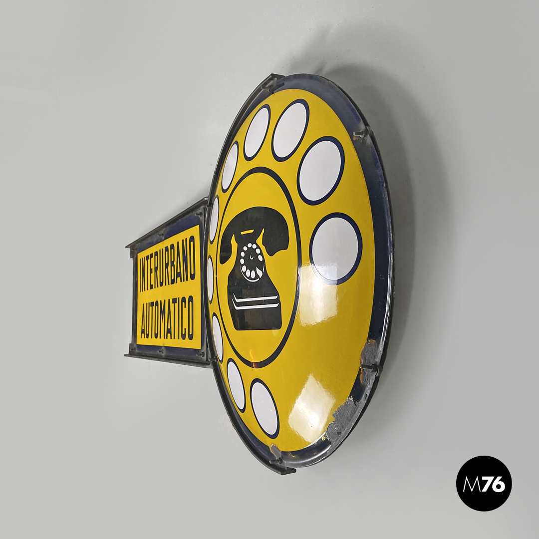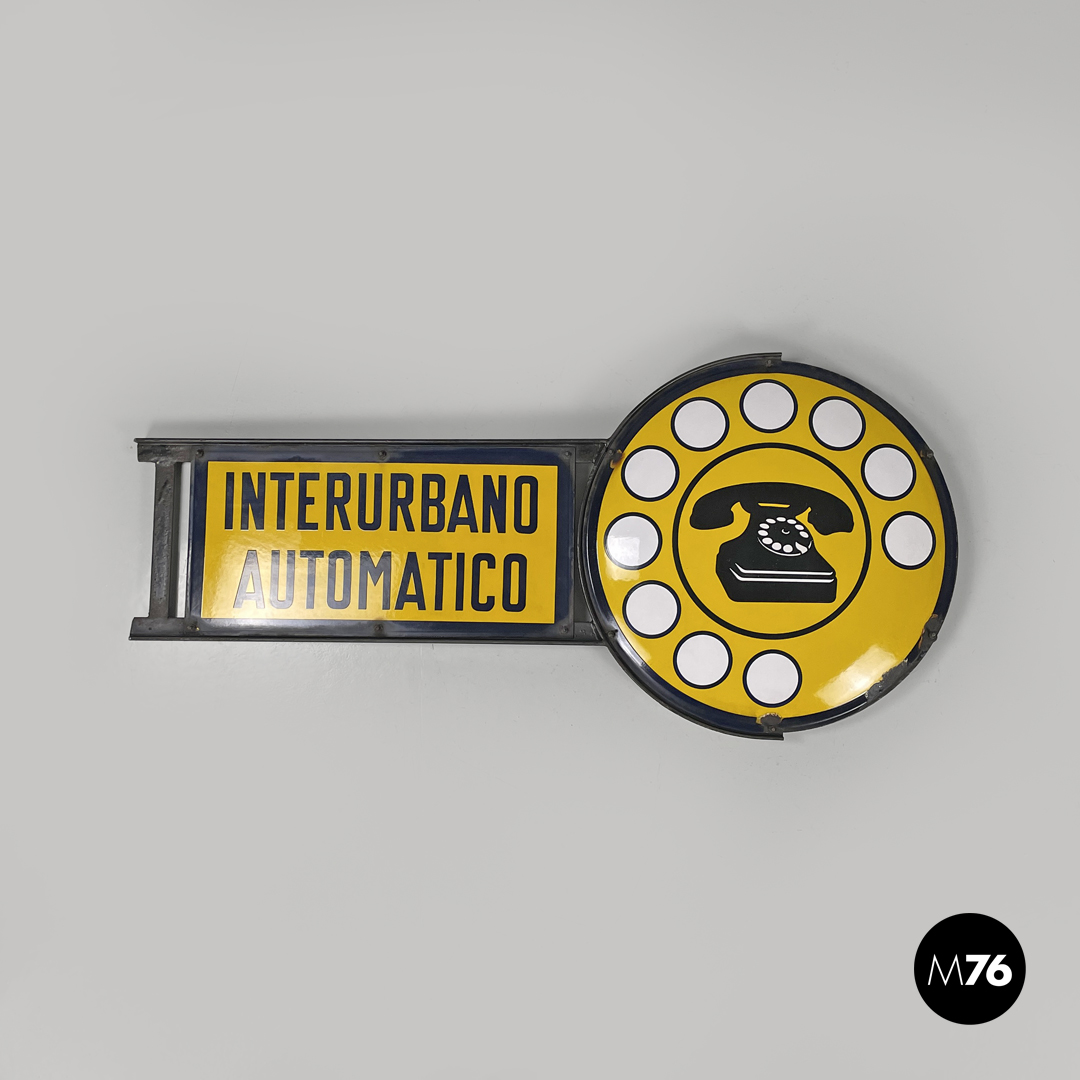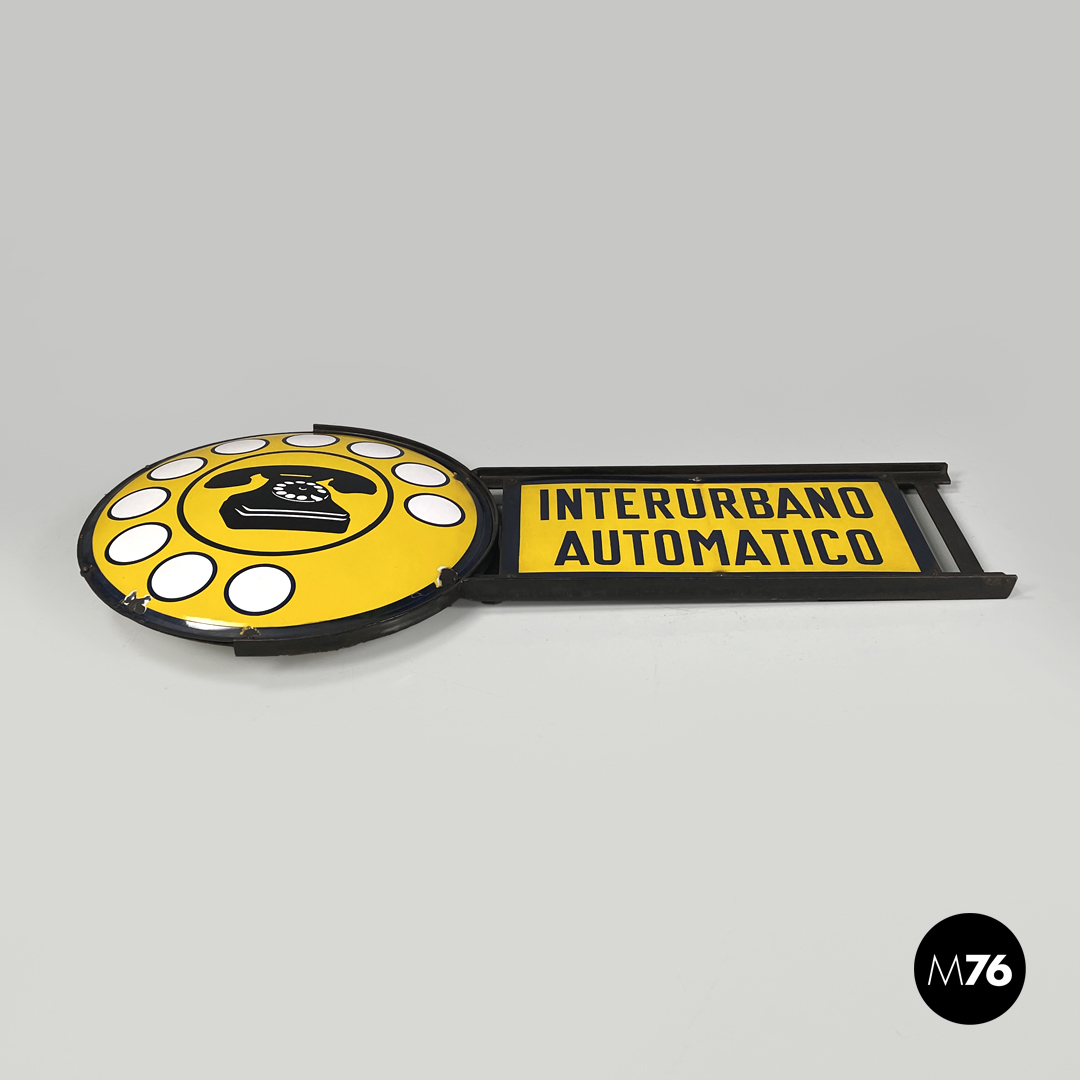 Insegna bifacciale in metallo smaltato giallo nero e bianco. La parte rettangolare allungata presenta la scritta “Interurbano Automatico” e termina con una parte tonda bombata al centro con disegno di un telefono stilizzato nero circondato da cerchi bianchi.