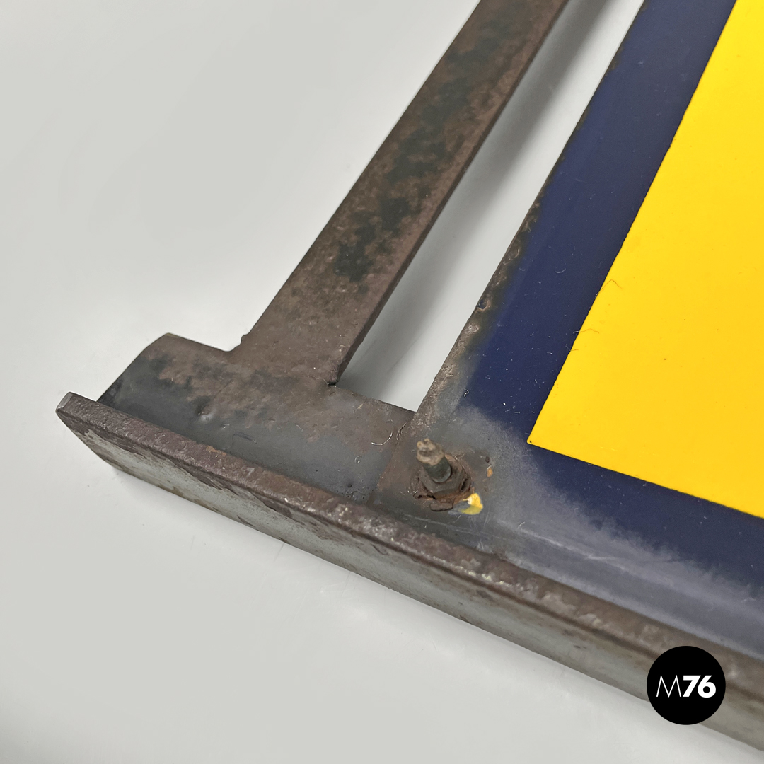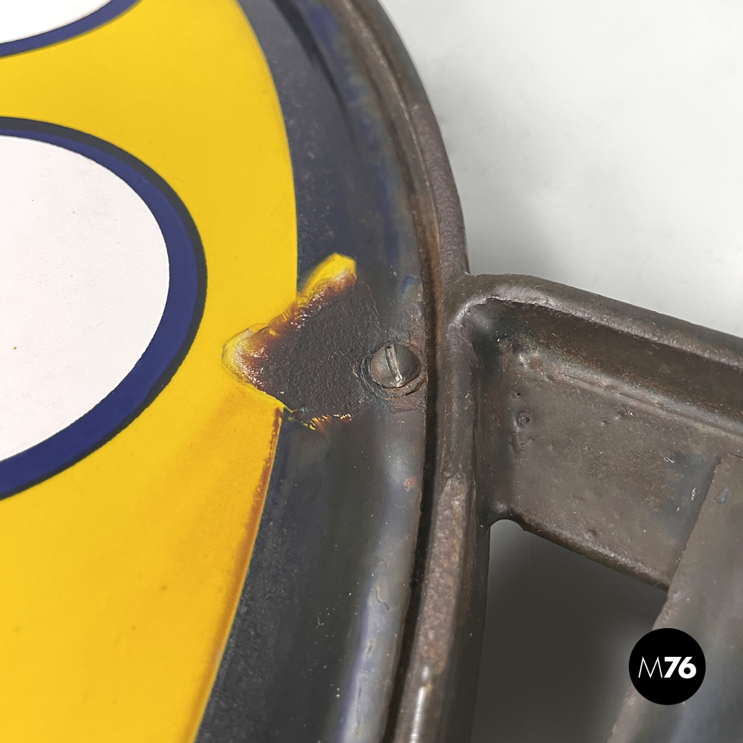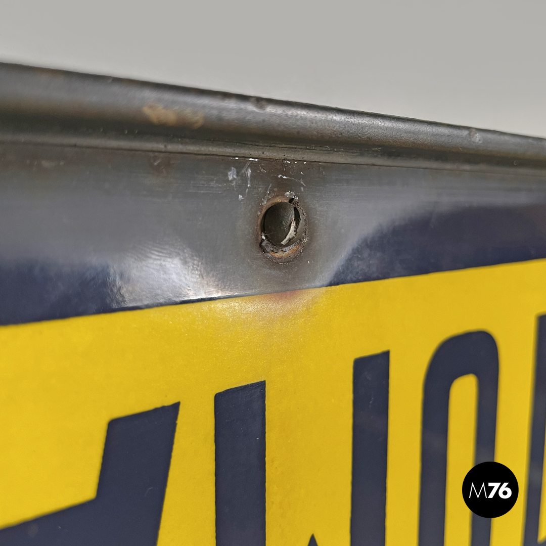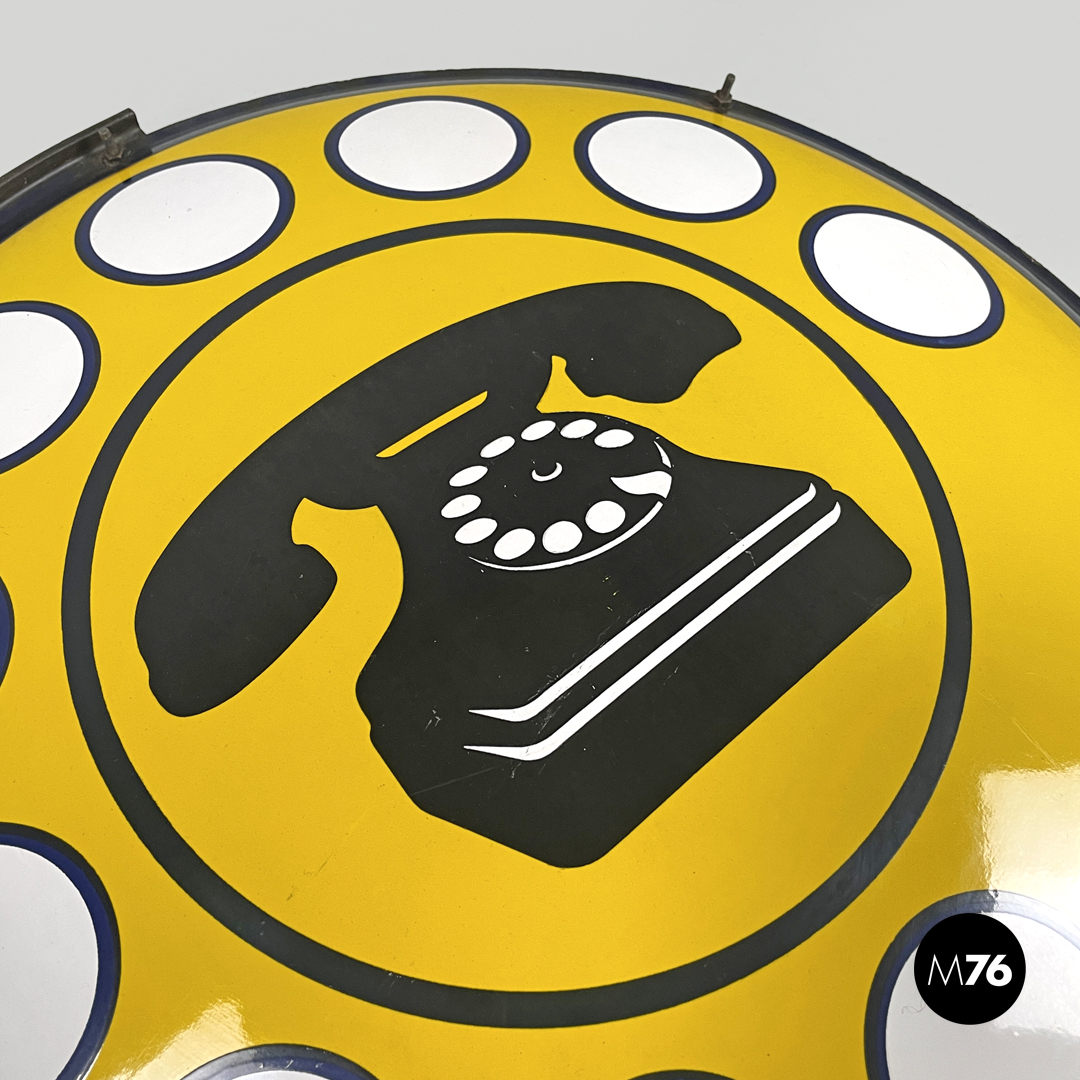 Insegna bifacciale in metallo smaltato giallo nero e bianco. La parte rettangolare allungata presenta la scritta “Interurbano Automatico” e termina con una parte tonda bombata al centro con disegno di un telefono stilizzato nero circondato da cerchi bianchi.