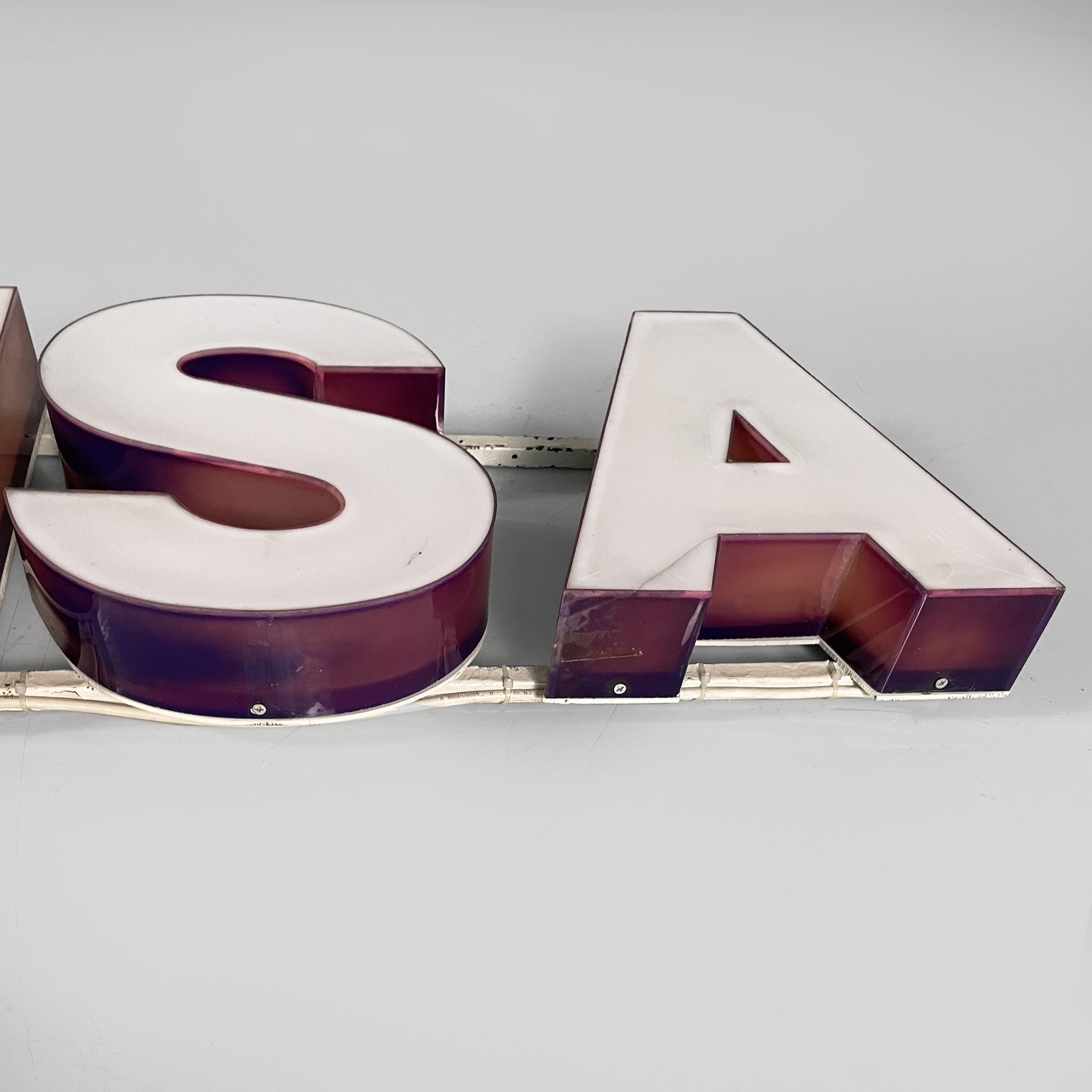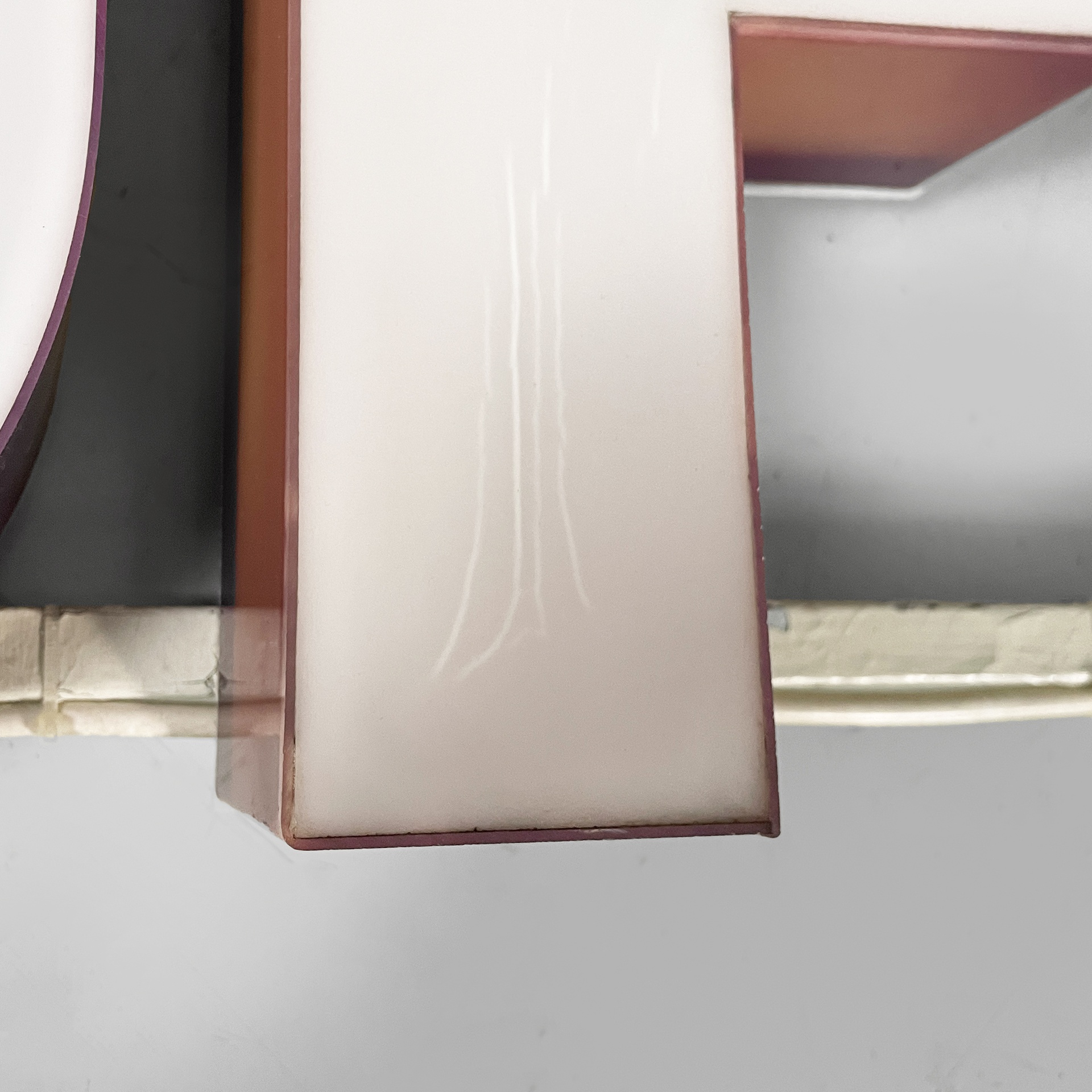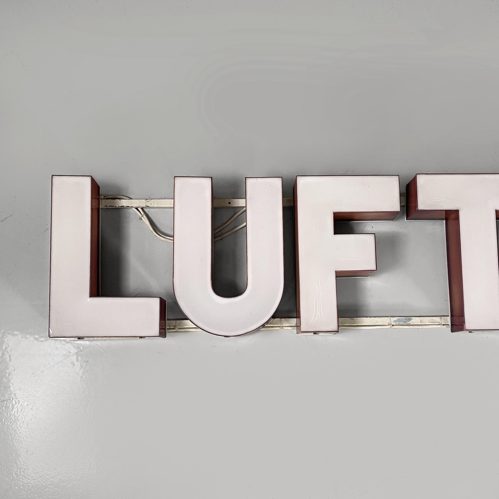 Insegna da parete di Lufthansa in plexiglass e metallo. Le lettere in plexiglass bianco con profili colorati in blu e rosso-rosa sono collegate dalla struttura in metallo verniciato bianco. Può essere utilizzata anche appoggiata ad un tavolo o a terra.