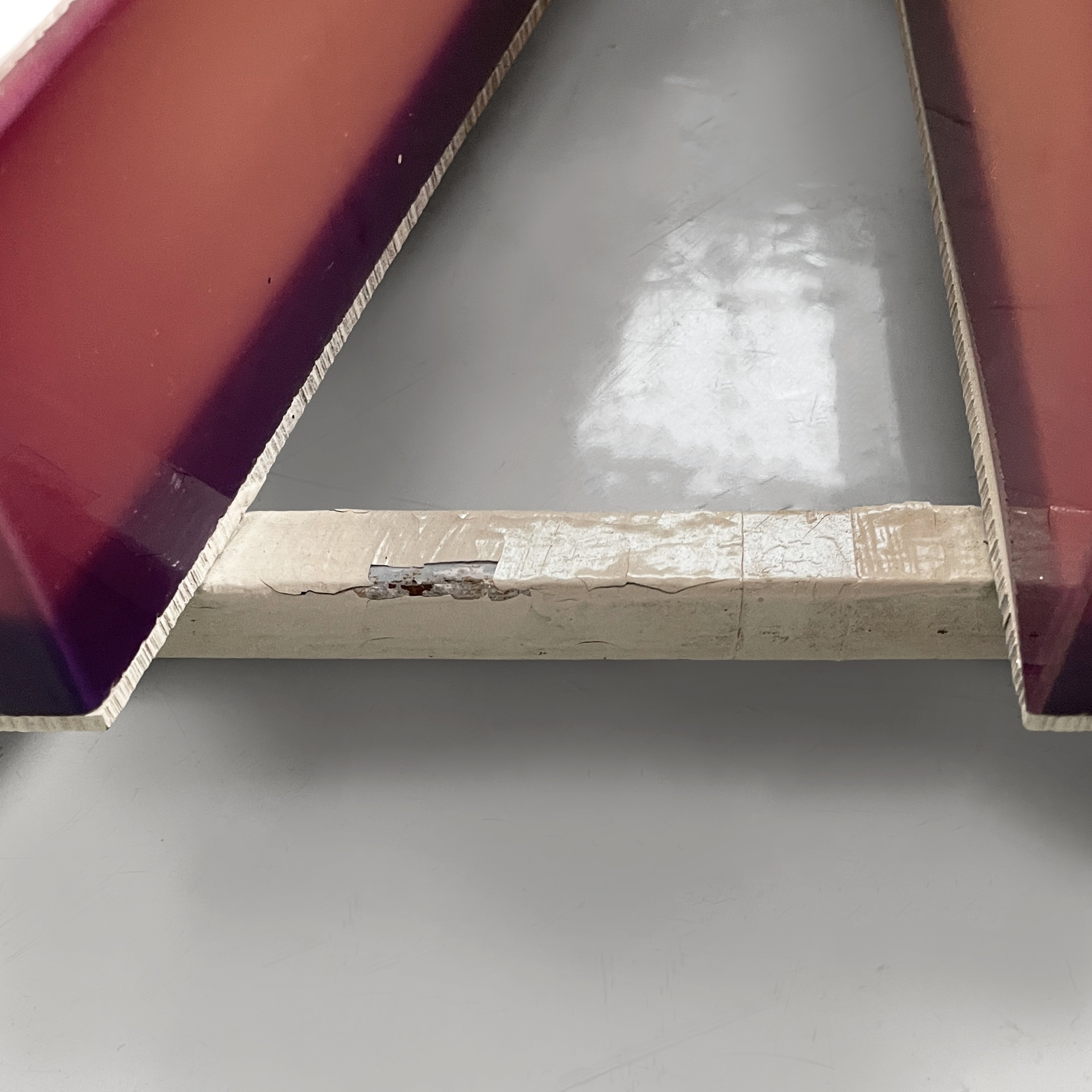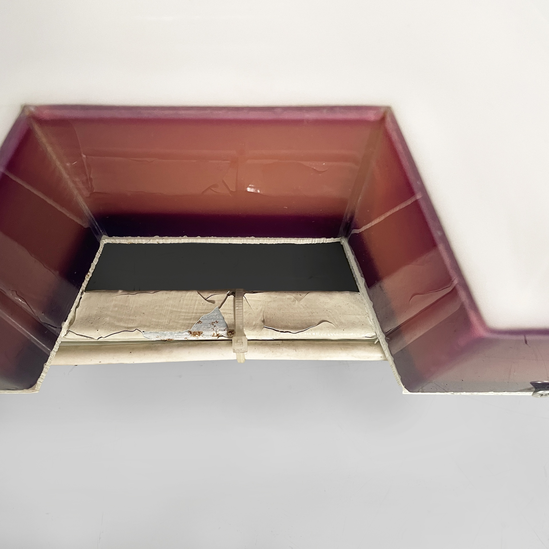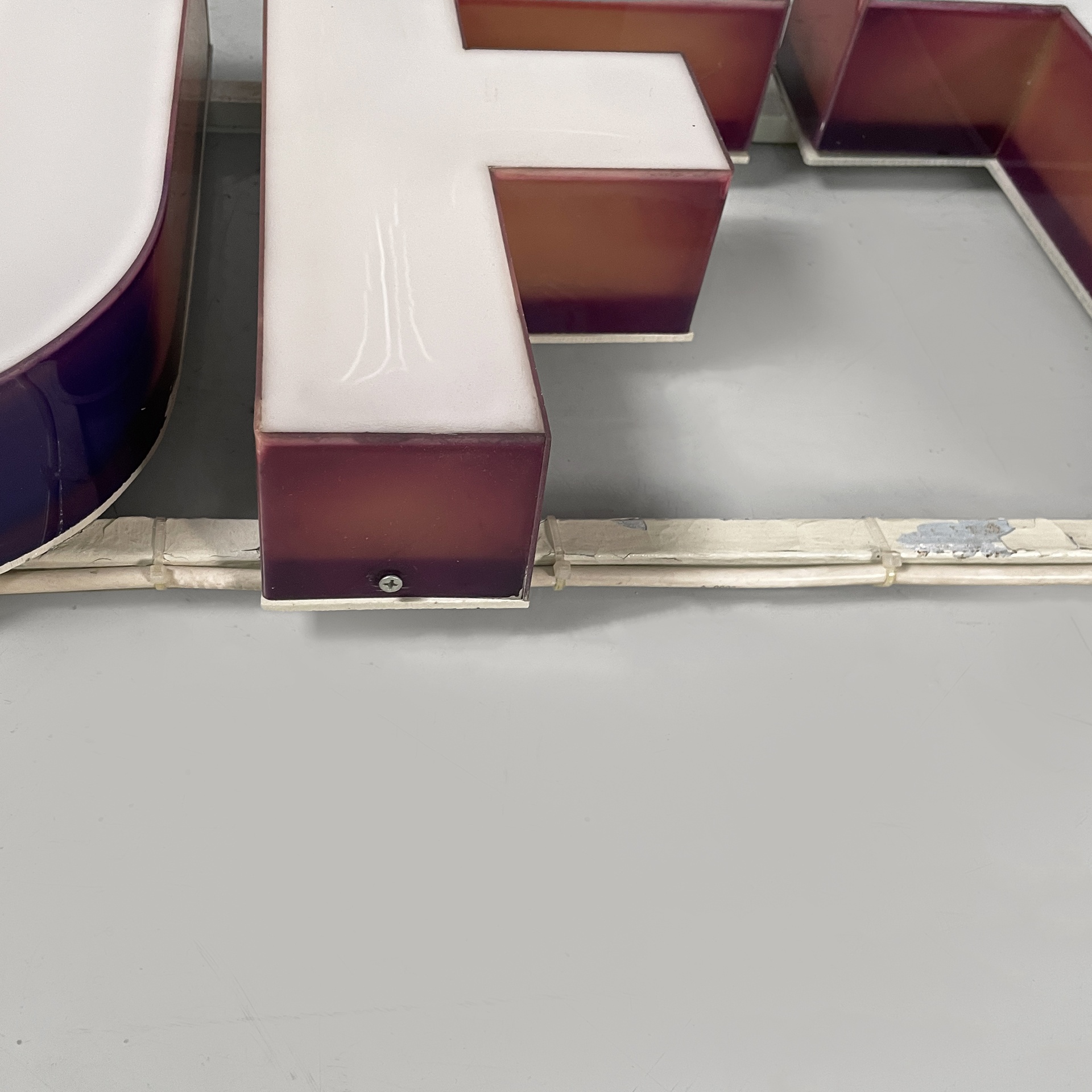 Insegna da parete di Lufthansa in plexiglass e metallo. Le lettere in plexiglass bianco con profili colorati in blu e rosso-rosa sono collegate dalla struttura in metallo verniciato bianco. Può essere utilizzata anche appoggiata ad un tavolo o a terra.