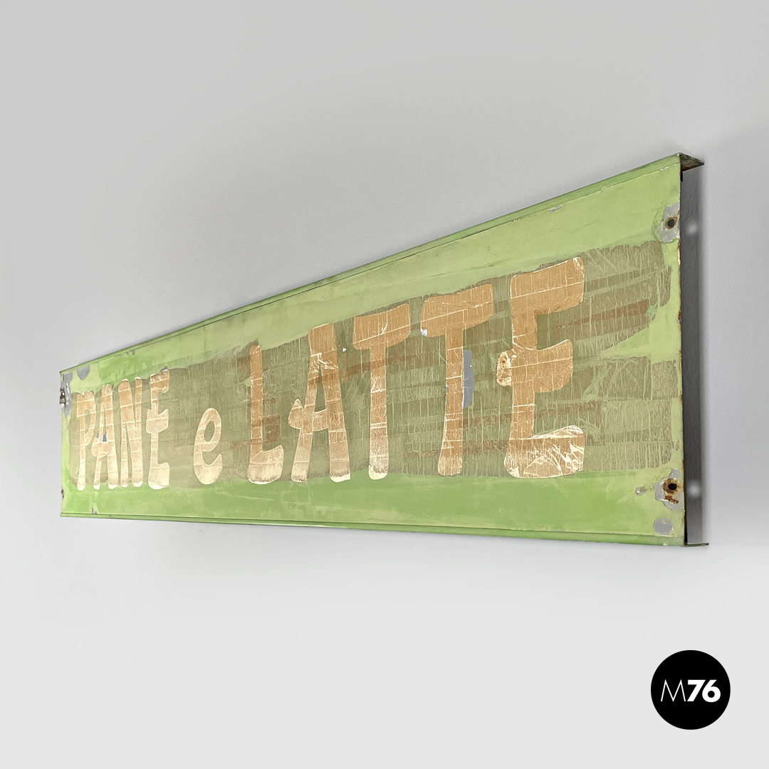 Insegna rettangolare allungata in lamiera di metallo. La struttura è verniciata di verde pisello chiaro ed ha le scritte “Pane e Latte” in bianco.