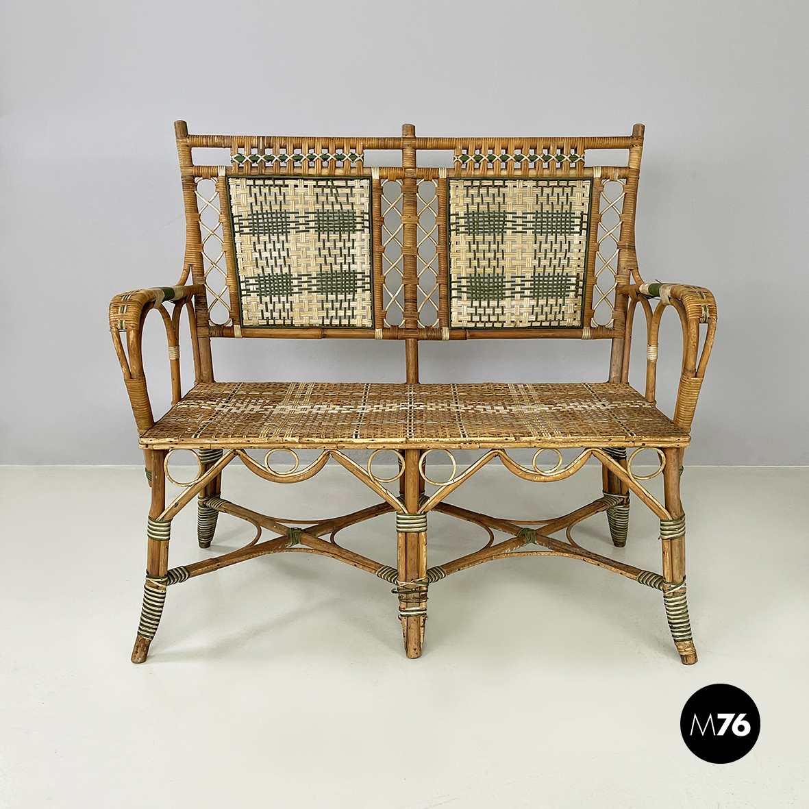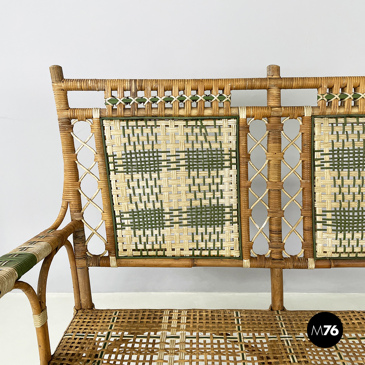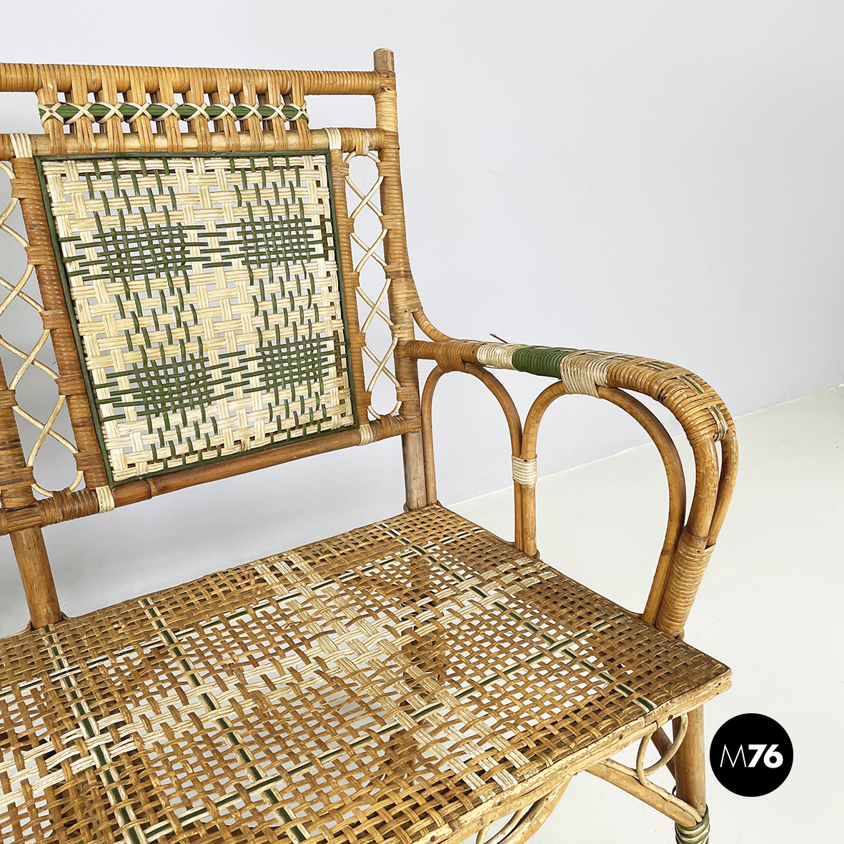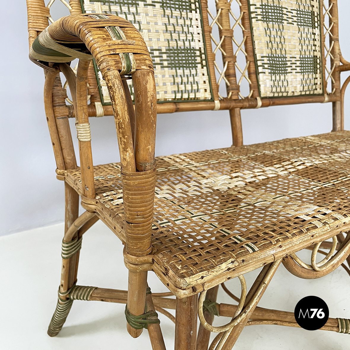 Panca a due posti da esterno interamente in rattan intrecciato. Lo schienale è in rattan con intrecci in vimini marrone bianco e verde con pattern rettangolari. I braccioli curvi e la seduta presentano lo stesso rattan. Le zampe curvate in rattan sono rifinite con parti in vimini verde e bianco. Questa seduta è perfetta per il giardino.