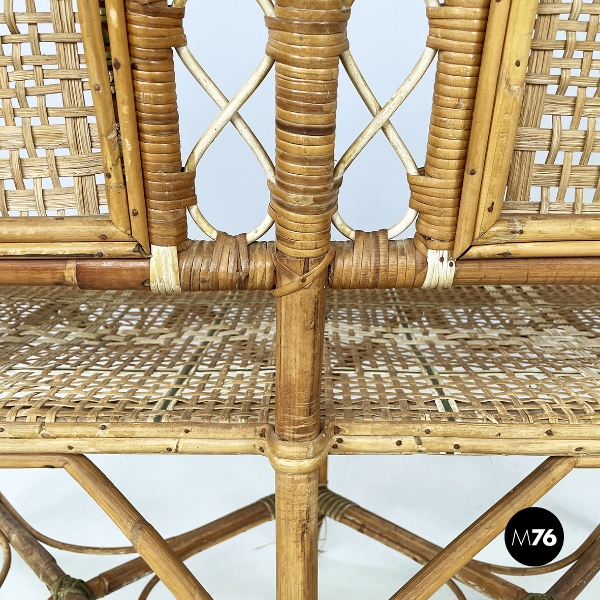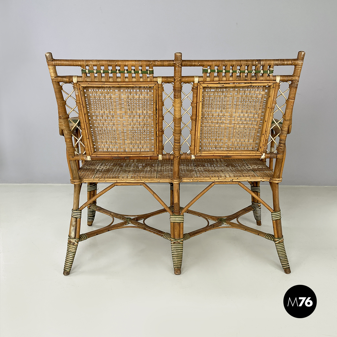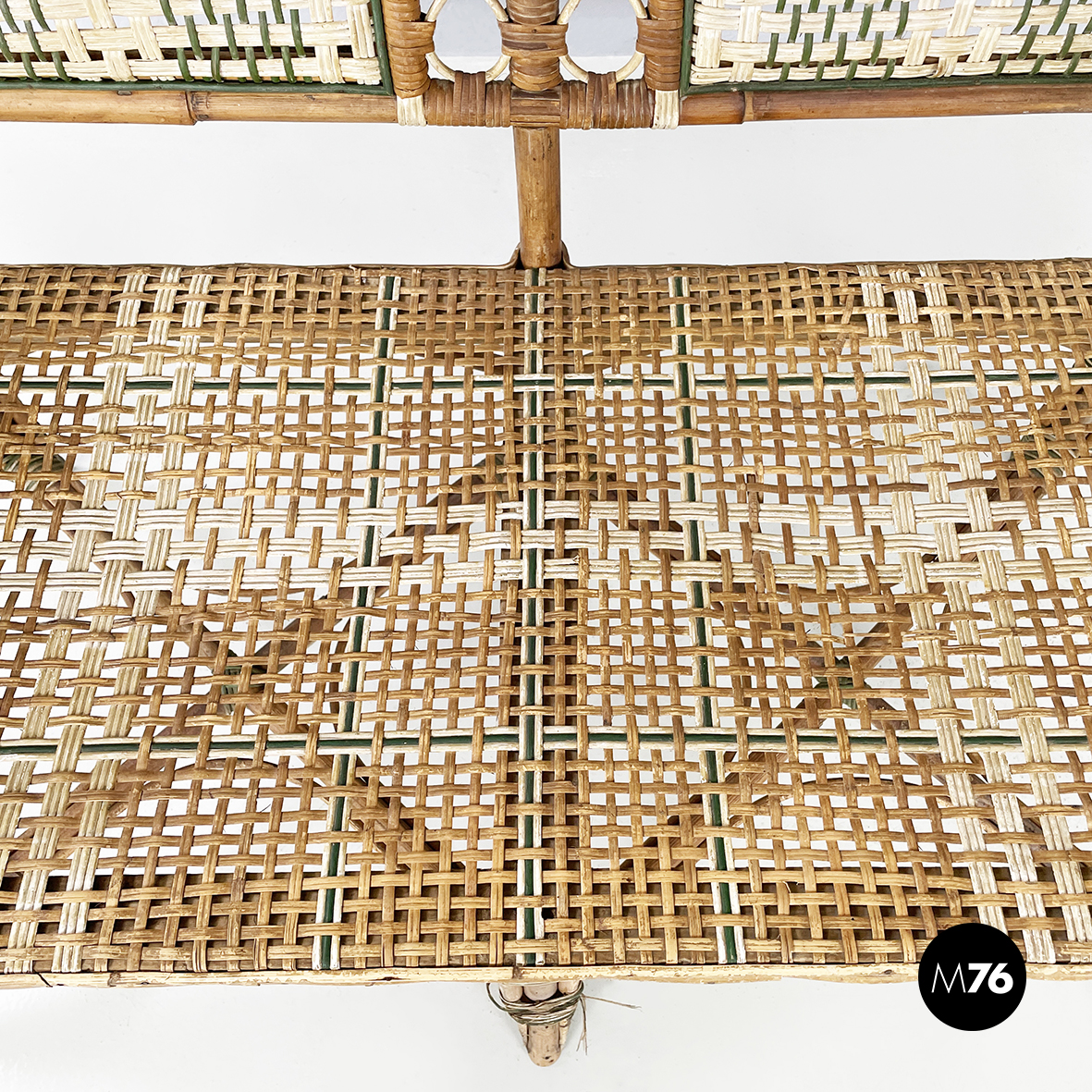 Panca a due posti da esterno interamente in rattan intrecciato. Lo schienale è in rattan con intrecci in vimini marrone bianco e verde con pattern rettangolari. I braccioli curvi e la seduta presentano lo stesso rattan. Le zampe curvate in rattan sono rifinite con parti in vimini verde e bianco. Questa seduta è perfetta per il giardino.