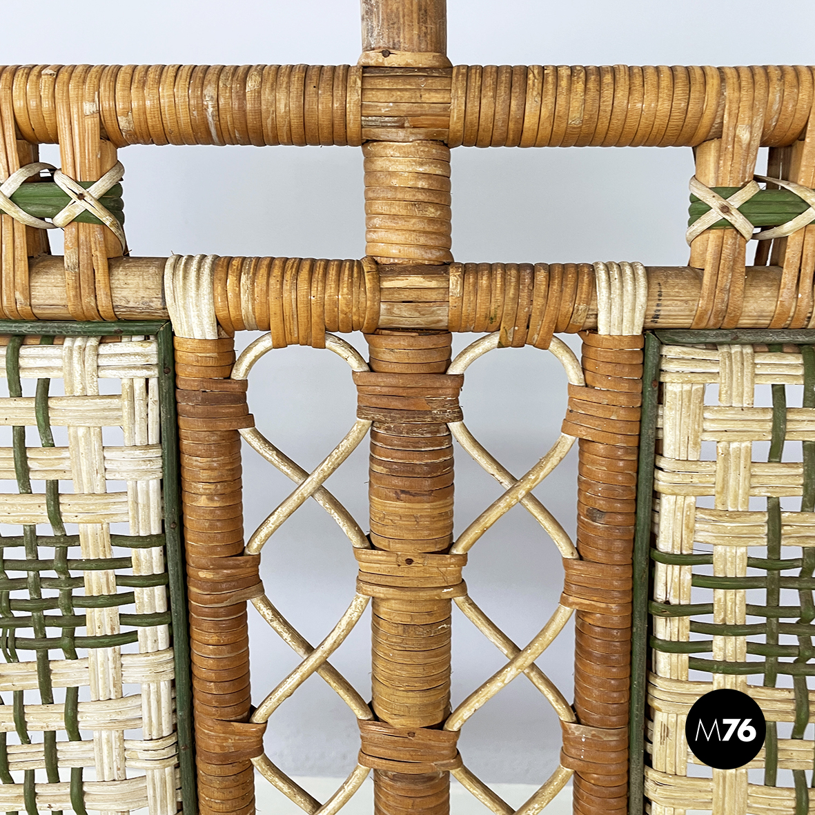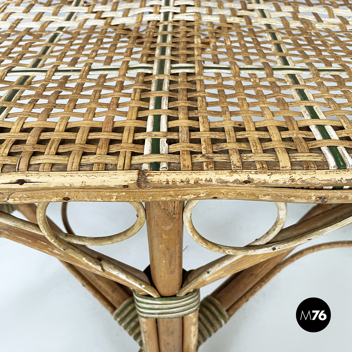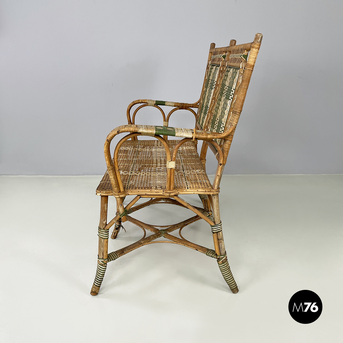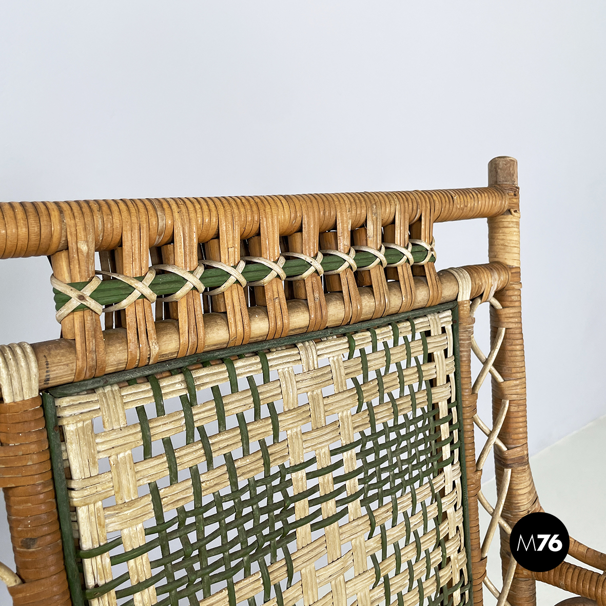 Panca a due posti da esterno interamente in rattan intrecciato. Lo schienale è in rattan con intrecci in vimini marrone bianco e verde con pattern rettangolari. I braccioli curvi e la seduta presentano lo stesso rattan. Le zampe curvate in rattan sono rifinite con parti in vimini verde e bianco. Questa seduta è perfetta per il giardino.