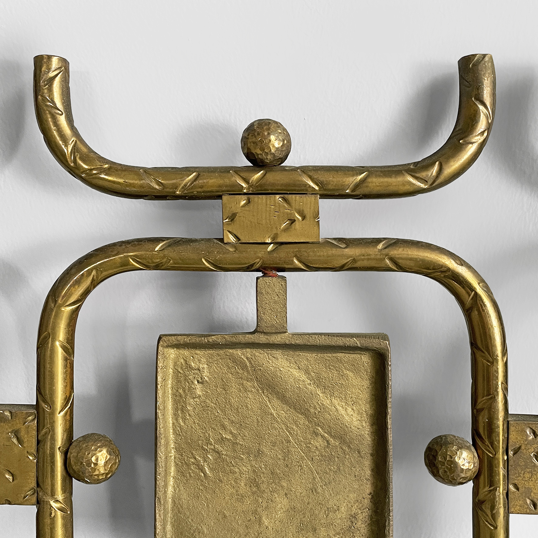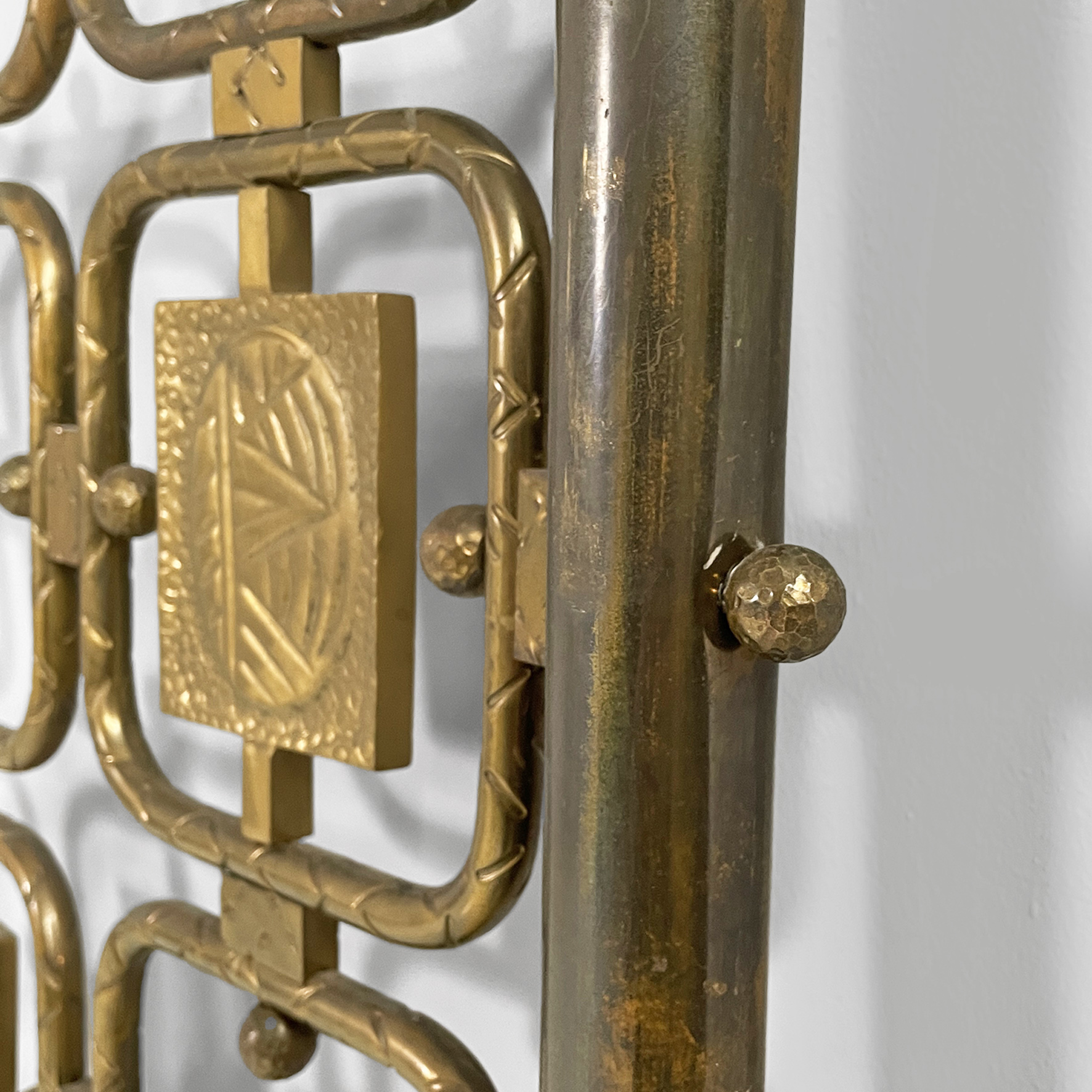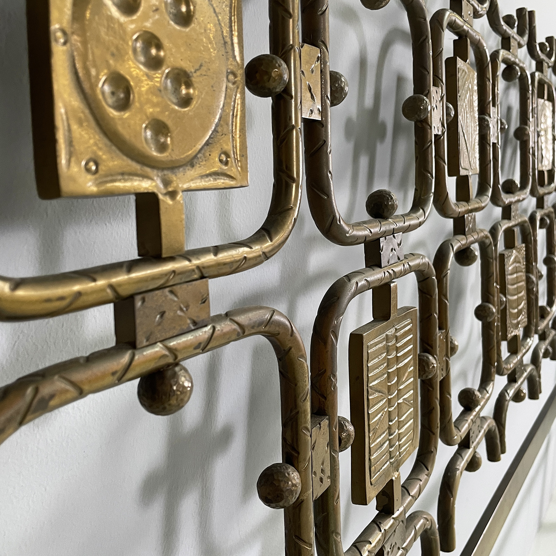 Headboard for a double bed with a structure in solid hammered brass composed of a series of interlocking geometric elements also in brass.