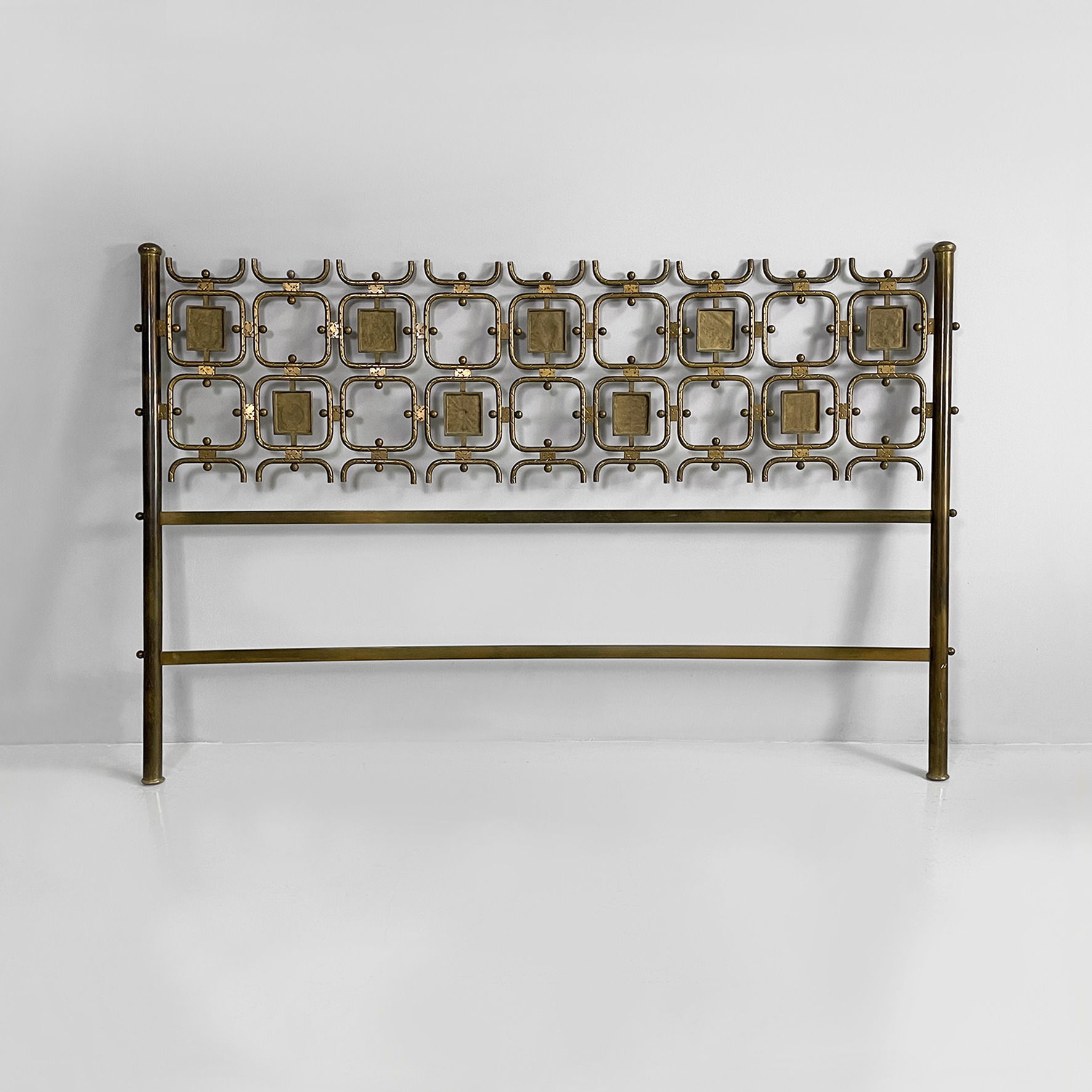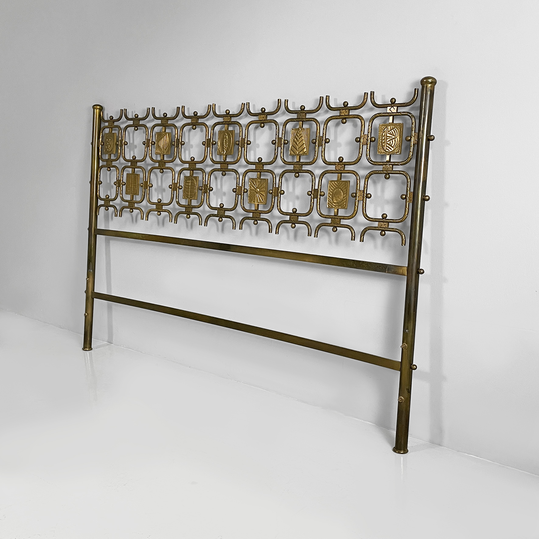 Beautiful and very elegant headboard for a double bed. Made entirely of solid brass with nine square-shaped decorations containing different symbols geometric or organic.