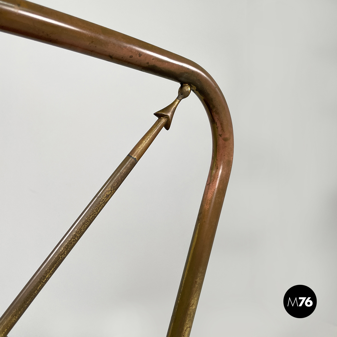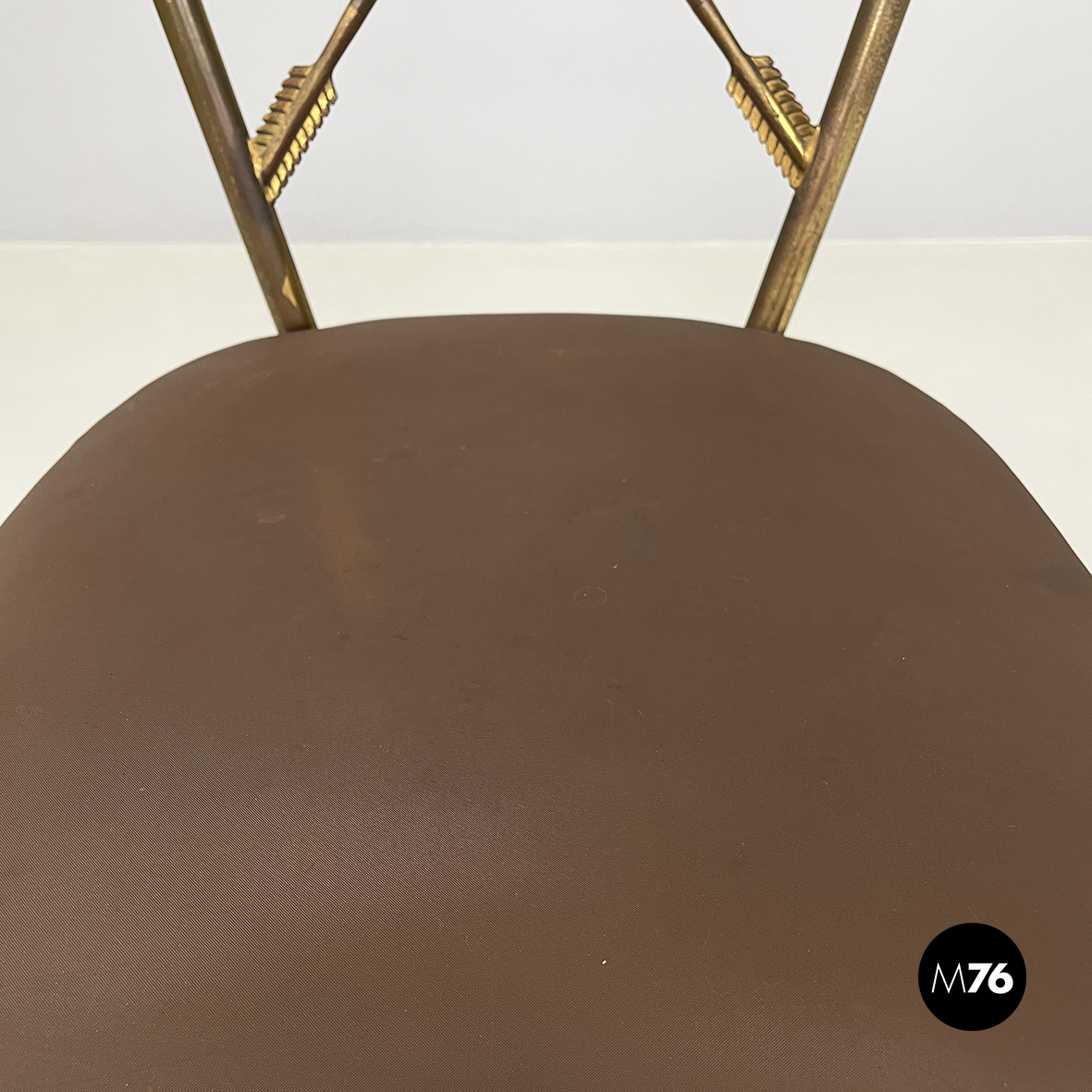 Sedia in ottone e tessuto. La seduta è squadrata con angoli arrotondati imbottita e rivestita in tessuto marrone scuro. Lo schienale in ottone è composto da un tubolare al centro due frecce poste a X con un cilindro al loro incrocio. Le zampe sono in tondino di ottone con piedini neri.