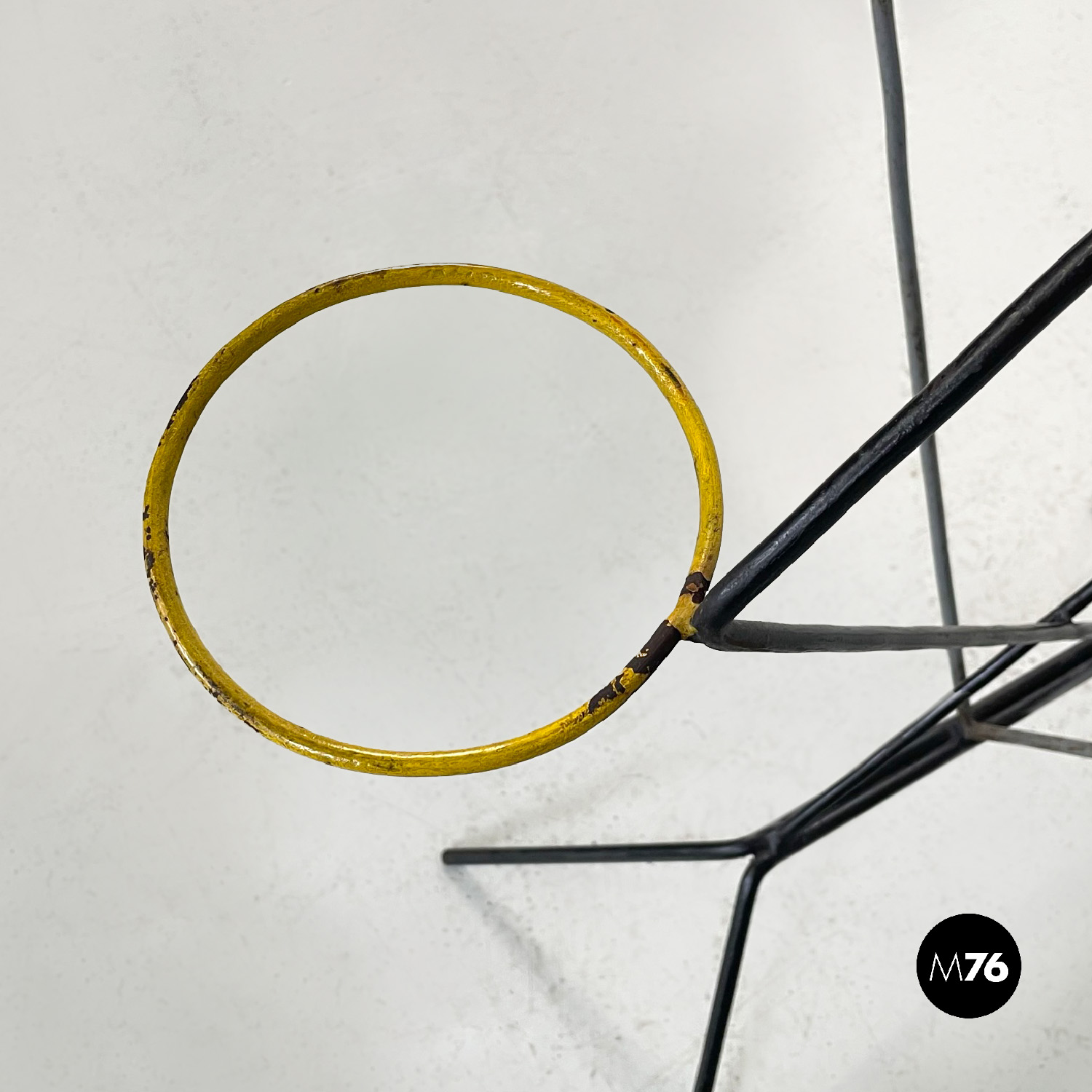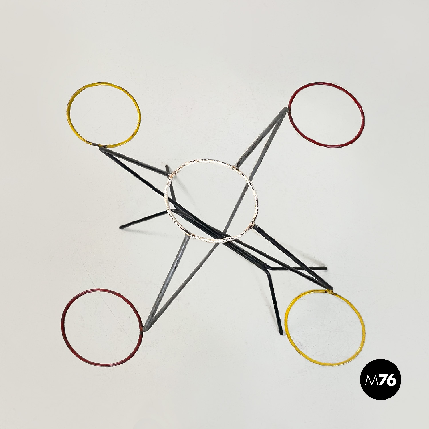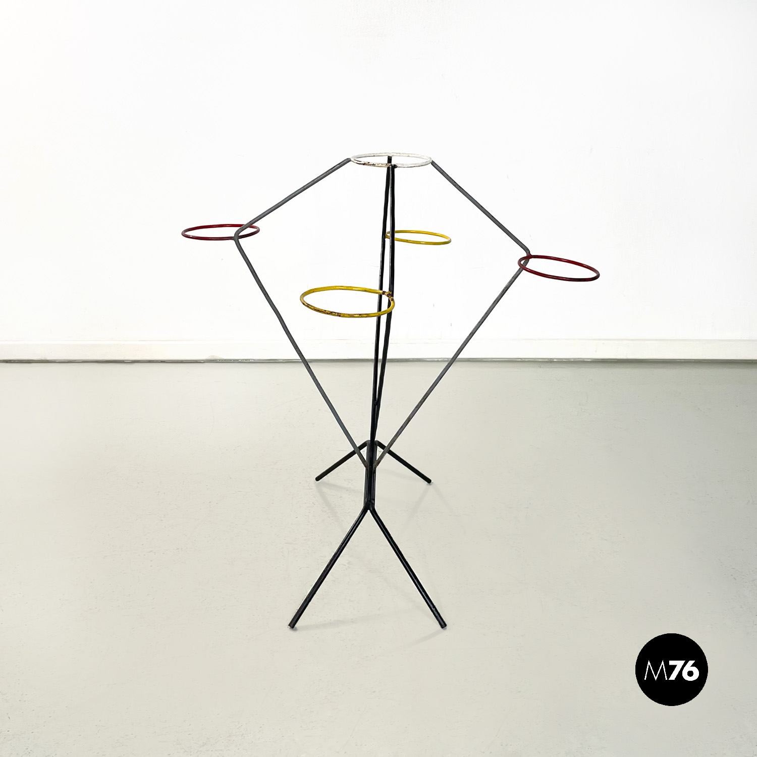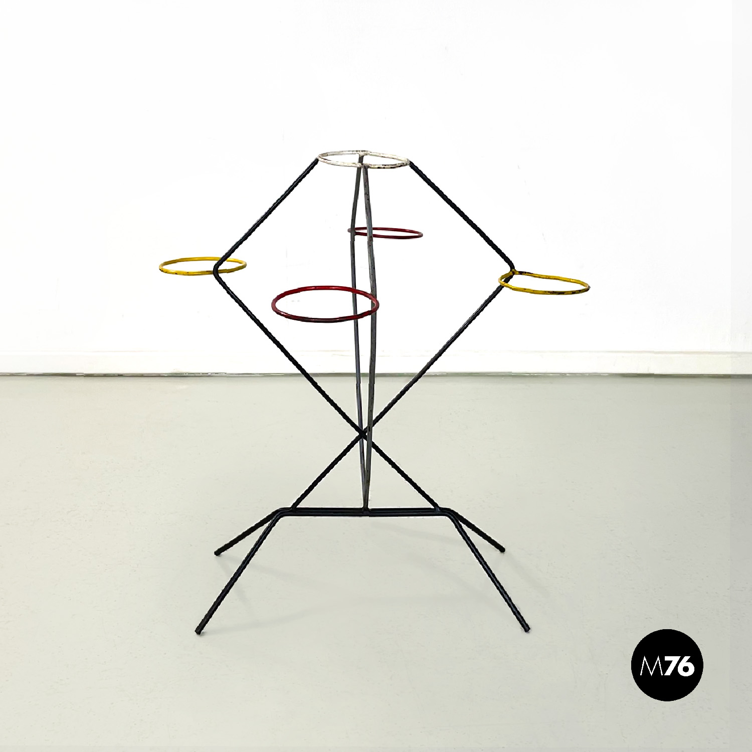 Portafiori da terra a base quadrata in tondino di ferro. La struttura è data da quattro bracci che partono dalla base sviluppandosi in verticale. I bracci si incrociano a formare un incastro geometrico vanno a formare un triangolo dove agli estremi si trovano quattro cerchi di 13 cm interni dove è possibile inserire i vasi. I bracci si riuniscono poi nella parte alta nel cerchio più in alto.