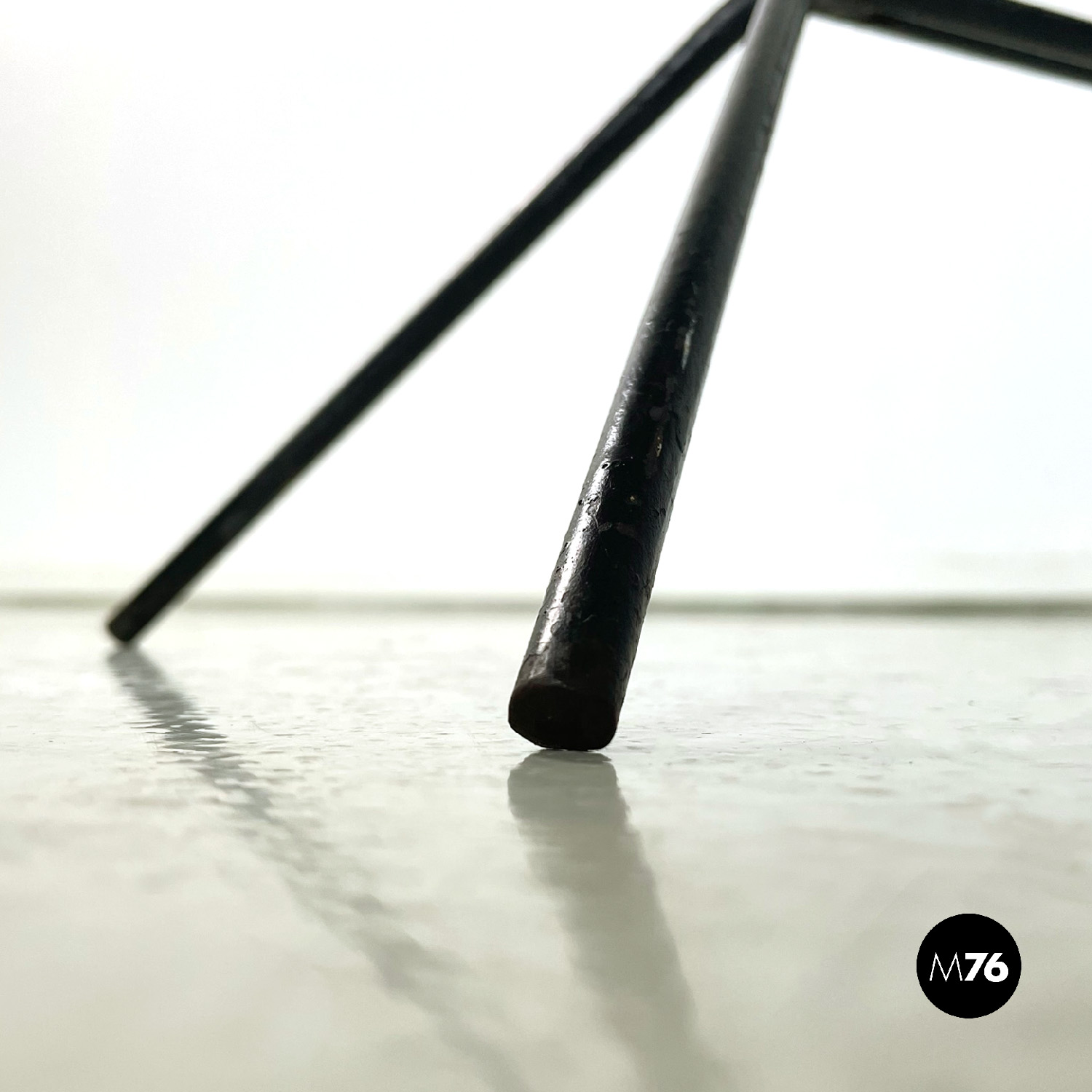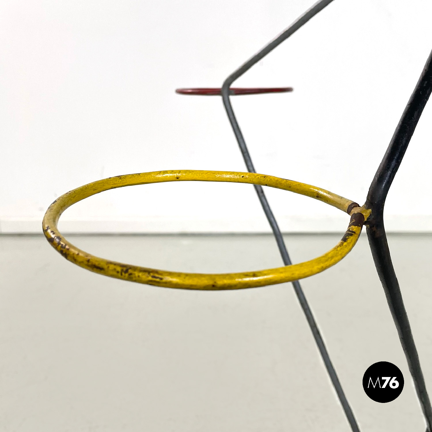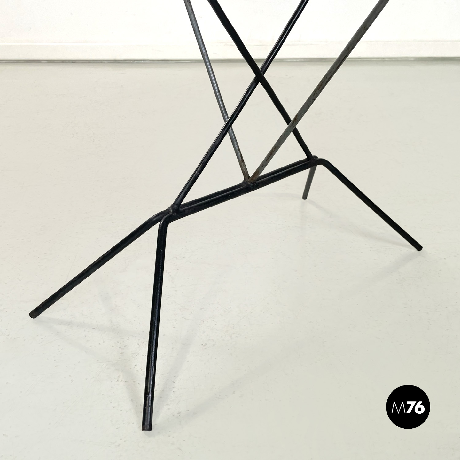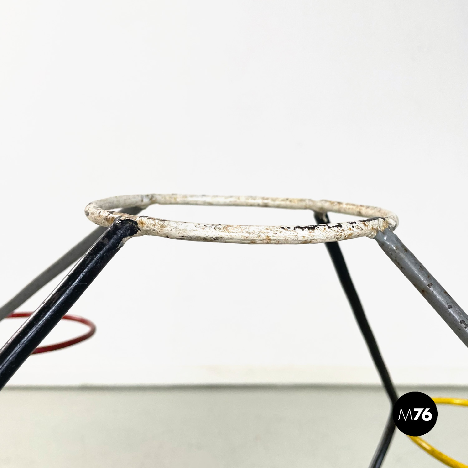 Portafiori da terra a base quadrata in tondino di ferro. La struttura è data da quattro bracci che partono dalla base sviluppandosi in verticale. I bracci si incrociano a formare un incastro geometrico vanno a formare un triangolo dove agli estremi si trovano quattro cerchi di 13 cm interni dove è possibile inserire i vasi. I bracci si riuniscono poi nella parte alta nel cerchio più in alto.