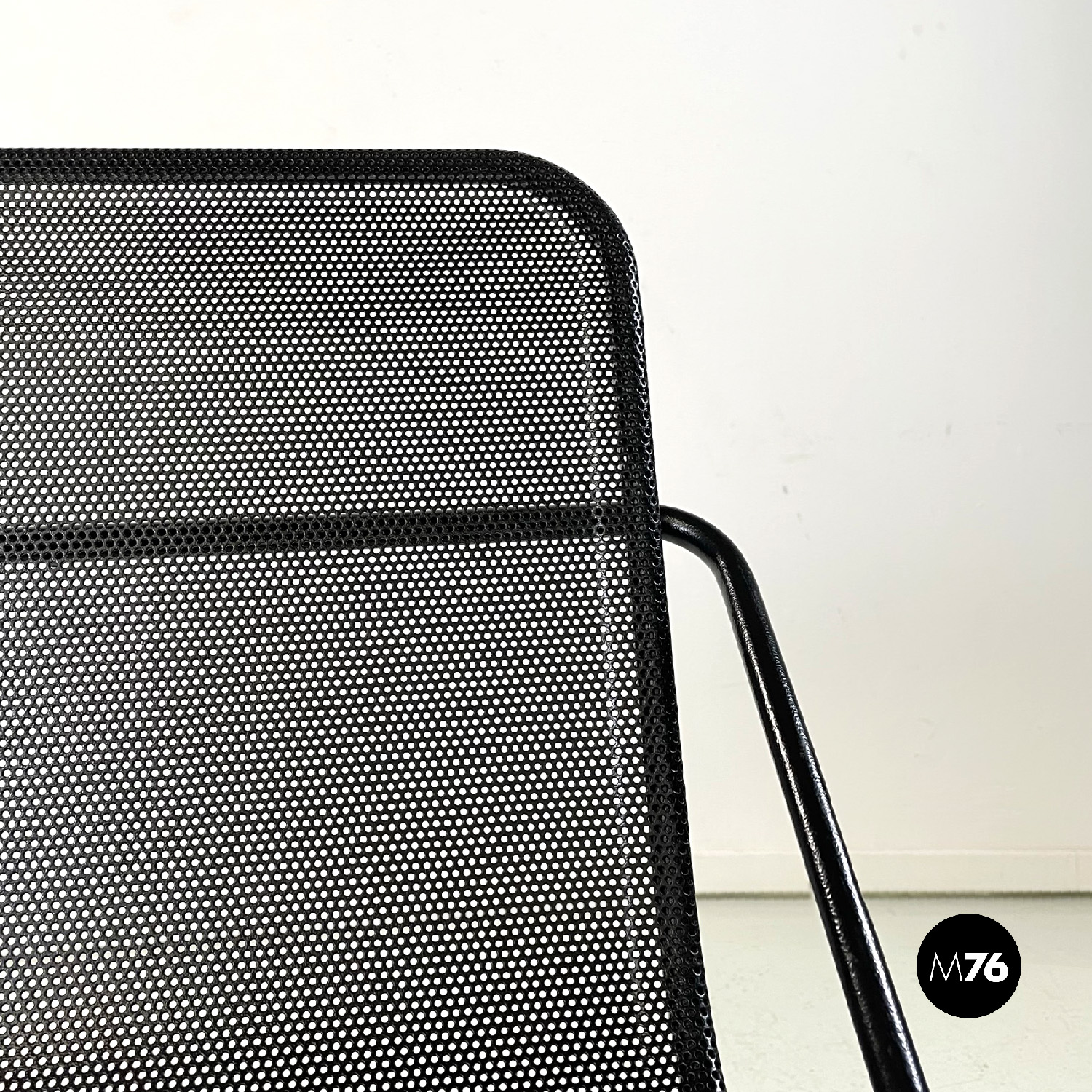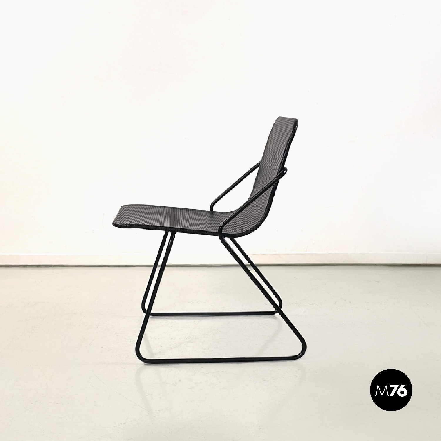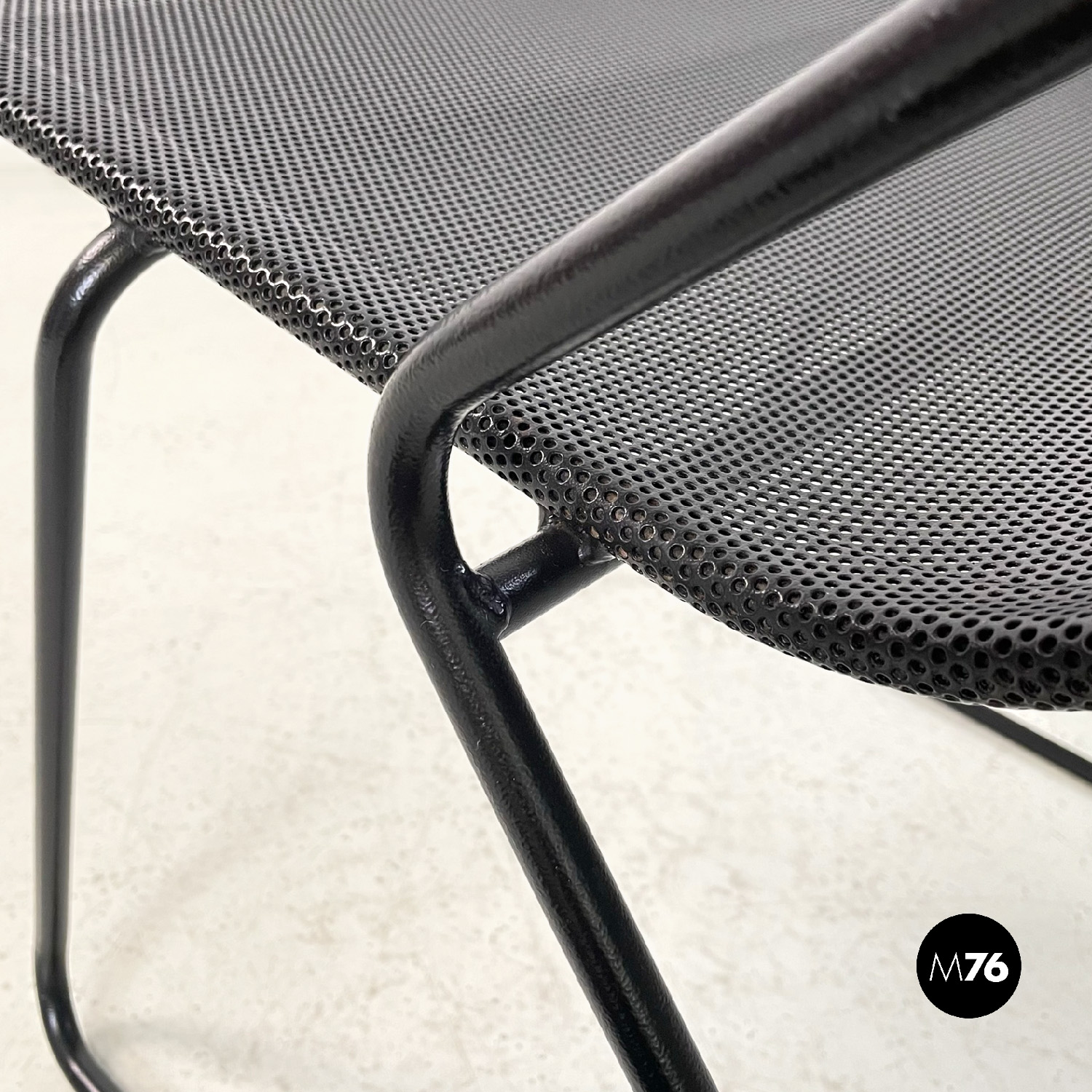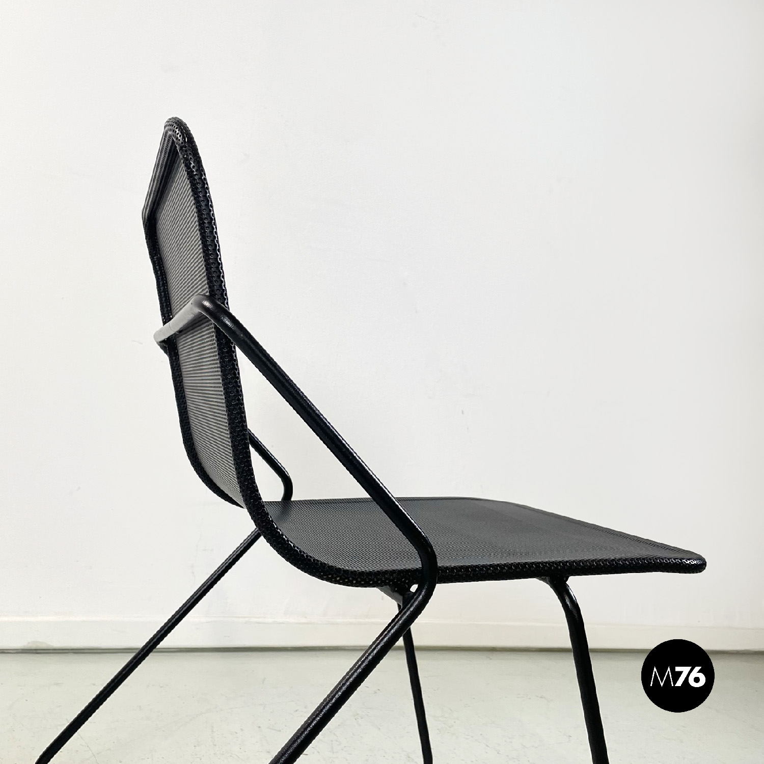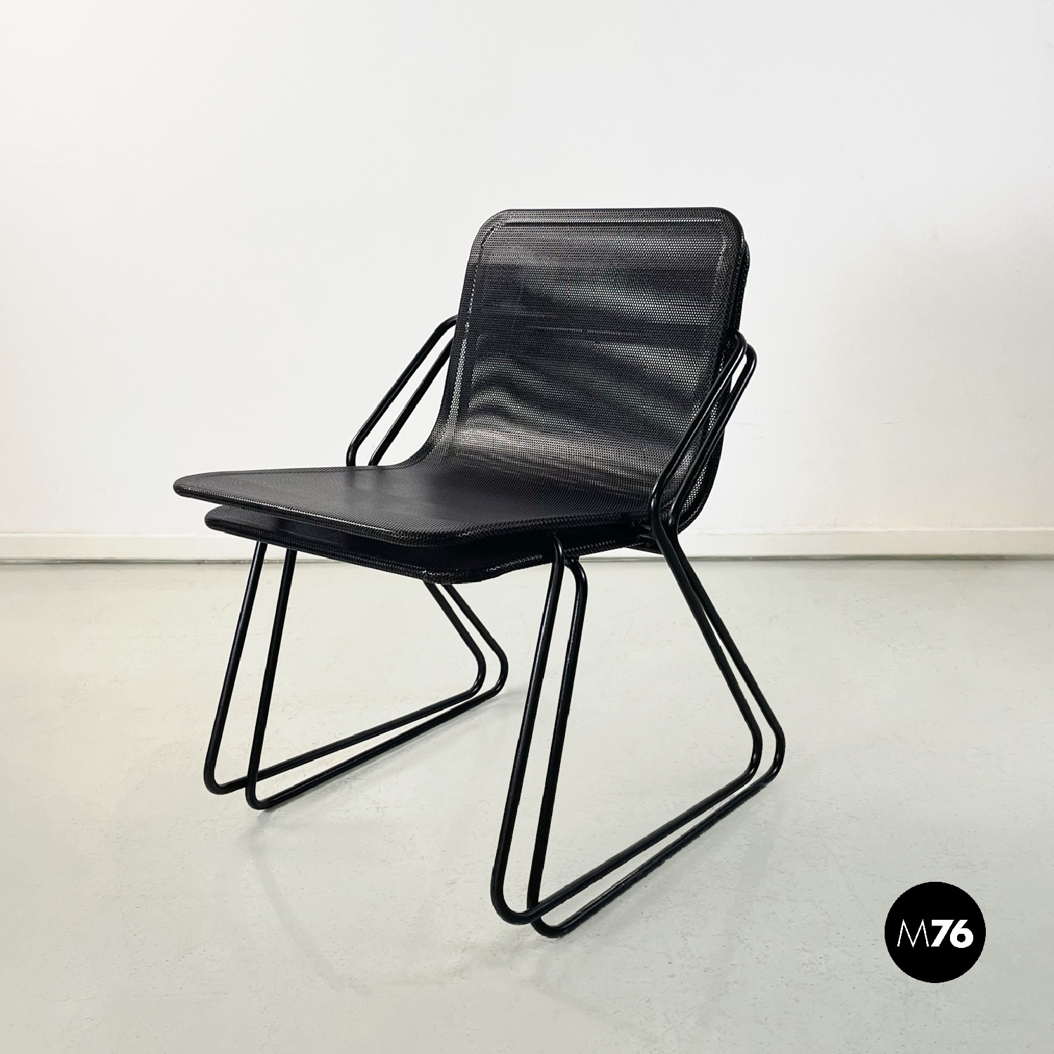 Coppia di sedie in tondino di metallo verniciato nero. La struttura è composta da un unico tondino di metallo che  compone le gambe di forma triangolare e la struttura dello schienale. Lo schienale e la seduta sono in lamiera di metallo micro forata verniciate anch’esse in nero. Possono essere impilate. Il design di queste sedie richiama lo stile di Mathieu Matégot.
