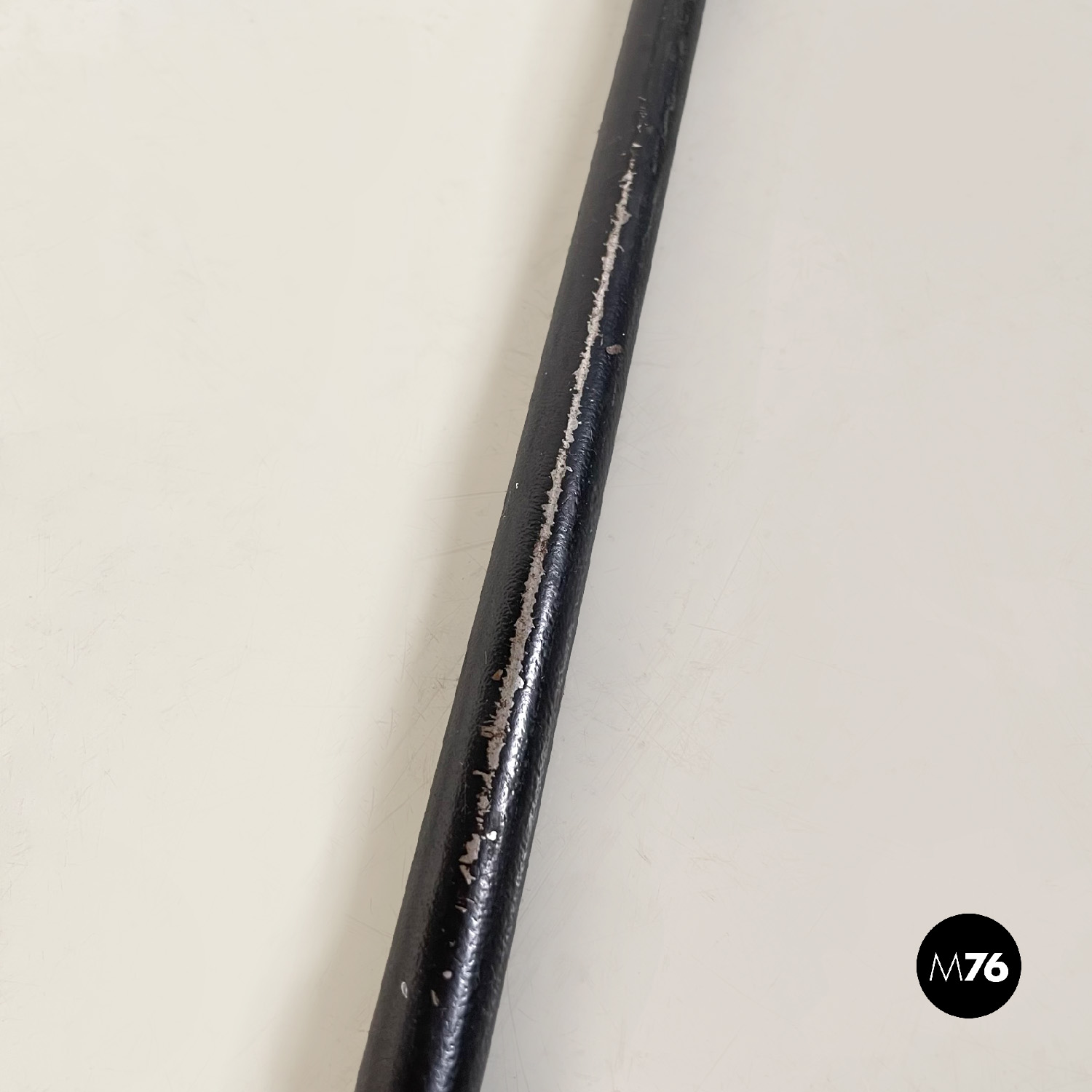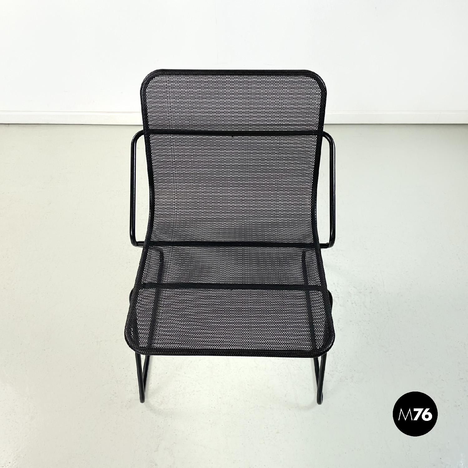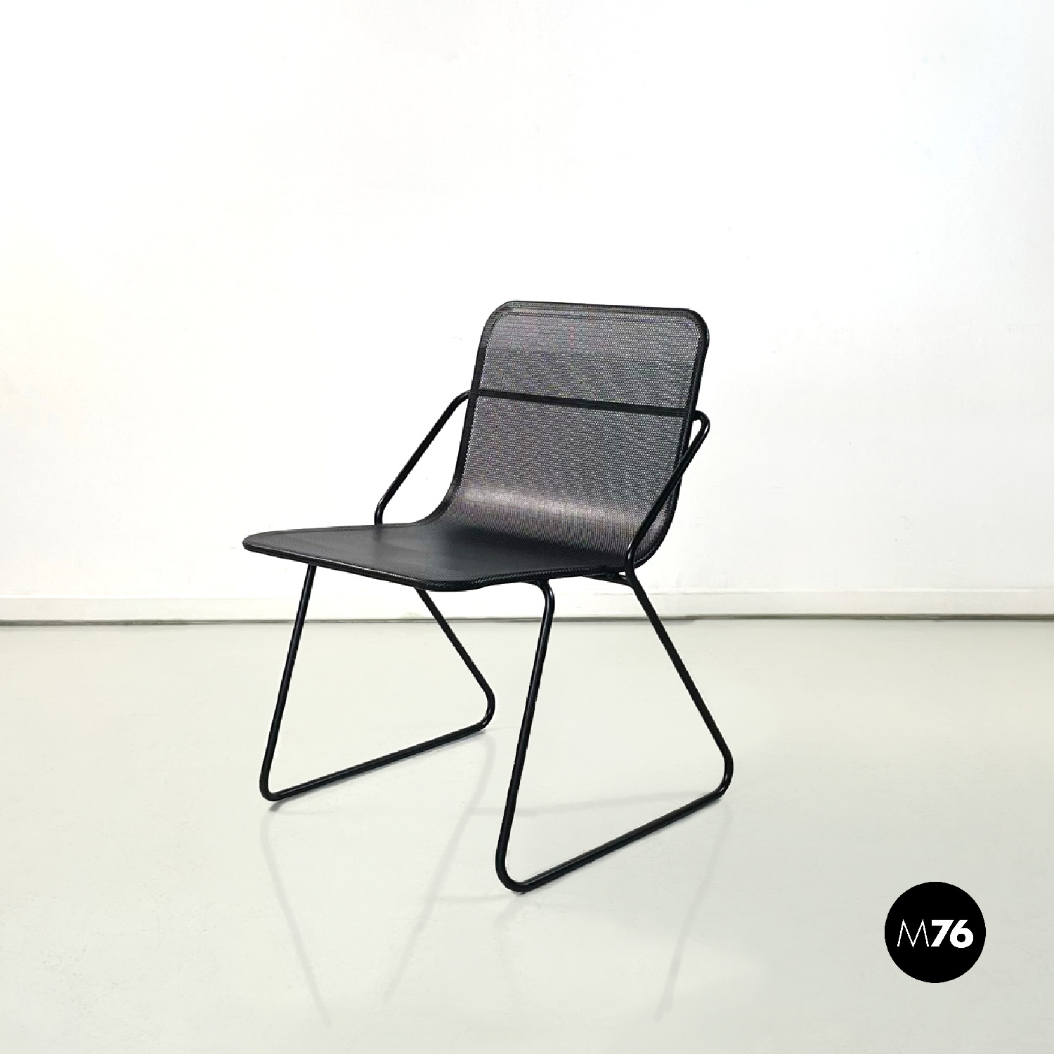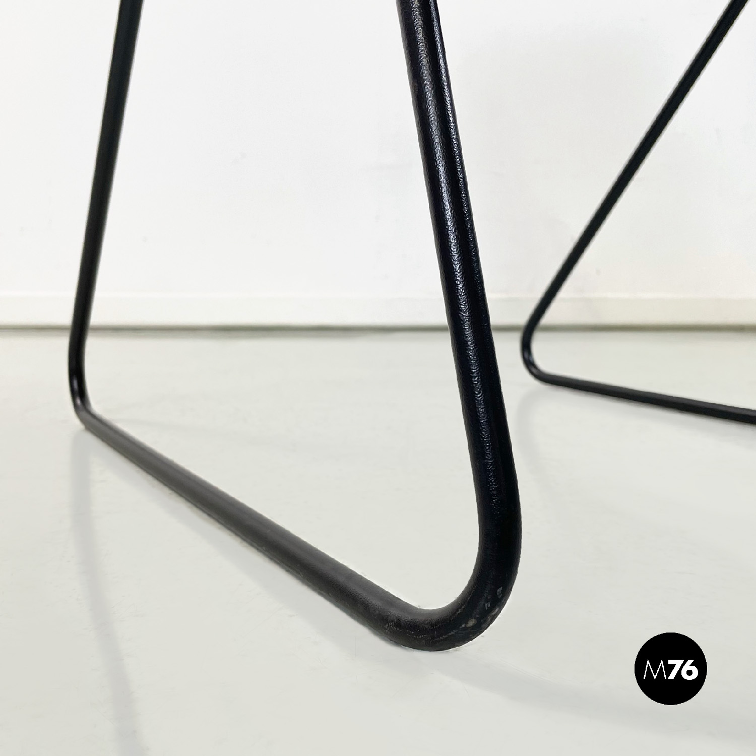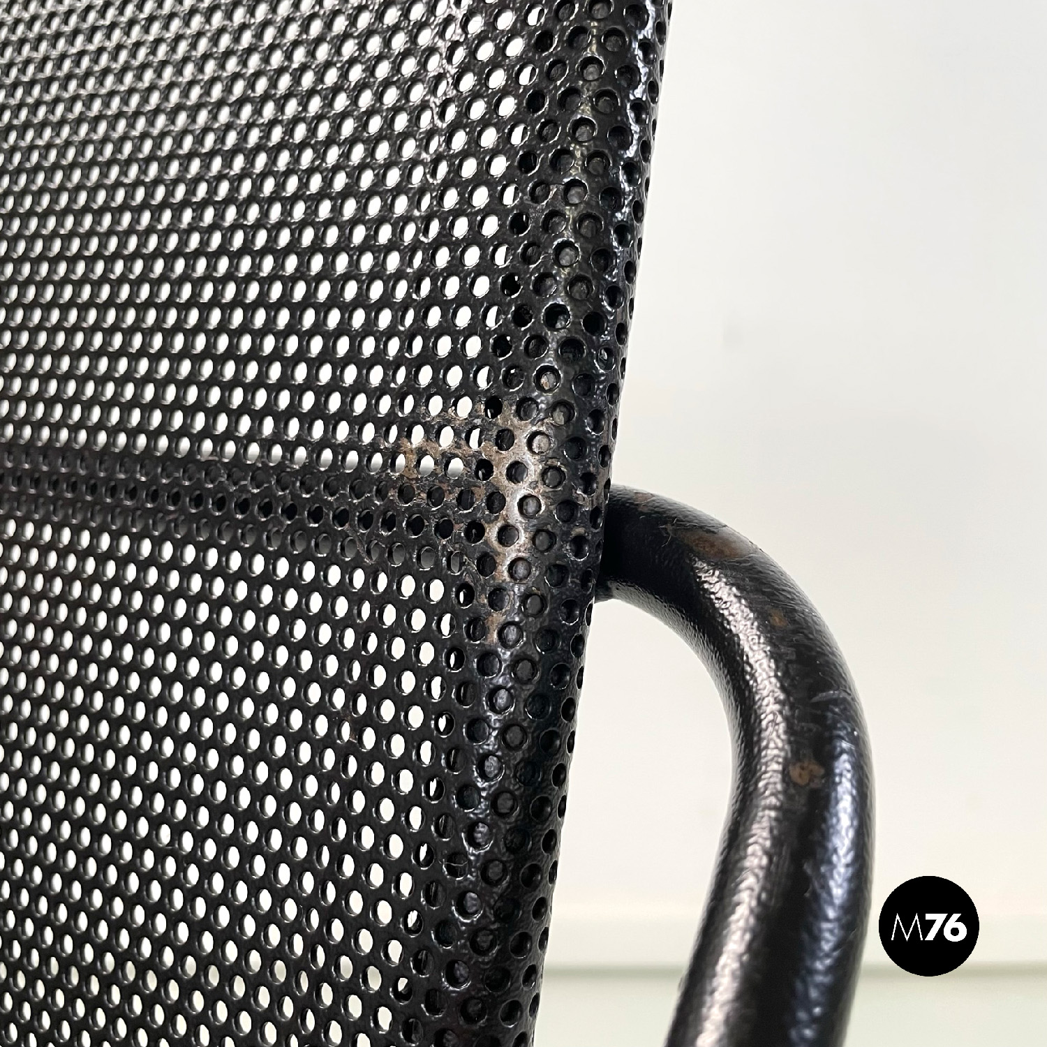 Coppia di sedie in tondino di metallo verniciato nero. La struttura è composta da un unico tondino di metallo che  compone le gambe di forma triangolare e la struttura dello schienale. Lo schienale e la seduta sono in lamiera di metallo micro forata verniciate anch’esse in nero. Possono essere impilate. Il design di queste sedie richiama lo stile di Mathieu Matégot.
