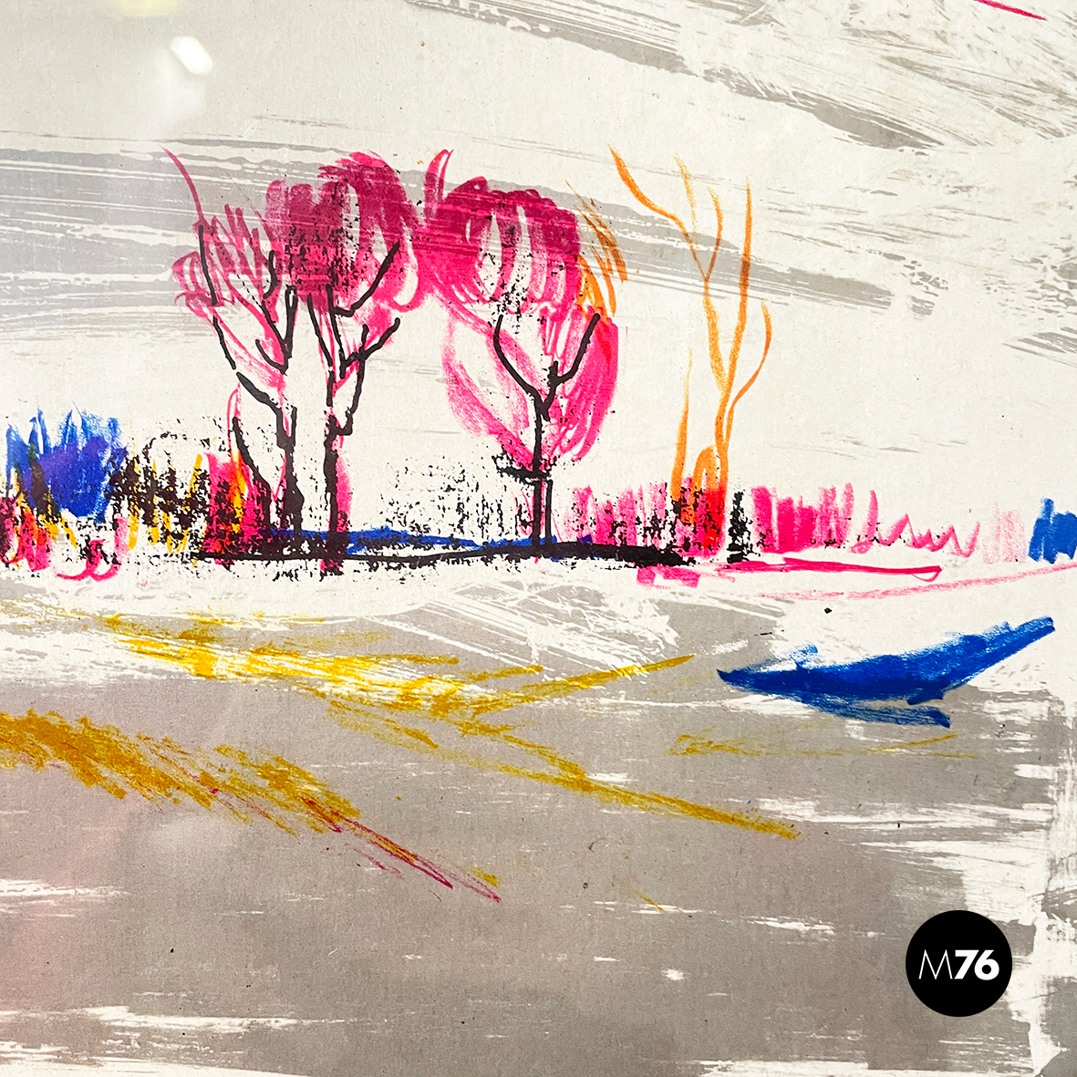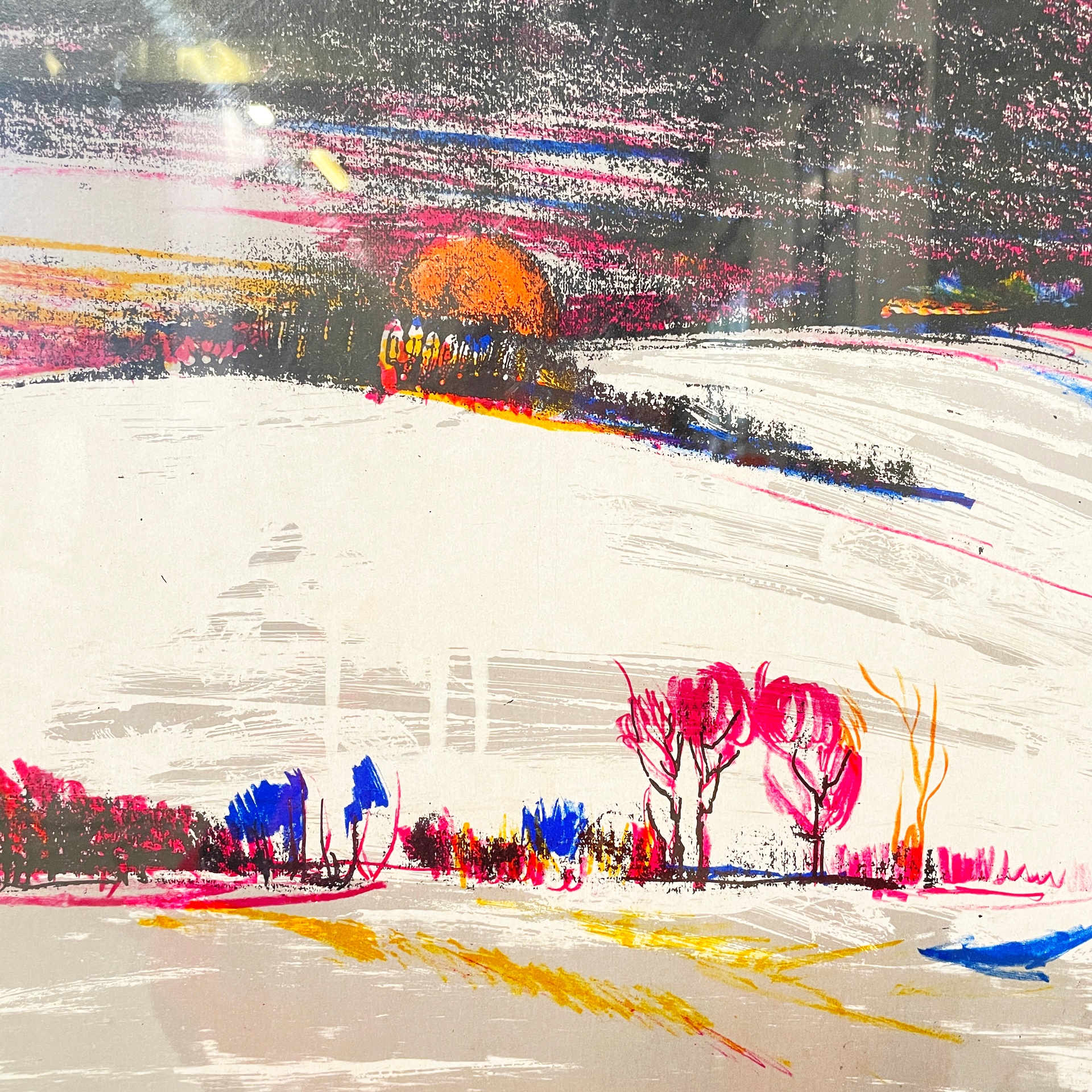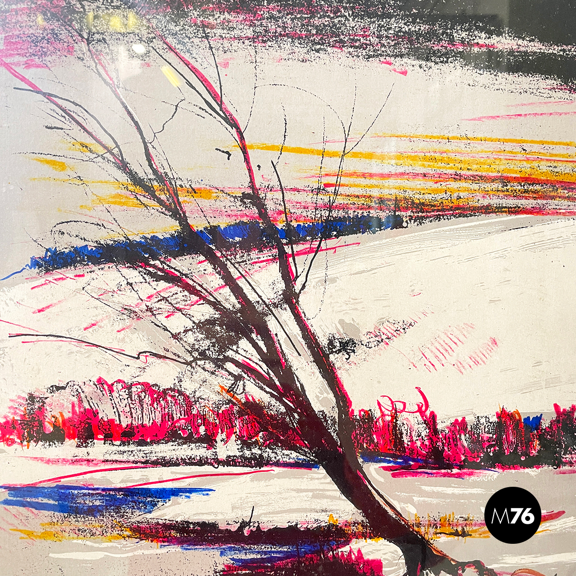 Stampa litografica su carta raffigurante un paesaggio invernale con pochi alberi al tramonto. I colori spaziano tra il giallo il rosso magenta il blu il grigio e il nero. In cornice metallica.