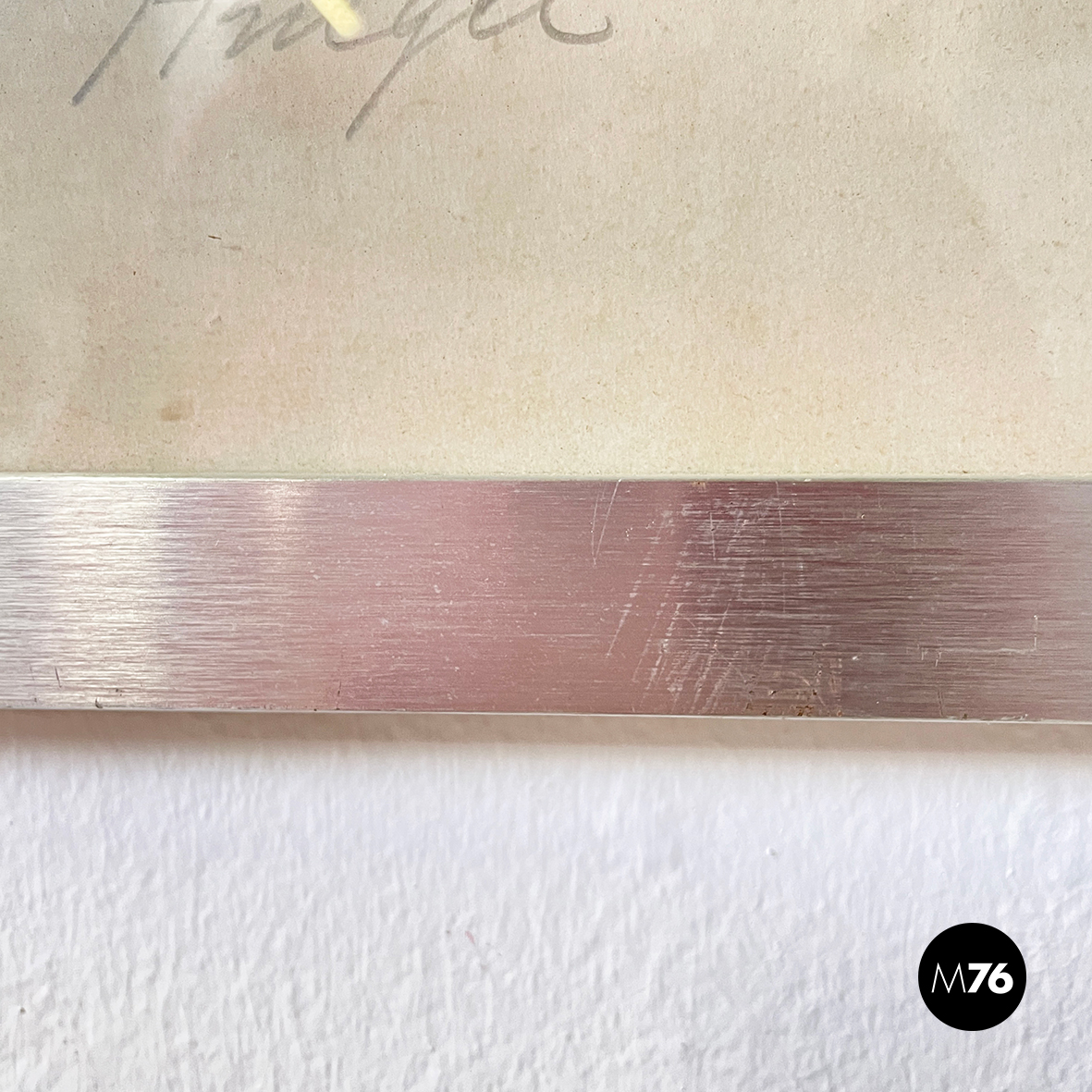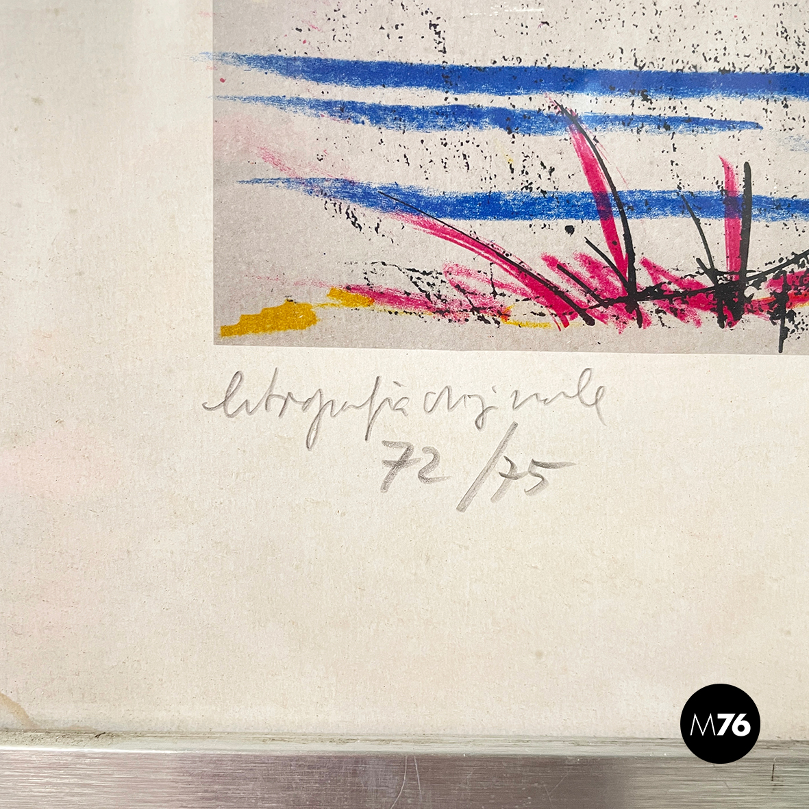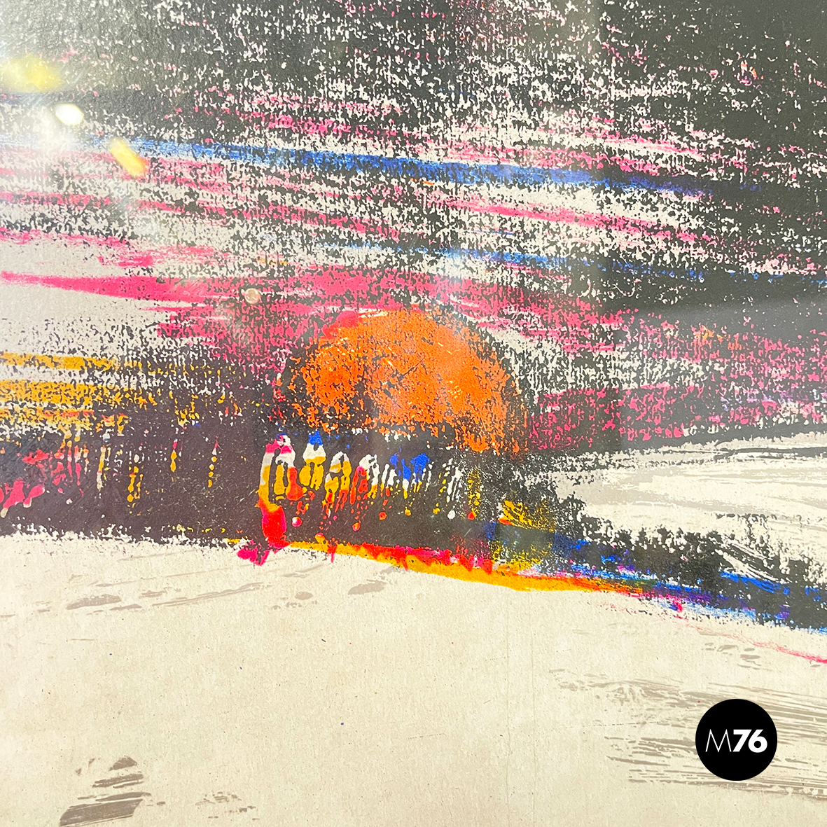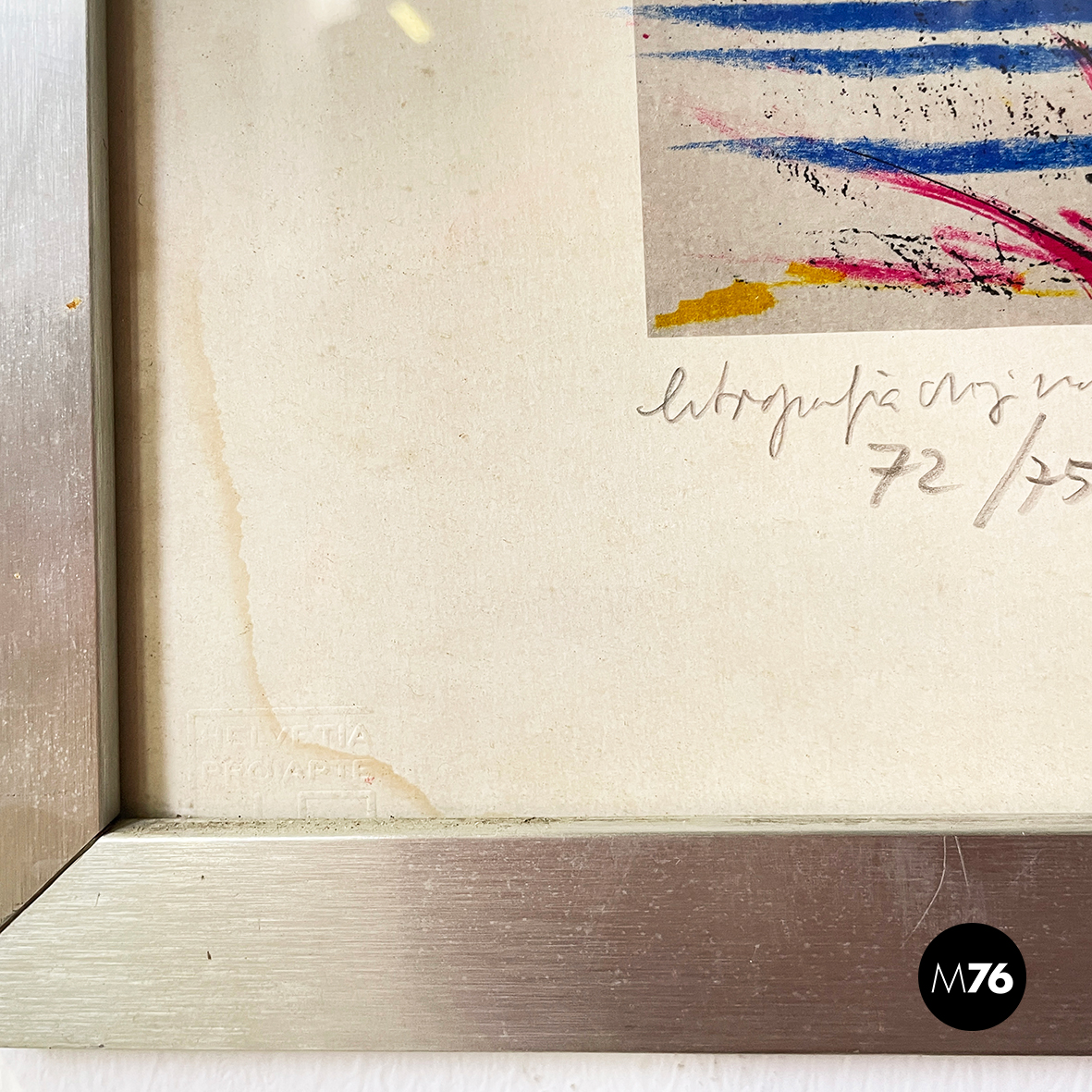 Stampa litografica su carta raffigurante un paesaggio invernale con pochi alberi al tramonto. I colori spaziano tra il giallo il rosso magenta il blu il grigio e il nero. In cornice metallica.