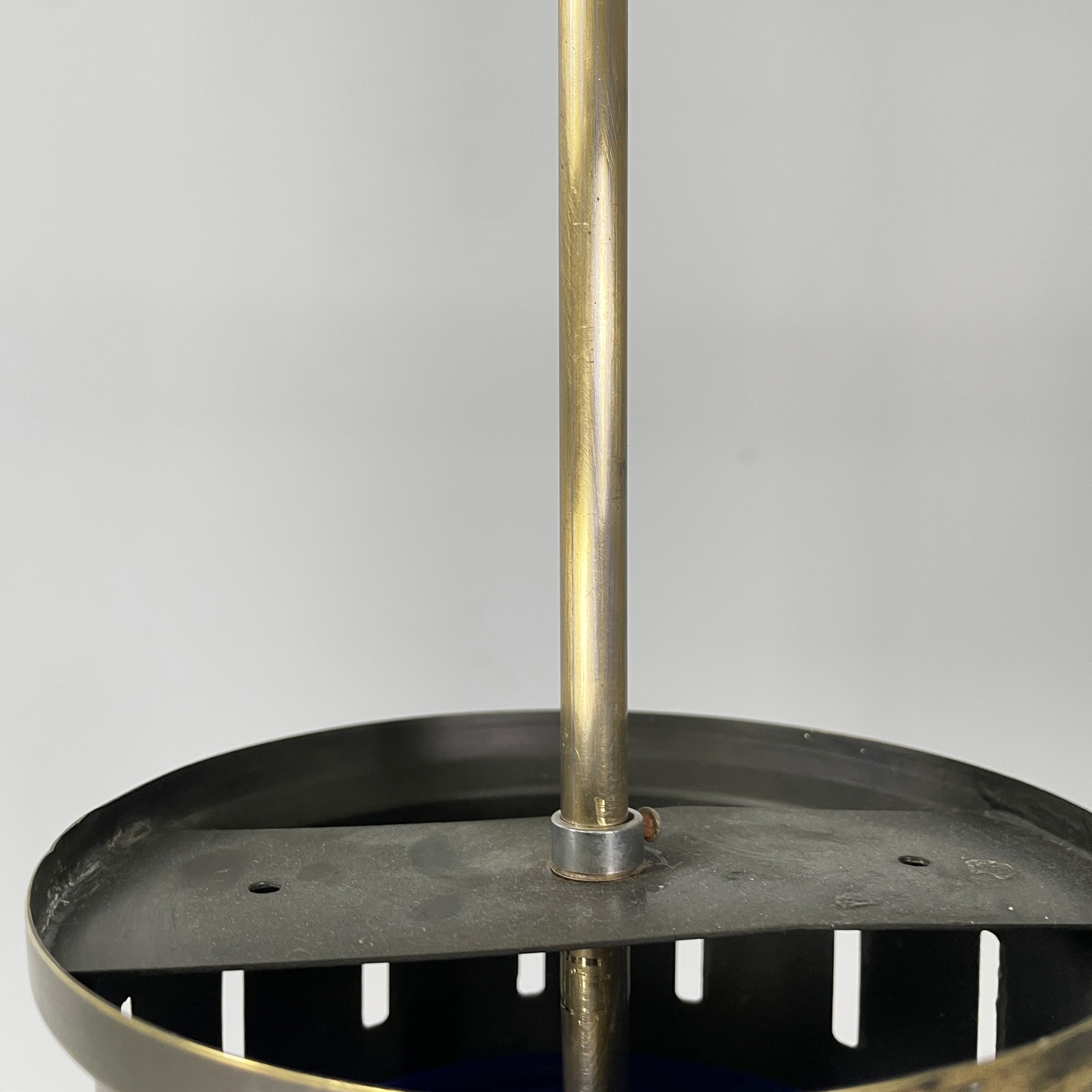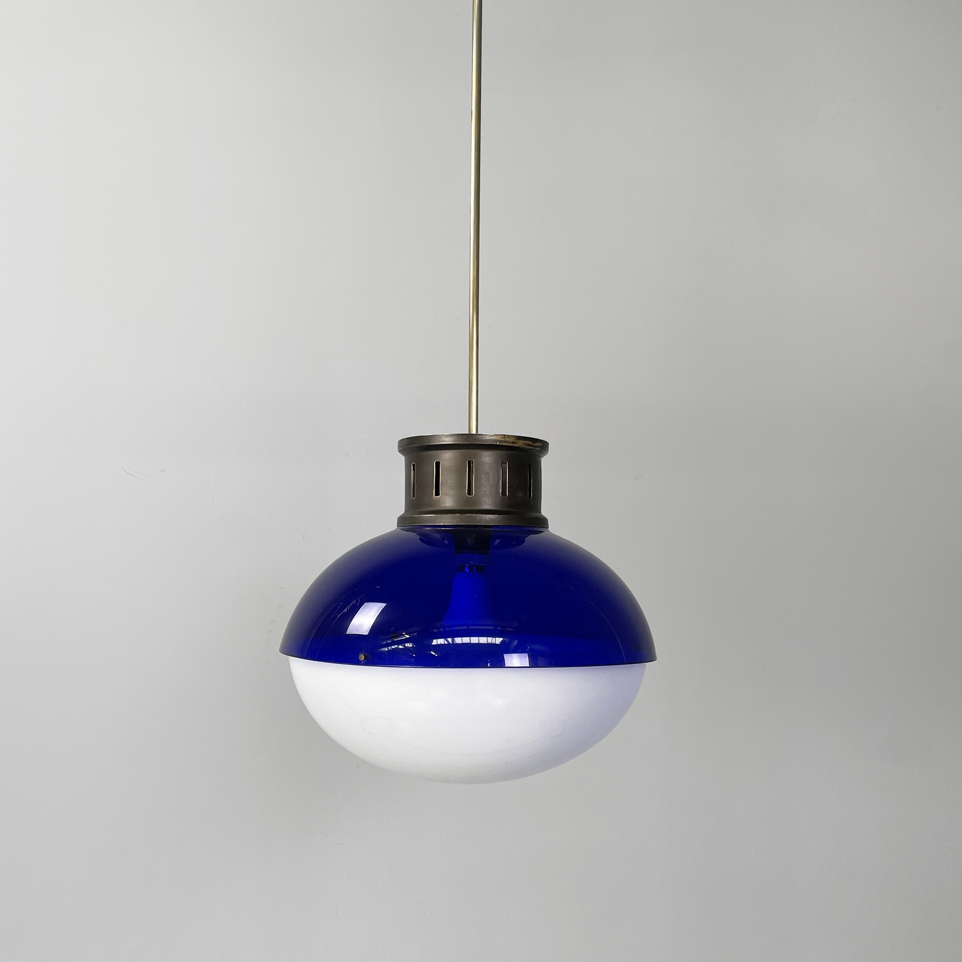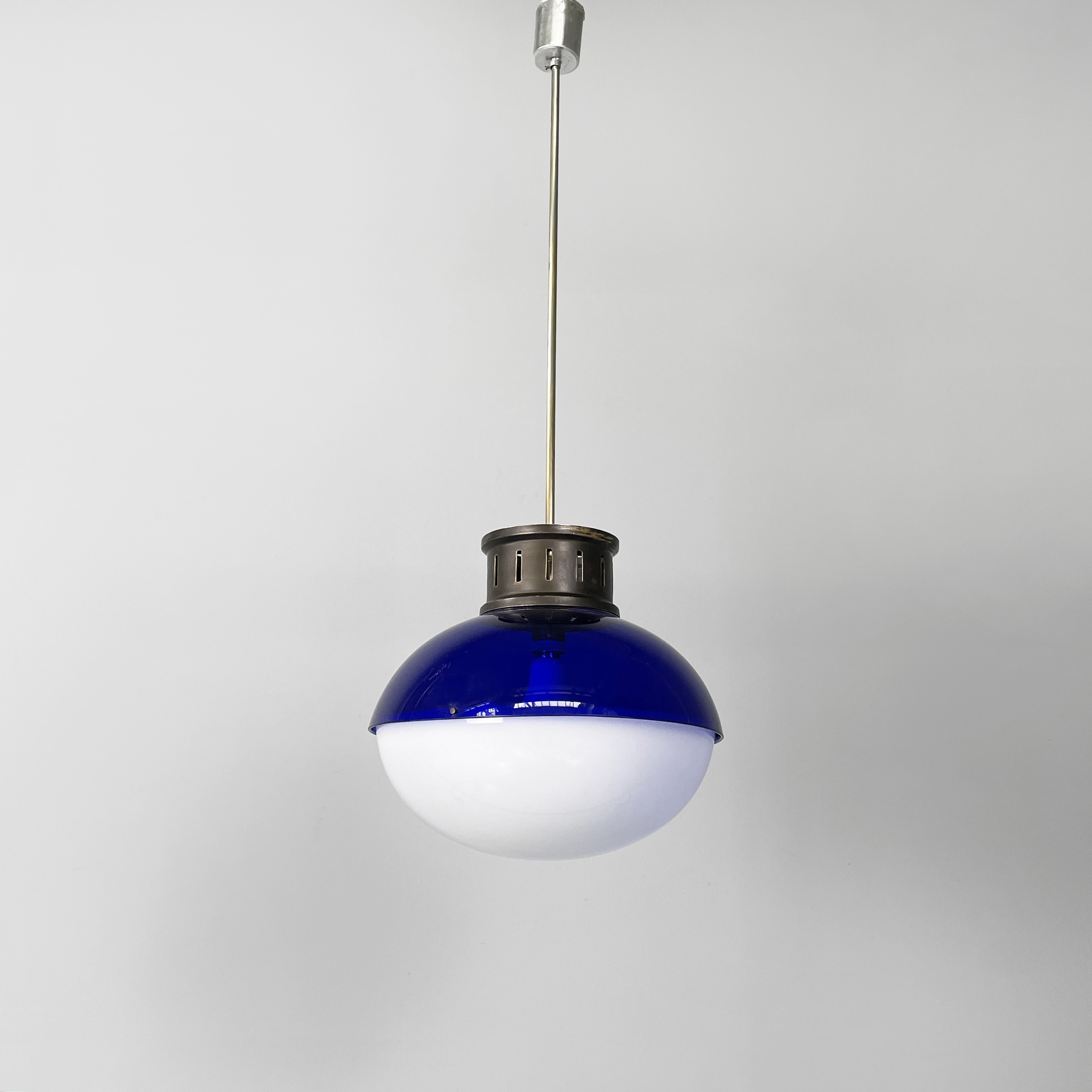 Chandelier or ceiling lamp with round diffuser composed of two semi-spherical parts in blue plexiglass and white plexiglass. The two parts are joined by brass screws. In the upper part of the diffuser there is the cylindrical attachment to the rod structure both in burnished brass. Ceiling attachment in plastic with silver finish. Space Age.