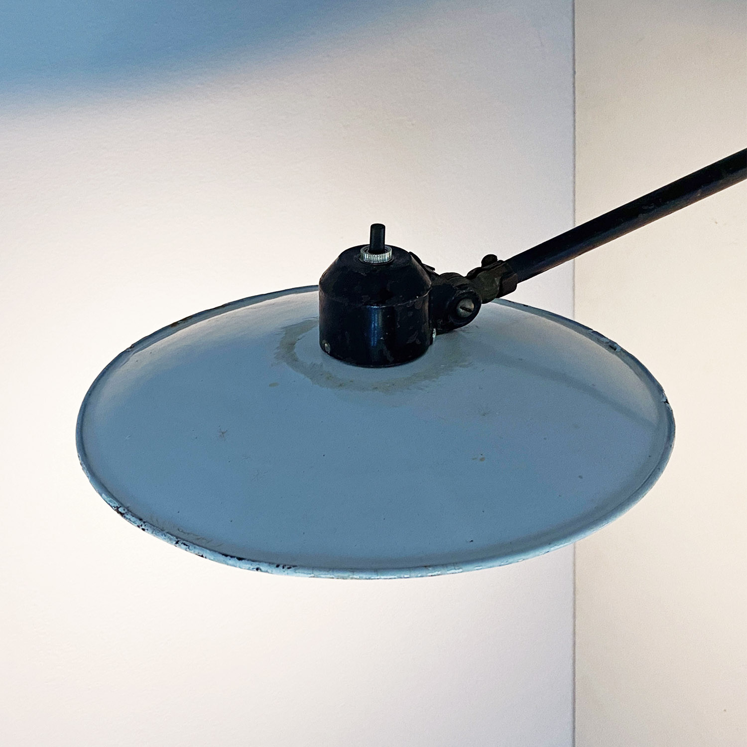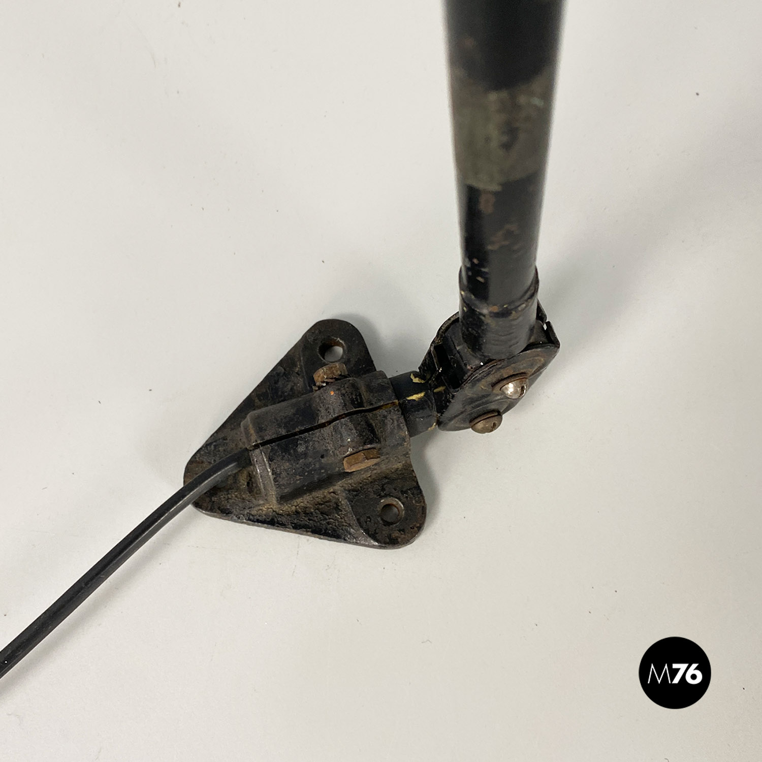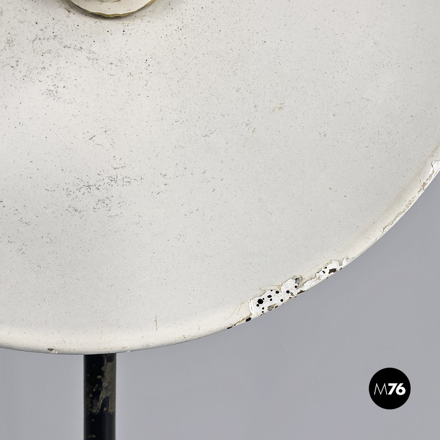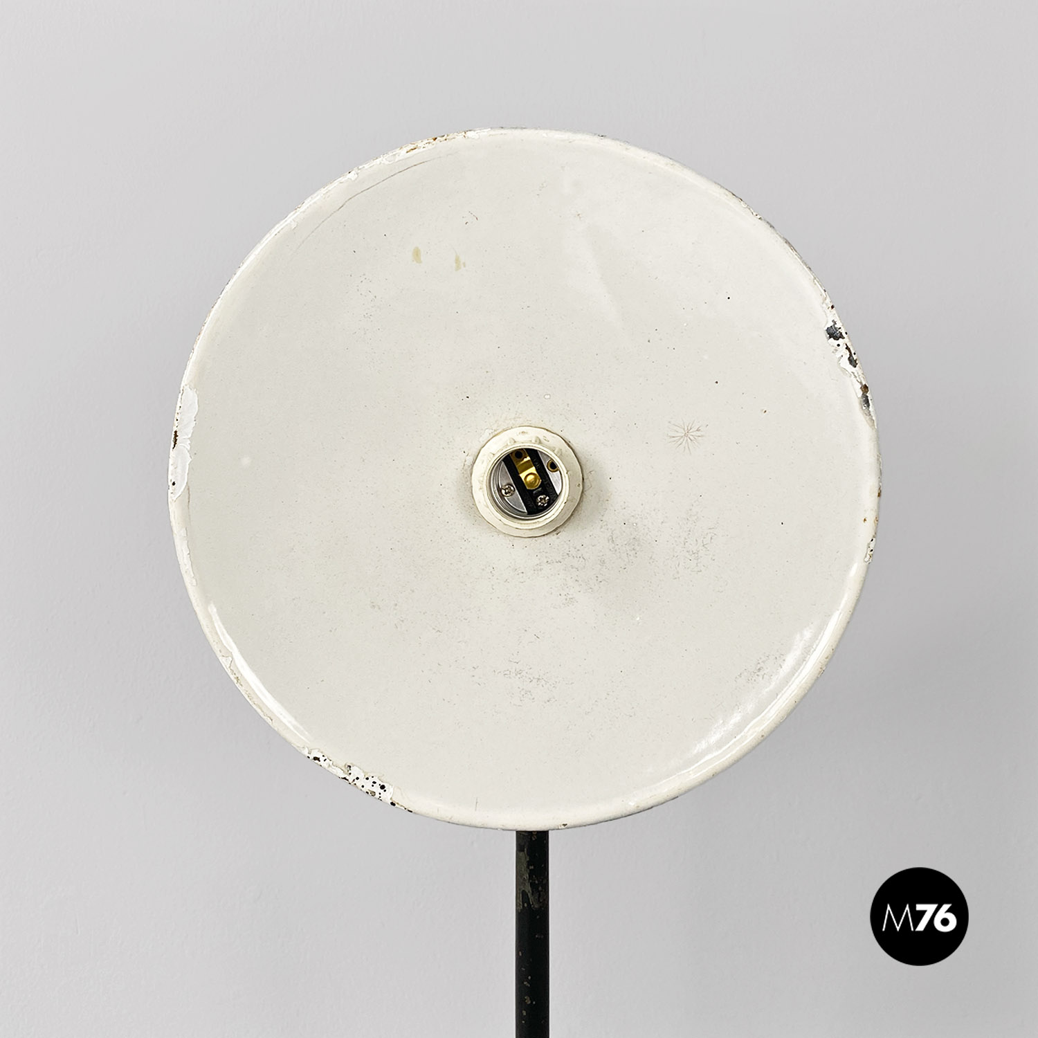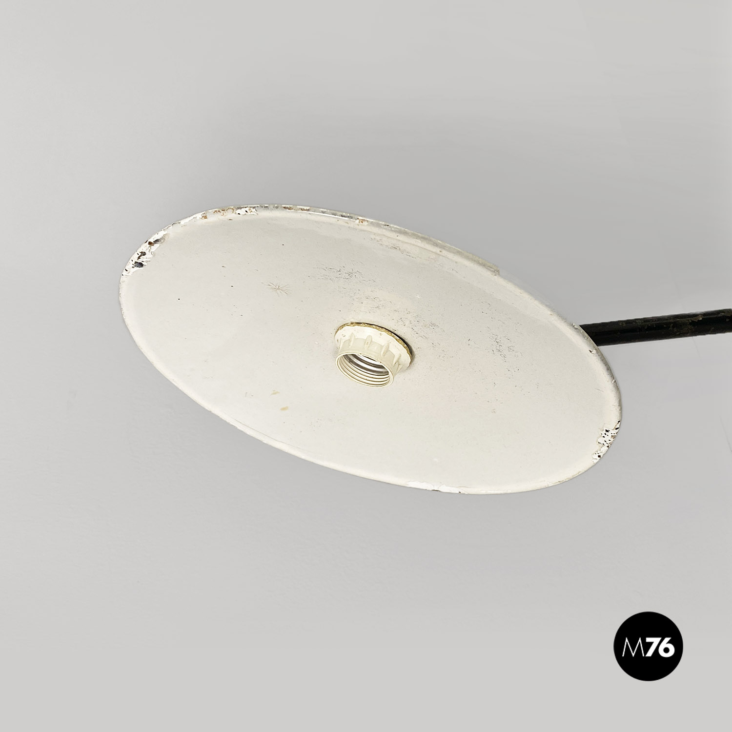 Lampada da parete a braccio con struttura e stelo direzionabile in metallo nero con supporto per fissaggio a muro provvisto di tre fori e di uno snodo utile a direzionare il braccio metallico. Presente un secondo snodo con doppio movimento in corrispondenza del portalampada dove è posto un diffusore metallico bianco di forma tonda.
